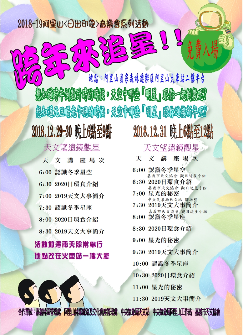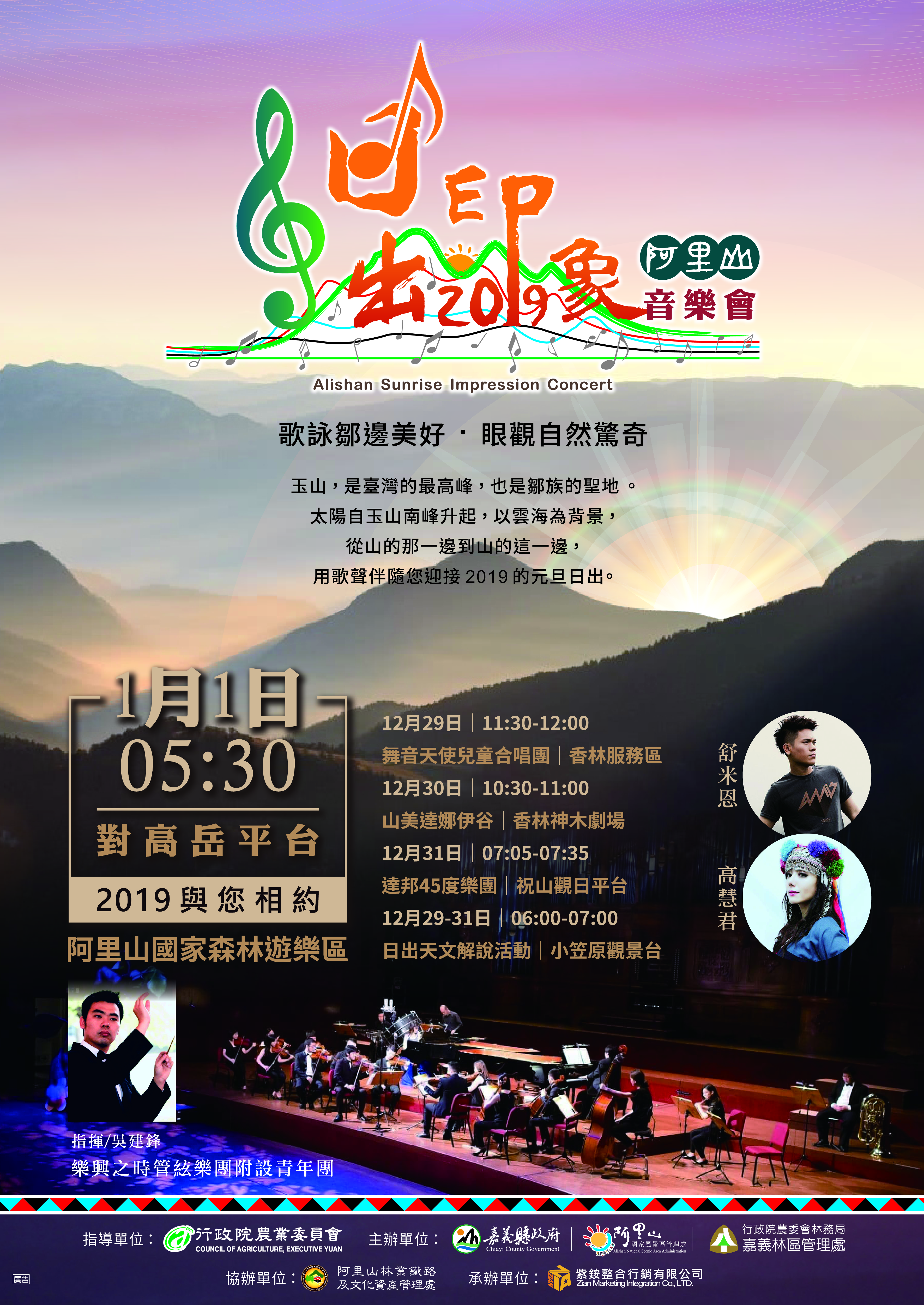 全台迎接新年第一道曙光,阿里山國際音樂饗宴即將登場!2019元旦的清晨,於阿里山國家森林遊樂區對高岳觀日平台將辦理第 17 屆「阿里山日出印象音樂會」,主題為「歌詠鄒邊美好,眼觀自然驚奇」,除了聆聽音樂會外,同時呈現阿里山生態特色與人文的美好給大家,現場布置充滿鄒族文化背景的裝置藝術,由在地原住民藝術家將鄒族部落意象融入自然,帶給大家視覺上的享受。 配合今年的元旦假期,從12/29日起連3天在阿里山國家森林遊樂區內的香林服務區、香林神木劇場及祝山觀日平台各有1場小型的音樂會,邀請到阿里山鄒族舞音天使兒童合唱團、山美達娜伊谷及達邦45度樂團帶來精采演出,帶大家認識與欣賞鄒族好聲音;同時連續3天早上5時至7時,於小笠原觀景台由嘉義市天文協會進行日出前的天文現象進行解說活動,嘉義市天文協會與氣象局也會在12月31日晚上6時起,在阿里山火車站2樓進行觀星活動,陪大家一起跨年。 今年的日出印象音樂會,嘉義林區管理處除了與嘉義縣政府、阿里山國家風景區管理處共同合辦外,也首次與觀光局及氣象局共同辦理三地連線迎曙光活動。阿里山日出印象音樂會主場活動今年邀請鄒族美聲歌手高慧君,阿美族創作歌手舒米恩,搭配樂興之時管絃樂團附設青年團配合著當天的環境氛圍,隨著鄒族長老的祈福儀式,共同演出描述山林與人文交織的歌曲。現場也有臉書打卡、加入LINE@等抽獎活動,讓大家可以和親朋好友分享之餘,還有機會獲得活動限量阿里山森活手帳、阿里山日出印象觀日眼鏡與日出印象音樂會暖暖圍巾毯,要讓民眾帶回阿里山日出印象音樂會難忘的回憶。 元旦當天,搭配觀光局「福仙山三地迎曙光連線活動」,在阿里山日出印象音樂會活動還可以同步看到三仙台及福隆日出的情形,由三地主辦單位觀光局周永暉局長、氣象局葉天降局長及林務局林華慶局長透過視訊方式跟三地的現場民眾與電視機前的觀眾打招呼! 阿里山日出印象音樂會舉辦地點位於海拔 2400 多公尺的高山上,每年辦理音樂會時溫度都落在個位數,主辦單位提醒前來參與的民眾一定要做好保暖準備,現場也會免費提供暖暖包及黑糖薑茶,讓民眾在冷冷的清晨能夠感受到主辦單位帶給大家的溫暖心意。也建議大家上山盡量多搭乘大眾運輸工具上山,避免疲勞駕駛與車輛壅擠,影響了出遊的心情。當日園區內如果停車空間已滿,會從元旦凌晨3時開始,針對停車在園區外的遊客進行接駁,台18線90至95K處,總共會有10個接駁站,供大家往返使用。另外,請上山的民眾,務必睡眠充足,養好精神再開車或騎車下山,開開心心出門,平平安安回家。 主辦單位嘉義林區管理處誠摯邀請大家一同來參與「2019阿里山日出印象音樂會」,離開喧囂的城市,來到阿里山上感受這場與大自然共同譜出的高山音樂饗宴,欣賞全台灣最壯麗的日出,在元旦第一道曙光的祝福下,充滿更多力量與希望,迎向嶄新的一年!更多詳情可搜尋「阿里山國家森林遊樂區」粉絲專頁!