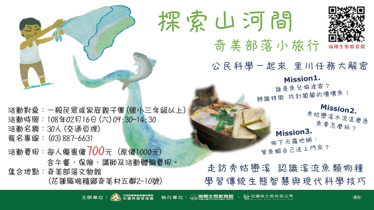 林務局花蓮林區管理處所經營的瑞穗生態教育館將於108年2月16日(六)上午09時30分舉辦【探索山河間-奇美部落小旅行】活動,邀請大家走進奇美部落一同感受台灣山川的奧妙,實地探訪奇美部落旁秀姑巒溪流域生態,體驗奇美部落與生態共好的傳統文化與智慧。 奇美生態智慧王 奇美部落擁有秀姑巒溪跟海岸山脈豐富的自然資源,造就當地深厚的生態文化,例如:部落族人能夠準確地判斷出魚群的位置,拋出八卦網就可滿載而歸;也能洞悉魚蝦的習性,運用魚筌來捕捉牠們;而看似奇貌不揚的植物,其實都是奇美部落的珍寶,如海金沙(阿美族語Kiwit)可當作繩子來綁木頭;簡單摺疊的檳榔葉鞘再加以固定就可成為石頭火鍋的鍋具,奇美部落可說是傳統生態智慧的知識寶庫! 走讀秀姑巒溪 品嘗里山好滋味 本次小旅行將由部落講師帶領大家從奇美部落漫步至秀姑巒溪畔,從中了解當地的生態環境與自然資源,撿拾麥飯石、認識八卦網、放置魚筌。中午用餐時還能透過部落廚房的佳餚一飽眾人的口福,感受大自然賦予人們的恩惠唷~ 花蓮林區管理處瑞穗生態教育館【探索山河間-奇美部落小旅行】活動優惠價為每人新台幣700元整(原價1000元,含餐費、保險費、講師費、活動體驗等費用)。將於108年01月30日(三)中午12點開放網路及電話報名。詳細資訊歡迎至瑞穗生態教育館臉書粉絲專頁(https://www.facebook.com/rsecology)瀏覽或洽報名專線:03-8876631(開館時間:週三至週日,上午9點至下午5點)。