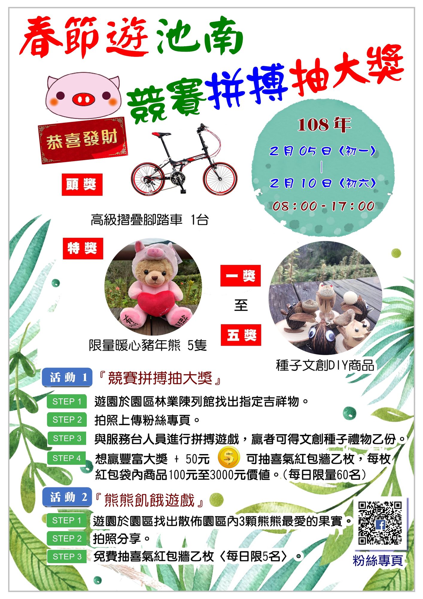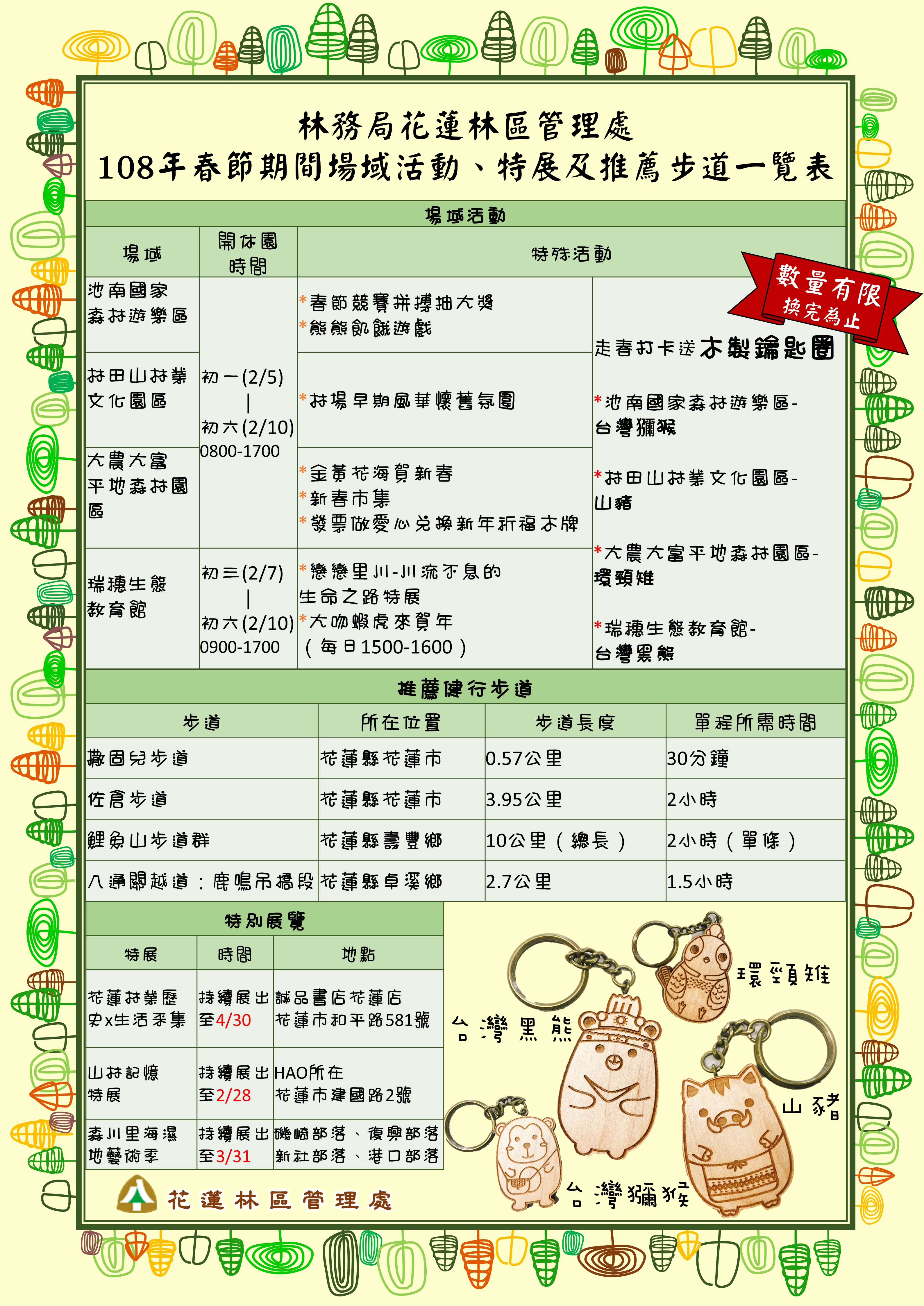 歡迎來池南國家森林遊樂區、林田山林業文化園區、大農大富平地森林園區、瑞穗生態教育館、轄內步道群走春 一、開休園公告 為迎接2019年新春佳節,花蓮林區管理處轄屬池南國家森林遊樂區、林田山林業文化園區及大農大富平地森林園區僅除夕(2月4日)當天休園外,農曆春節連續假期不打烊,每日8時至17時開放遊客參觀服務,惟玉里野生動物保護區瑞穗生態教育館除夕至年初二休館,年初三起開放參觀。 二、走春打卡送好禮 配合豬年春節氣氛,年初一(2月5日)開始,在池南國家森林遊樂區(台灣獼猴與台灣黑熊)、林田山林業文化園區(山豬)、大農大富平地森林園區(山豬與環頸雉)及瑞穗生態教育館(山豬與台灣黑熊)與吉祥物合照,集滿吉祥物後在以上景點臉書打卡、附上一句與森林有關的吉祥話,並到「花蓮林區管理處」Facebook粉絲專頁按讚,即可在以上景點兌換限量木製鑰匙圈1個!每個景點的鑰匙圈皆為該處較有代表性的台灣原生動物造型(池南-台灣獼猴、林田山-山豬、大農大富-環頸雉、瑞穗館-黑熊),數量有限發完為止!另外瑞穗館在年初三(2月7日)才開館,喜歡黑熊的朋友們請注意來訪的時間喔! 三、春節加碼活動 池南走春抽好禮 池南國家森林遊樂區2/5(初一)-2/10(初六),連續6天推初『春節競賽拼搏抽大獎』及『熊熊飢餓遊戲』,於園區找出指定吉祥物就有機會參加抽獎,獎品種類豐富(有超過市價3,000元腳踏車,森林限量版文創-貓頭鷹、可愛小雪人、淘氣松鼠、年年有魚及「有熊森林」…等500項精美禮品,歡迎社區及家庭呼朋引伴參與。活動詳情可洽fb粉絲專頁(https://goo.gl/5YE4ZP),或洽詢服務諮詢專線03-8641594#13。 林田山再現林業風華 林田山林業文化園區陸續完成中山堂、展示館、場長館、服務中心一、二館、木雕館、林場懷舊館、林業生活館、米店及醫務室等,展現林場早期風華,林場懷舊館、林業生活館、米店醫務室及服務中心二館更獲得行政院農業委員會優良農建工程獎殊榮。 大農大富花海美不勝收 大農大富平地森林園區建置約13公里林間自行車道,配合農曆假期完成花東地區單一面積最大的金黃花海(約11公頃)營造,另花海附近設立春節市集,春節期間不打烊,入園遊客可以填飽肚子和購買森林手作藝品,也能添購在地特色伴手禮,到園區除了到花海欣賞景致外,也可到服務中心用3張發票換取新年祈福牌(限用發票日期為107年9、10月後發票),歡迎共襄盛舉做愛心,花蓮林區管理處誠摯邀請各位鄉親朋友,利用春節連續假期前往體驗森林之美,感受自然響宴。 瑞穗生態教育館 瑞穗生態教育館目前展出「戀戀里川-川流不息的生命之路」特展,以秀姑巒溪及其週邊社區的「里川」生產地景為主體,富含豐富的原住民文化生態智慧。從2月7日(初三)開始,推出春節特別任務「大吻蝦虎來賀年」,每日15:00-16:00,只要完成春節任務:拍照、打卡、按讚,並Tag瑞穗生態教育館,出示給館內人員確認後,即可獲得台灣特有種-大吻蝦虎的紙雕,進行現場DIY活動,限量50份,送完為止。館內亦提供約50部左右的生態影片,供民眾挑選於館內觀賞。 四、推薦健行步道 推薦闔家親子走春健行步道,撒固兒步道、佐倉步道、鯉魚山步道、八通關越道:鹿鳴吊橋段,也能在春節期間走進森林中享受芬多精、負離子的洗禮,步道沿線蟲鳴鳥叫,生態極為豐富,處處都是驚喜。 五、特別展覽 花蓮林業歷史特展 花蓮具有豐厚的林業文化歷史,林管處特於誠品書店花蓮店規畫生活采集花蓮山林篇及縱谷篇,山林篇展示哈崙、嵐山工作站珍貴林業文物,縱谷篇展出花蓮處輔導的五個里山部落的農產品。展期自即日起至4月30日止。 「山林記憶特展」於花蓮市區的「HAO好所在」文化生活空間(花蓮市建國路2號)展出,展期至108年2月28日,讓更多民眾能夠瞭解到花蓮山林的發展歷史。在展覽期間,將定時於下午14:00撥放紀錄片《在森林中。嵐山工作站》;現場也將同步販售《森林·部落·人─太魯閣林業史》等林業史蹟地調查與研究專書。花蓮林管處熱情邀請民眾一起透過展覽,穿越山林的記憶,一窺花蓮珍貴的林業發展歷程。 森川里海藝術季 「2018森川里海濕地藝術季」,自石梯坪的藝術基點向北延伸到復興、新社、磯崎共有國內外13組藝術家創作13件作品,春節期間,也別錯過展期至108年3月31日止,請提早規劃與家人好友一起走向森川里海藝術季並體驗部落文化。 春節期間如遊客需要旅遊景點資訊服務,請電洽 : ◎ 池南國家森林遊樂區 8641594#13 ◎ 林田山林業文化園區 8752100#9 ◎ 大農大富平地森林園區 8700870#9 ◎ 瑞穗生態教育館 8876631