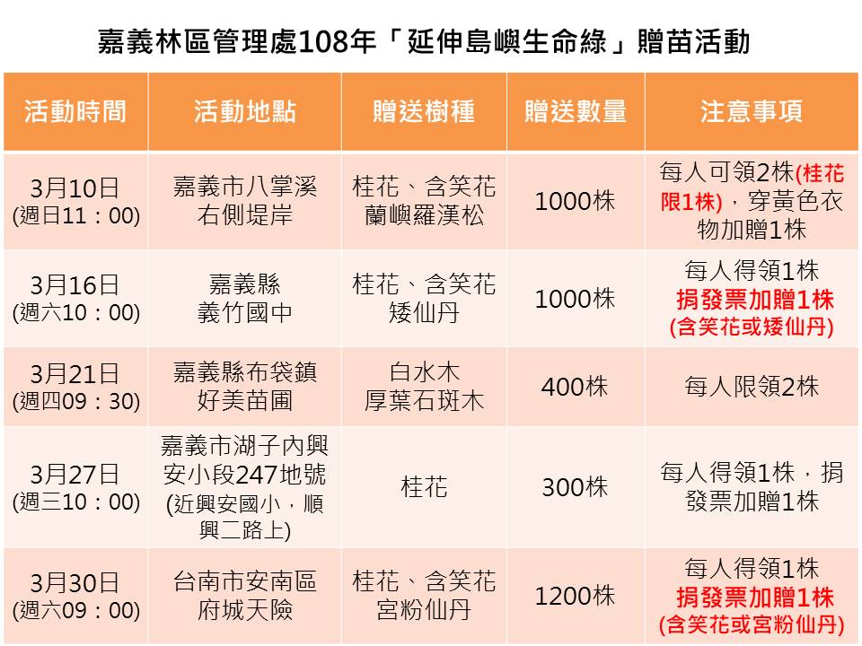林務局嘉義林區管理處為辦理植樹月「延伸島嶼生命綠」主題,與嘉義縣市及台南市政府合作於3月舉辦5場贈苗活動,預計送出約4,000株苗木。贈苗時間訂於3月10日(星期日)上午11時起在嘉義市八掌溪右側堤岸,嘉義市政府「黃花瘋市集」活動現場贈送桂花、含笑花及蘭嶼羅漢松等計1000株苗木,活動當日每人可領2株苗木,穿黃色衣服或褲子的民眾可再多領1株,苗木送完為止。 嘉義林管處張岱處長表示,樹木具有淨化空氣、調節氣候、涵養水源等功能,同時提供野生動物的生活空間,透過植樹月贈苗活動鼓勵更多民眾加入環境綠美化的行列,讓綠意延伸至你我家園。 嘉義林管處植樹月贈苗活動地點尚有3月16日(星期六)於嘉義縣義竹國中;3月21日(星期四)於嘉義縣布袋鎮好美苗圃;3月27日於嘉義市湖子內興安小段247-1地號;3月30日於台南市安南區府城天險等4場次,分別贈送桂花、含笑花、矮仙丹、宮粉仙丹、白水木及厚葉石斑木等計3,000株苗木,部分場次尚有國產材推廣、除蔓種樹綠經濟、國土綠網和里山、創意DIY、廉結島嶼生命綠等攤位歡迎民眾親自體驗。貼心提醒,各場次活動細節及贈苗樹種略有差異,詳情可洽嘉義林管處(電話05-2787006#374 黃小姐)詢問。