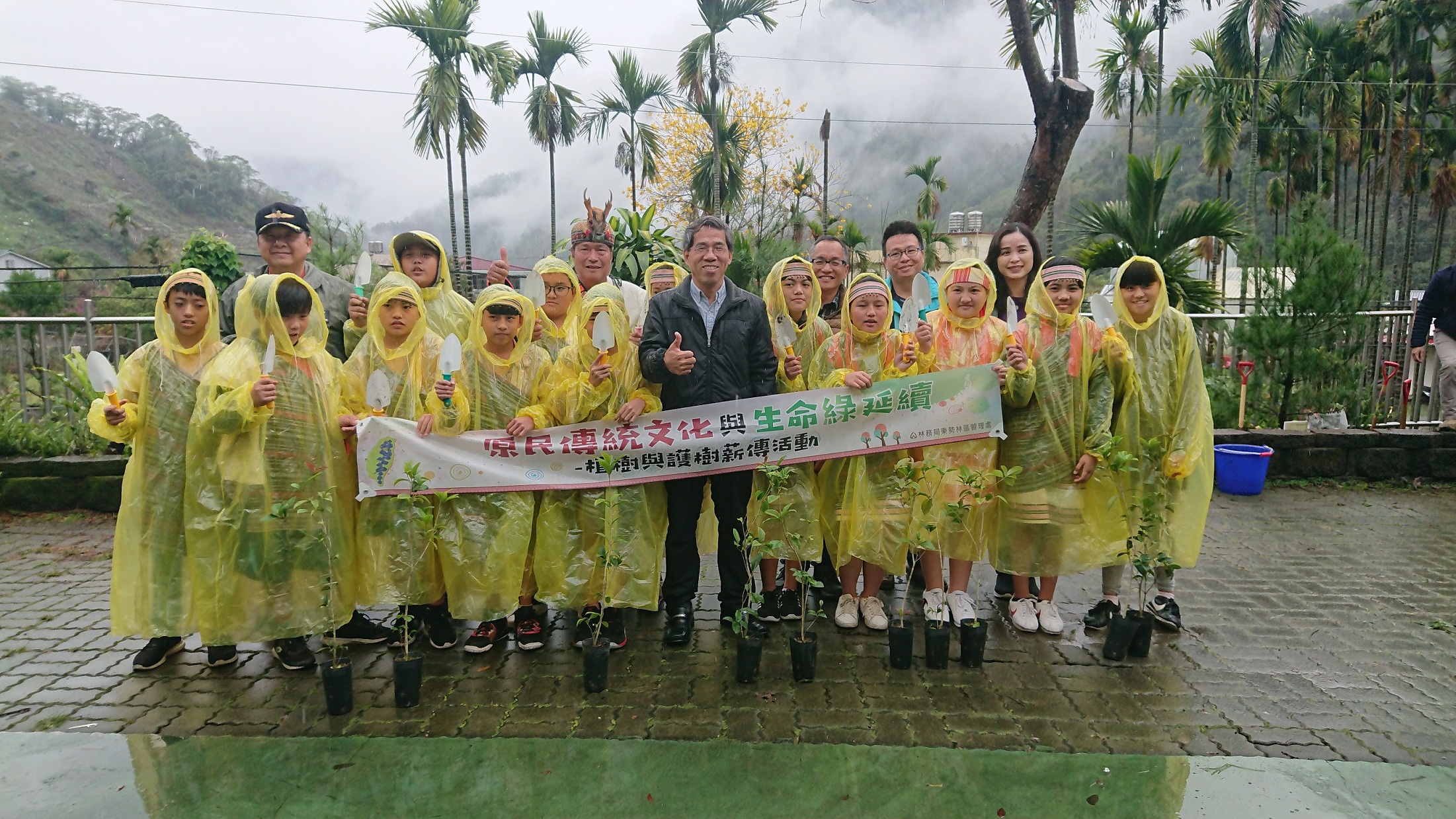 東勢林區管理處為延續原住民傳統山林智慧及延伸台灣島嶼生命綠,特別於108年3月8日與台中市政府及博屋瑪國小共同辦理「原民傳統文化與生命綠延續」植樹暨護樹薪傳活動,雖然天空持續飄雨但仍澆不熄學生及居民植樹熱情,現場由東勢林區管理處處長蕭崇仁、博屋瑪國小校長比令亞布、臺中市政府農業局林務自然保育科科長徐宏銘、和平區區長林建堂、原住民族事務委員會專門委員林啟正、達觀里里長陳振福及達觀部落頭目陳榮爵等貴賓,帶領大家種下近百株山胡椒、山棕等原住民傳統植物。 今(3/8)日的植樹活動在博屋瑪國小及當地原住民傳統歌舞表演中展開,博屋瑪國小校長比令亞布當場高歌泰雅族傳統歌謠來歡迎大家的到來,特別介紹博屋瑪代表孕育、傳承、興旺三種意涵。此外,由部落耆老進行感恩祈福儀式,陳榮爵頭目在祈福過程中表示「沒有樹就沒有水,生活最需要的就是水,感謝林務局東勢林區管理處來照顧森林,希望我們部落居民一起和林管處來照顧我們的樹」。博屋瑪國小及達觀部落居民熱情同歡,不畏現場風雨共同種下山胡椒、山棕等原住民傳統植物,齊心打造校內原民文化教學環境,活動中並特別邀請七星環境協會專業講師進行校園樹木健診、土壤改良及護樹教學活動,部落居民紛紛表示獲益良多,活動現場還準備了500株杜鵑、桂花及台灣肖楠,捐發票換樹苗,讓大家帶回家打造綠美化家園同時做公益,學生與居民熱情響應。 東勢林區管理處處長蕭崇仁表示,博屋瑪國小為全台第一所原住民族實驗小學,課程包含泰雅族織布、可食植物認識…等,藉由泰雅族傳統文化傳遞現代知識能力,例如本次種下的「山胡椒」是原住民特色香料,另外「山棕」也可製成掃把等生活用品,希望藉由本次活動凝聚在地力量,共同延續傳統文化及延伸島嶼生命綠。東勢林區管理處3月份還有一系列的贈苗活動,詳細贈苗資訊,歡迎民眾上東勢林區管理處官網最新消息區「108年植樹月贈苗活動場次資訊」查詢。