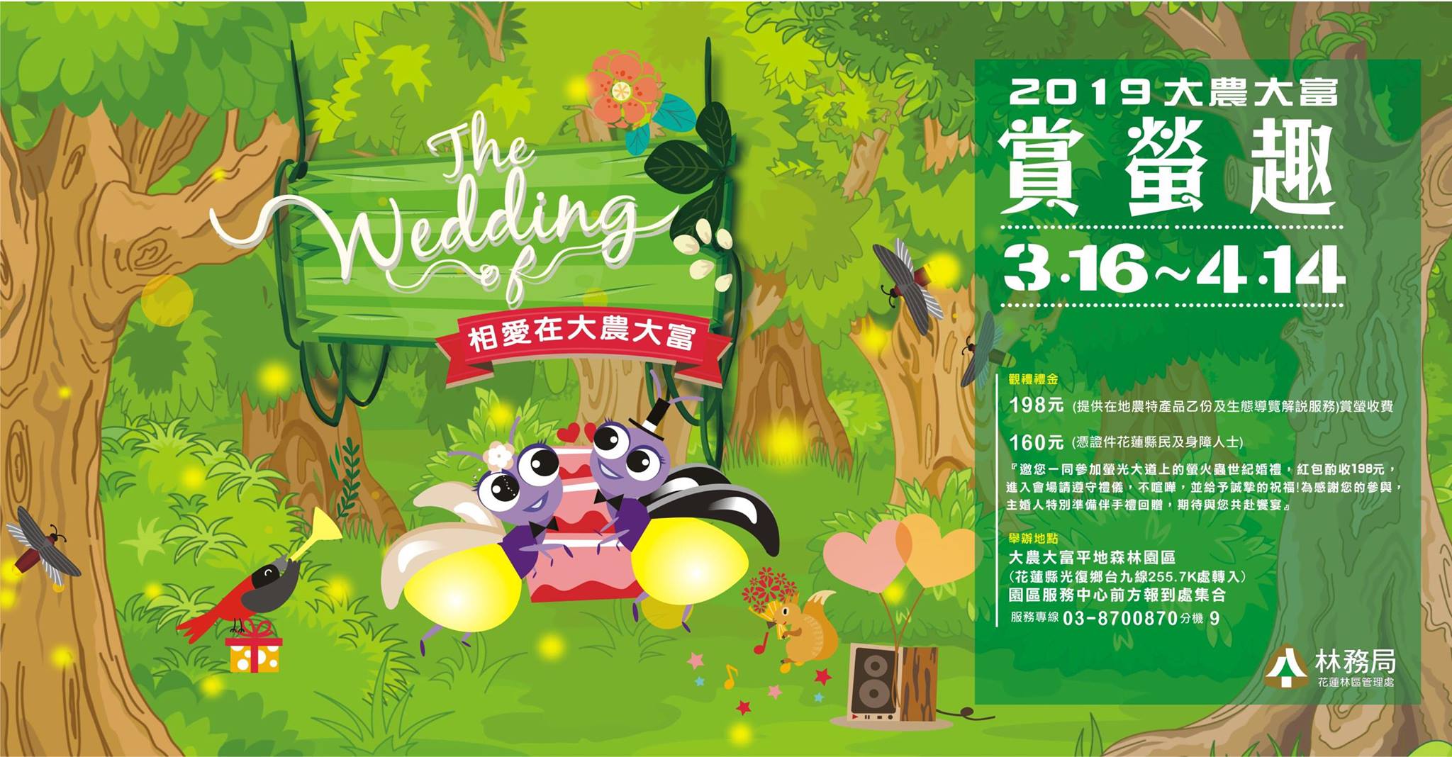 大農大富平地森林園區一年一度的「賞螢季」活即將要開始啦!本次的賞螢主題為「螢火蟲的世紀婚禮」,花蓮林管處特別在賞螢季開幕日3月16日至3月17日,當天規劃了一系列的活動,包含有開幕音樂會、希柏森林小市集、親子螢火蟲DIY體驗,加上夜間的重頭戲世紀婚禮賞螢活動,邀請民眾一同來感受大農大富獨有的春日魅力。 2019大農大富賞螢趣活動以相愛在大農大富螢火蟲婚禮為主題,開幕活動也將以清新的婚禮派對的模式來規劃辦理,讓現場的民眾參與見證螢火蟲的世紀婚禮。開幕活動並邀請花蓮文青市集團隊「希柏市集」聯名辦理希柏森林小市集,讓民眾享受大農大富平地森林生態之美的同時,更可以認識花蓮獨有的藝文能量,以及花蓮在地優質的手作產品,希望藉由特色的活動包裝宣傳,讓賞螢活動能夠有不同的創意和帶給民眾感新的感受。花蓮林管處楊瑞芬處長表示:「這次開幕活動就是要讓來訪的民眾能有身、心、靈上的療癒。透過漫步於自然森林環境、文創藝術的薰陶,讓來參與螢火蟲世紀婚禮的每一位民眾,都能夠從『心』感受到幸福!」 螢火蟲的生命週期約為一年,而成蟲的時間約僅有一至兩周,在這短短的時間之內,螢火蟲透過散發出美麗的光芒來尋找配偶,也成為大農大富平地森林絕美的春日夜間婚禮。而花蓮林管處持續與花蓮糖廠攜手合作,努力復育大農大富平地森林的環境棲地外,也陪伴周邊社區進行導覽解說人才培訓,就是要好好舉辦螢火蟲的年度婚禮。 2019年度的大農大富賞螢季活動從3月16日至4月14日,為維護螢火蟲的棲地生態,賞螢活動採總量管制,因此想參加賞螢活動的民眾可至Accupass活動通線上購票頁面事先報名。賞螢季活動費用為198元,費用包含專業的導覽解說外,來參與的民眾還能拿到一份社區伴手禮,把螢火蟲世紀婚禮的「幸福感」帶回家! 大農大富賞螢季活動為全台最早、面積最大,也最容易到達的賞螢勝地。賞螢季現正受理報名,歡迎大家踴躍參與,活動訊息如下: 1.活動時間:108年3月16日至4月14日 2.活動地點:大農大富平地森林園區 3.每日活動梯次: (1)第一梯次:18:30-19:30 (2)第二梯次:19:30-20:30 (3)第三梯次:20:30-21:30 4.管制人數:平日(周一至周五)800人/日 假日(週六至周日,包含連續假期)1200人/日,額滿為止。 5.活動費用:每人新台幣198元。(2歲以下嬰幼兒不收費) 縣民社福價160元。(憑花蓮縣民身分證,與身障人士相關證件。) 費用包含導覽解說與在地社區伴手禮,伴手禮將視當日活動現場發放。 6.報名方式:請事先於網路報名及付款。 Accupass活動通 報名網頁 7.活動頁面:「2019大農大富賞螢趣」臉書粉絲專頁。賞螢活動的相關訊息將不定期放在粉絲專頁上分享。 臉書粉絲專頁:(相關連結效期已過) 有任何疑問,歡迎來電洽詢大農大富平地森林園區(03)870-0870#9 8.賞螢專車預約: 提供賞螢遊客由花蓮市直達大農大富平地森林園區來回之專車,來回車票價格:每人新台幣250元。 需事先上BeClass網站預約 (1)報名人數 #需滿18人開中巴。報名未滿18人不開! (2)報名人數 #需滿30人開大巴。報名未滿30人不開! 有乘車需求的遊客,若有任何問題,皆可聯繫花蓮縣平森永續發展協會/03-8811878及明利旅行社/03-8466898 9.3月16日-17日螢火蟲婚禮開幕活動流程: 3月16日 螢火蟲婚禮開幕活動 3月16-17日 森林小市集活動 時間 主要活動 時間 主要活動 15:30-16:00 螢火蟲世紀婚禮 婚禮開幕 15:00-15:00 市集活動開始 16:00-16:40 創作歌手1 16:00-16:30 螢火蟲織品手作DIY 16:40-17:20 創作歌手2 17:00-17:30 螢火蟲織品手作DIY 17:20-18:00 創作歌手3 18:00-18:30 螢火蟲織品手作DIY 18:30-20:30 賞螢活動開始 18:30-20:00 市集活動 備註:活動將視實際表演團體,以及當日的活動執行現況來調整。 森林小市集 攤位名單 餐食類 鵲悅 Magpie 和風洋食餐車 Kiciyang FOOD TRUCK 慶降手作食物車 BOSO 飽所 小小兔子廚房-良食炸物 奇幻地 Coffee Flash 快閃咖啡-手沖咖啡飲品 手作藝術類 HANNA‧Dreamcatcher-啟動夢想、真誠祝福的幸運捕夢網 翼想天開 手作金工飾品 little fish handcraft 手作療癒袖珍小物 mi na zu ki 植物苔球綠手作 5n淋茶米lin cha mi-大禹嶺高山茶 允文手寫藝術字 不惜小厝 邊城女子-手工特色布包 李竺芯 Siri Simran Kaur-東方玉品、種籽創作 看看咖啡小物 花時間蔬果皂 小物ㄟ好所在 彩虹螺旋擊樂社 Rainbow Spiral World Percussion-樂器 Alisa 的豐饒角 公益宣導 台灣兒童發展協會-馬匹輔助教育中心