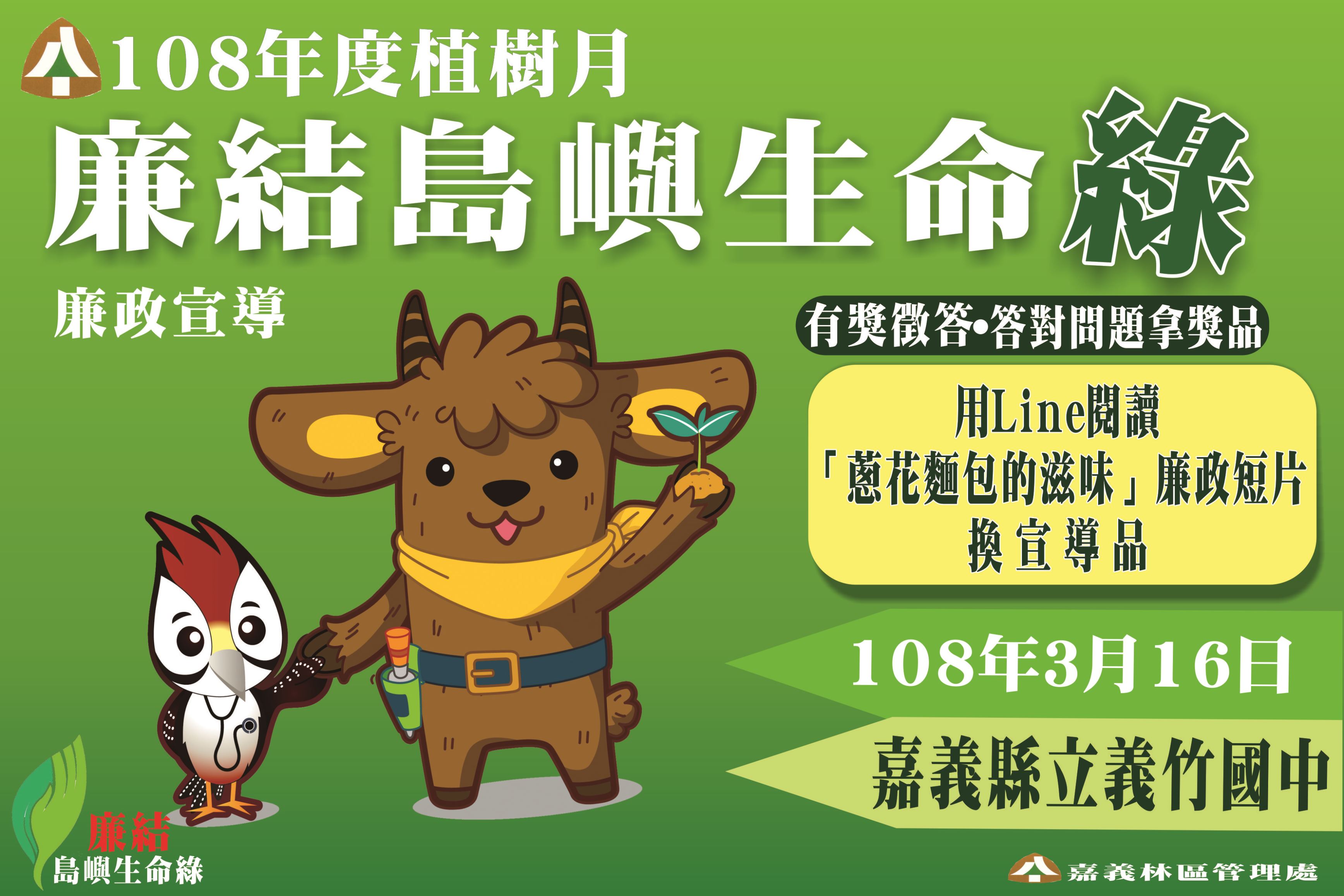 林務局嘉義林區管理處預定於明(16)日上午在嘉義縣義竹國中配合嘉義縣政府辦理108年植樹節活動「大家來種樹 呵護嘉己人」系列活動,響應全球節能減碳風潮,營造綠能低碳休閒空間,呼應在地環境生態議題。提昇民眾環境意識,栽植樟樹,培養民眾愛鄉土、愛地球的意識。呼籲大家一起來種樹愛地球,本此理念對自然與環境、教育與環境關懷之核心精神,辦理「植樹活動」,這是一個全民共同參與的活動,期望藉由民眾對植樹活動與,達到對自然與環境關懷目的,歡迎師生或民眾踴躍參加。 林管處跨域結合法院 廉結島嶼生命綠擴大宣導 林管處政風室表示,為了響應植樹節系列活動,跨域結合臺灣嘉義地方法院共同舉辦「清明法官,親民司法」的廉政宣導活動,擴大辦理廉政宣導活動,內容包括:國民參與刑事審判制度、法院各項便(禮)民措施、倡廉反貪及防範破壞司法信譽等宣導事項,並針對本次宣導主題辦理有獎徵答活動,以增進民眾對宣導主題之認識。 資源共享,發揮整體力量,擴大廉政宣導成效 法院政風室陳惟國主任表示,司法是保障民眾權益最重要的一道防線,法院的業務更是與民眾息息相關,司法透明即是讓民眾信賴司法的有效方式,希望藉由本次活動走進民眾的機會,增進民眾對於法院的認識,拉近民眾與司法的距離,達到「司法為民,親民司法」的目標。 「廉結島嶼生命綠」為主軸 廣邀民眾簽署 林管處108年以「廉結島嶼生命綠」為宣導主軸,提供參加活動師生或民眾簽署,以植樹護林實際行動,結合本次活動主題,讓廉能政府結合島嶼生命綠,亦展現政府提倡廉能之決心。凡來到廉政宣導攤位拍下照片上傳至Facebook並打卡,或在活動現場以「LINE」通訊軟體閱讀法務部廉政署製作「蔥花麵包的滋味」微電影,即可獲得宣導品1份。此外,結合林管處辦理植樹月贈苗活動,適時向參加民眾宣導廉政法規、政府重要施政、現行司法改革、法院各項便民措施等,以激發民眾反貪意識,提昇政府廉潔形象,並希望各界透過廉政署多元檢舉管道、林管處及地方法院相關廉政措施及民眾投訴、檢舉電子信箱、電話,提供建言鼓勵及舉發不法,型塑更清新、更廉潔的林政與司法形象。