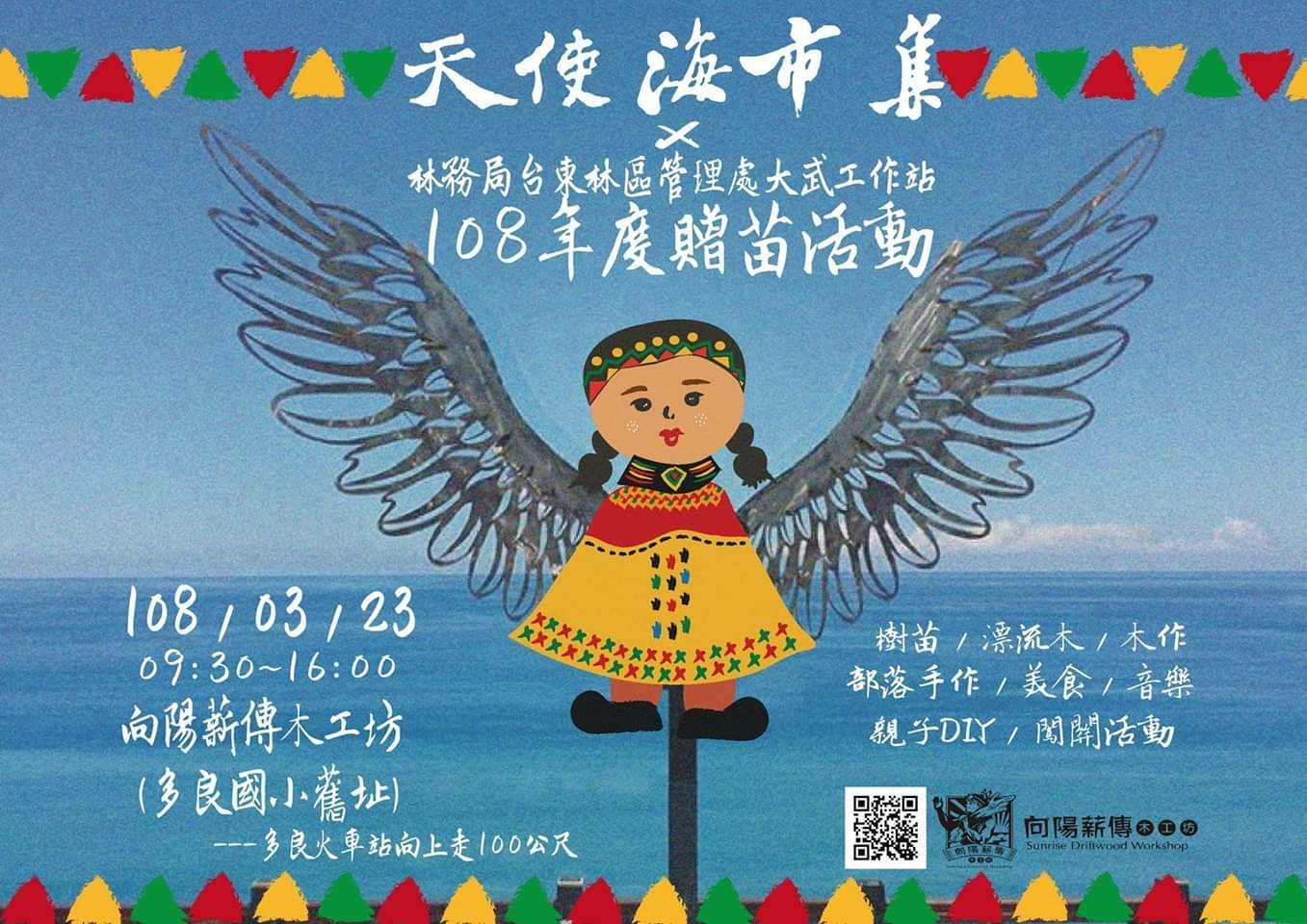 臺東林區管理處大武工作站於108年3月23日(星期六)上午9點半起,於向陽薪傳木工坊(原多良國小)辦理公益贈苗及植護樹活動,現場提供1,000株各類苗木及香草植物,民眾可憑本年度1-3月份發票、參與限量國產材木作DIY活動或購買現場里山市集產品等方式來兌領樹苗,活動所募得發票贈與公益團體。 臺東林管處表示,這次公益贈苗活動是該處大武工站與向陽薪傳木工坊合辦。向陽木工坊多年來推動生態治理、部落深度旅遊,木藝製品也小有名氣,以位於多良火車站上方100公尺的多良國小舊址作為木工基地,無敵海景更不輸多良火車站活動當天,仍提醒民眾將車輛停靠南迴公路單邊,伴隨太平洋春風海景步行到活動現場,憑108年1-3月份發票,或現場採購VuVu後花園的農產品、素人手作創作、創世基金會公益生活用品等市集攤位產品,即可兌領樹苗。為兼顧早鳥與晚鳥,兌領苗木分兩階段進行,分別於上午11點及下午兩點半,分2場次兌領,計有含笑花、山茶花、疏脈赤楠、桂花、杜鵑、朱槿、春不老、七里香、桃金孃、台灣野牡丹藤、台灣赤楠、蘭嶼羅漢松、白水木、相思樹、臺灣肖楠等15種苗木及香草植物。 大武工作站特別提醒早鳥民眾,當天上午9點半即發放限量100張的「阿拜」體驗卷,現場除了逛逛里山市集及參與「廉結公益」的政風有獎宣導以外,下午1點起,還有放輕鬆、部落青年-程皓、赤族樂團及池上樂台_小潘與大軍等接力表演,歡迎大家在血拼的激情過後,坐下來就著無敵海景,吹著海風、喝杯查拉密咖,聆聽美好的音樂,度過美好的一天! 大武工作站主任林素夷表示,這次「天使海」音樂市集,內容豐富且具里山概念,歡迎鄉親踴躍參加,貼心叮嚀自備環保袋,並帶足108年1-3月的發票及銀票,前來換取苗木,大家一起種樹愛地球。