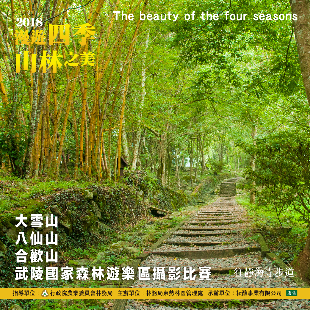 林務局東勢林區管理處舉辦2018「漫遊四季山林之美」攝影比賽,邀請大家遠離塵囂,拿起相機,投稿眼中的山林美景,輕鬆拿獎金! 東勢處轄區內有大雪山、八仙山、武陵、合歡山四處國家森林遊樂區,各具豐富遊憩資源、自然景觀獨特及交通便捷等特性,是中部地區饒富盛名的旅遊勝地。無論您想賞鳥、賞蝶、觀星、賞雪、欣賞晚霞、體驗大自然四季風情或上山吹吹風發發呆,都讓您有意想不到的體驗! 現在就拿起您的相機,一起出發,捕捉您眼中的美景,即日起至108年6月30日截止,最高獎金兩萬元,得獎攝影作品將於各遊樂區巡迴展出,並製作成限量明信片,活動詳情請上「2018漫遊四季山林之美攝影比賽」網站(已下線)」或電詢04-35051256黃小姐。 相關旅遊資訊,請洽大雪山遊客中心(04)25877901、八仙山遊客中心(04)25951214、合歡山遊客服務中心(049)2803985或松雪樓(049)2802980、武陵山莊(04)25901020詢問,或至台灣山林悠遊網查詢。