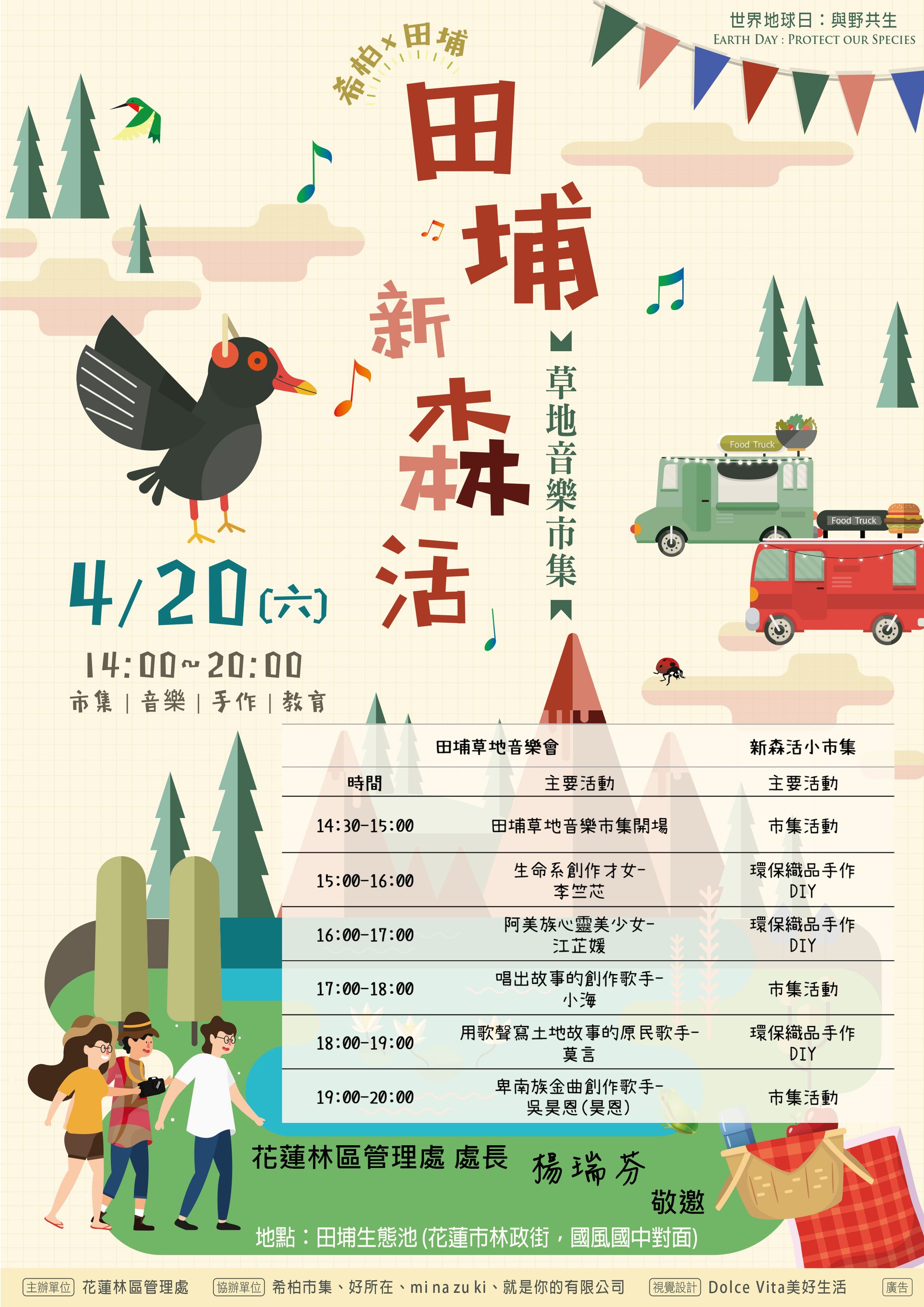 花蓮林區管理處將於4月20日下午2點至晚上8點,於花蓮市田埔生態池舉辦「田埔新森活 保育愛地球」草地音樂市集,很多人都不知道,在花蓮市國風國中的對面,有這麼一個祕境,其中的田埔生態池孕育了當地豐富的生態,而廣闊的草地及蓊鬱的林木,更創造了市區中不可多得、綠意盎然的園區。 田埔生態池原本是昔日木瓜林區管理處的貯木池,專門存放哈崙工作站伐採的珍貴木材,之後由於臺灣林業經營方式的轉變,於91年將貯木池營造為景觀濕地,成為附近居民休閒散步的好去處。本次特別與花蓮文青市集團隊「希柏市集」合作辦理草地音樂市集,在悠閒的假日午後時光,民眾可以藉由生態保育、國產材宣導及林下經濟的攤位了解林務局業務,搭配花蓮在地歌手清新、質樸的現場演唱,從白天到晚上體驗園區多樣的風貌。 本次市集活動搭配4月22日世界地球日主題「與野共生Protect our Species」,希望藉由防治外來入侵種的宣導,呼籲各界關注物種生存危機,一同守護生物多樣性。今年世界地球日以「蜜蜂」作為代表物種,象徵「再小的生物,都具有無可取代的生態地位」,一個都不能少,正好搭配林務局發展林下經濟中的養蜂產業,現場也有蜜蜂及各式蜂產品展示,花蓮林管處希望透過本次不同以往清新、有活力的活動,帶給民眾全新的感受,並讓更多人愛上大自然,學習如何與自然萬物和諧共處進而守護我們的環境。 本次活動為免費,詳細活動訊息公告於「林務局花蓮林區管理處」臉書粉絲專頁以及花蓮林區管理處官方網站(http://hualien.forest.gov.tw/)。