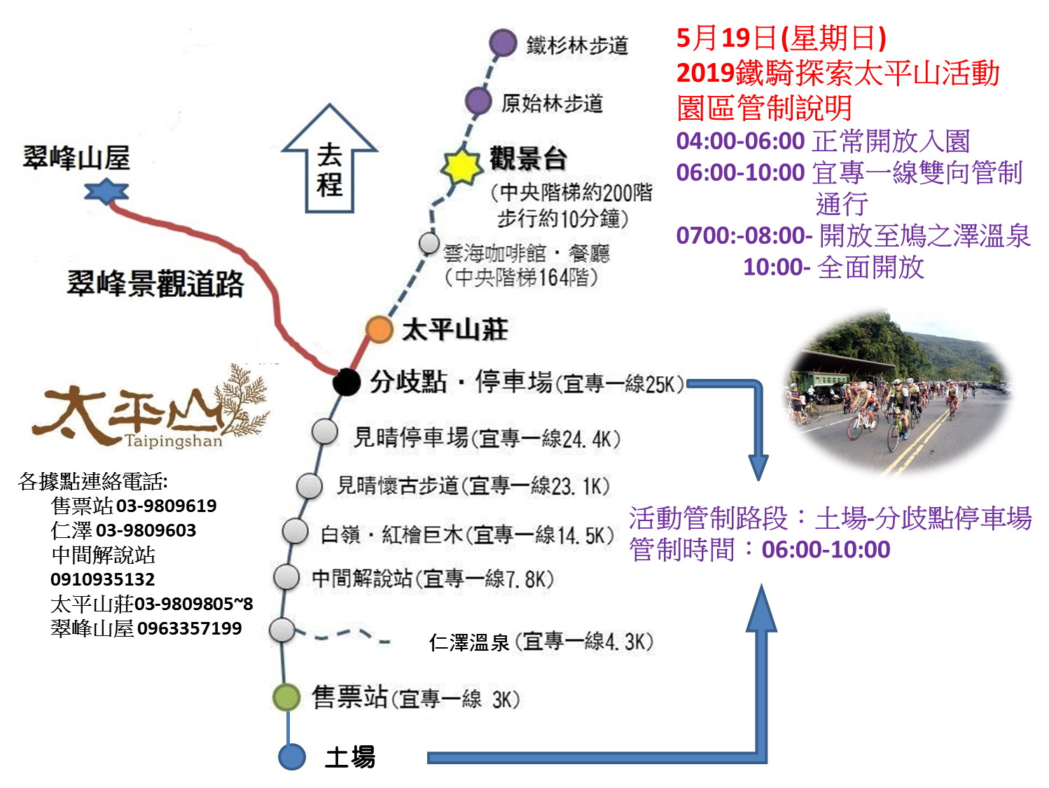 太平山2019年上半年度共受理2場次體育活動申請,分別為:1.台灣運動休閒產業協會於5月19日(星期日)辦理「2019鐵騎探索太平山」活動、2.宜蘭縣鐵人三項協會於6月1日(星期六)辦理「2019太平山雲端漫步活動」活動,辦理活動當日將實施區內道路「宜專一線」及「翠峰景觀道路」交通管制,敬請遊客配合。 「2019鐵騎探索太平山活動」訂於5月19日(星期日)上午06時至12時舉行,活動自土場騎乘腳踏車至宜專一線終點,因此當日上午6時至上午12時實施區內道路「宜專一線」全線交通管制。建議欲前往太平山莊及翠峰湖區域的遊客可提早於上午4時至6時入園或等待至中午12時活動結束後入園。 「2019太平山雲端漫步活動」訂於6月1日(星期六)上午06時至14時舉行,因路跑路線涉及區內道路「宜專一線」及「翠峰景觀道路」,管制時間分別為宜專一線上午06:00-08:30實施雙向管制、翠峰景觀道路上午06:00-14:00實施雙向管制。遊樂區內溫泉區因僅距售票站1.3公里,活動當日提早於上午7點30分後開放遊客泡湯及煮蛋。 活動管制詳情將於太平山FB粉絲團(http://www.facebook.com/tps100.forest/)、台灣山林悠遊網(http://recreation.forest.gov.tw/)及太平山森林遊樂區專網(http://tps.forest.gov.tw/)發布,或仍有相關活動交通管制問題,可洽太平山服務站(電話03-9809805)或太平山售驗票站(電話03-9809619)詢問。