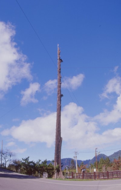 阿里山國家森林遊樂區內集材柱從過去伐木時期留存至今,仍屹立於過去的集材場,即現今的沼平車站鐵道旁。當初伐木時使用鋼索將四面八方砍伐的木材集中,需要有一根主柱支撐集材機的鋼纜,通常是就地取材,就近選一株高聳直立的樹,除去其側枝,作為集材柱。過去解說人員在進行解說時,有些推測集材柱樹種應是阿里山常見的紅檜或台灣扁柏,但也有以集材柱樹形高聳筆直,紅檜及台灣扁柏較少有如此高聳筆直的情形,推測其樹種應是另一種台灣原生種台灣杉。