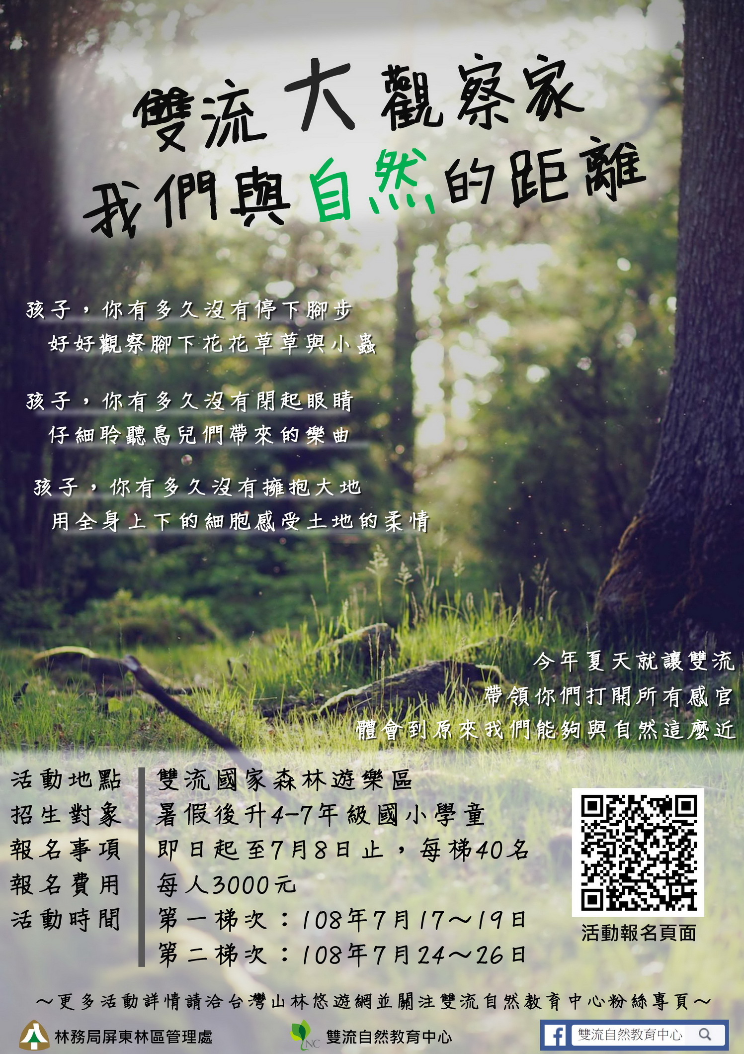 炎炎夏日準備來臨,還不知道該怎麼安排漫漫長的暑假嗎? 不用擔心!雙流自然教育中心將於7月17日~19日及7月24日~26日辦理兩梯次精彩的暑期營隊,今年除了有雙流自然教育中心經典的課程外,還加入許多探索體驗活動,讓學員不僅能透過課程學習新知,也藉由有趣的活動讓學員有不同的自然體驗方式,還有絕對不能錯過雙流精采的溪流探索課程,讓我們沉浸在雙流沁涼的溪水中,讓今年暑假的我們與自然零距離! 營隊一開始透過探索體驗活動讓學員藉由遊戲認識彼此並寫下營期中須遵守的自我規範,讓孩子在課程活動開始前為自己之後的行為立下規範與目標,並在營期間做好自我管理與建立團隊默契。第一天的營隊活動,雙流自然教育中心即設計出結合五種感官的探索體驗遊戲,讓孩子們藉由有趣的遊戲訓練不同的感覺器官,並打開自己的感官仔細觀察與感受大自然中細微的變化,讓孩子可以盡情的在大自然懷抱中盡情享受與自然的親密接觸。營隊第二天,藉由環境教師的帶領下,讓學員了解動物們為了保護自己所發展出的特異功能,也帶領學員認識雙流森林植物的多樣性,並穿梭在雙流鬱鬱的森林中尋找各式各樣的動物,透過此活動考驗每位學員的觀察力,除此之外,也透過行動顯微鏡讓參與者可以以微觀的方式進行觀察,將會有不同的收穫與驚奇喔!在營隊最末,學員將挑戰找尋水中微小的生物,透過觀察和紀錄判別每種水生生物所生存的棲地類型,並在課程結束後,讓所有參與者與教師在雙流溪水中嬉戲,共築今年夏天最美好的回憶! 擁有豐富森林生態及溪流環境的雙流森林遊樂區,多樣的生物彼此依存在這和諧的森林之中,你可曾慢下腳步找尋這些可愛又神秘的小精靈?偉大的生物學家達爾文曾經說過「讓我們一起到戶外去,從小地方觀察大自然,不斷嘗試且勇於探索。」今年暑假,雙流自然教育中心專業的師資群將要帶領孩子們走入雙流秘境,遠離城市與科技的喧擾,透過五種感官體驗認識大自然,也藉由仔細地觀察,發現隱身在森林及溪流中的小精靈們。 這個暑假就讓孩子放下手機和線上遊戲吧!由雙流自然教育中心帶領孩子穿梭在蓊鬰的山林和沁涼的溪水間,擁抱大自然並建立自信心與團隊合作的精神。營隊一共兩梯次,分別為7月17日至19日及7月24日至26日,每位參加費用為3,000元,包含課程、材料、門票、食宿、交通、保險等,現正熱烈報名中,要報名要快!詳細資料請查詢林務局山林悠遊網或電話洽詢08-8701499。