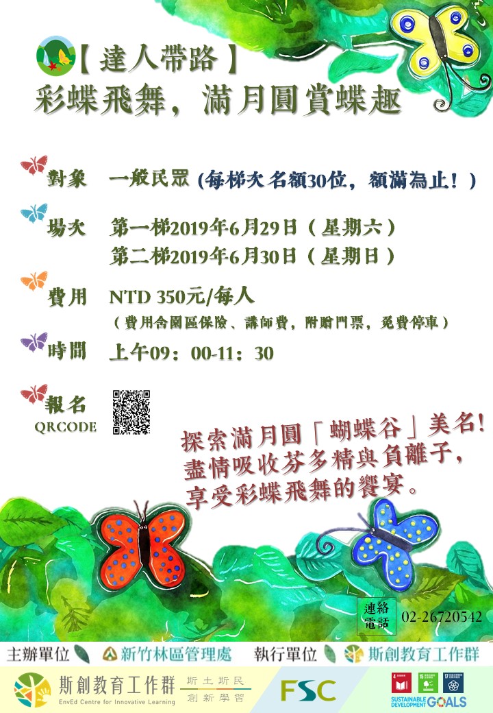 想知道滿月圓國家森林遊樂區內隨處可見翅膀披著一條青帶的大黑蝶是甚麼種類?想知道牠有甚麼獨特的癖好嗎?又或是想瞭解螳螂雌雄間的糾葛嗎?達人帶路第二波推出--彩蝶飛舞,於6月29日(六)、6月30日(日)辦理,帶您漫步在滿月圓步道上,耳聽潺潺水聲、眼觀彩蝶翩翩,感受滿月圓國家森林區內多樣的生態樣貌。 新竹林區管理處滿月圓國家森林遊樂區曾經記錄的蝶類高達176種,如白裙黃斑蛺蝶、青帶鳳蝶、琉球三線蝶等,在近半數種類的台灣蝴蝶都可在此發現,是目前紀錄最多蝴蝶種類的國家森林遊樂區,因此獲得北部的蝴蝶谷美名。在園區內,不僅是蝶類翩翩飛舞,因滿月圓區內豐富的生態條件,更有許多昆蟲值得一探,誠摯邀請您走進步道,在達人的帶領下,近距離觀察滿月圓園區內的蝴蝶及昆蟲。每梯次開放30人,共計60位名額,額滿為止,將於5月29日上午10點起開放線上報名,報名資訊請詳見「滿月圓國家森林遊樂區」臉書粉絲專頁(https://www.facebook.com/ManyueyuanNationalForest/)或洽詢滿月圓國家森林遊樂區遊客中心電話02-26720542(週二休館)。 「滿月圓國家森林遊樂區」開放時間平日及假日皆為下午五時閉園,未來也將陸續推出學校戶外教學課程、季節性主題活動、友善環境市集等,相關訊息可追蹤「滿月圓國家森林遊樂區」臉書粉絲專頁,或上「臺灣山林悠遊網」查詢。