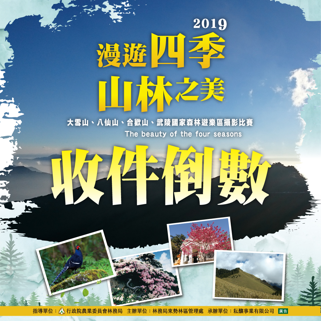 東勢林區管理處辦理「漫遊四季山林之美」攝影比賽,徵件日期至108年6月30日止,歡迎各路攝影好手前往大雪山、八仙山、武陵及合歡山國家森林遊樂區,捕捉山林之美,現在就上官方網站下載報名表及簡章。 比賽獎項分別為每個遊樂區金獎1名,每名獎金新臺幣20,000元;銀獎2名,每名獎金新臺幣10,000元;銅獎3名,每名獎金新臺幣5,000元;優選3名,每名獎金新臺幣3,000元;入選有6名,每名獎金新臺幣1,000元;總獎金共計新臺幣28萬元,愛好攝影的朋友們,有投稿有機會,大獎等你來拿! 徵件主題為大雪山、八仙山、合歡山、武陵國家森林遊樂區之人文歷史、自然景觀及動植物等主題,得獎的平面攝影作品將於各遊樂區巡迴展出,並製成限量明信片,與民眾分享台灣豐富的自然山林資源,歡迎民眾踴躍拍攝投稿。 相關攝影比賽活動資訊請上「漫遊四季山林之美攝影比賽」網站查詢https://dongshihforestrycu.wixsite.com/homepage或電詢04-35051256黃小姐。 相關旅遊資訊,請洽大雪山遊客中心(04)25877901、八仙山遊客中心(04)25951214、合歡山遊客服務中心(049)2803985或松雪樓(049)2802980、武陵山莊(04)25901020詢問,或至台灣山林悠遊網: https://recreation.forest.gov.tw/查詢。