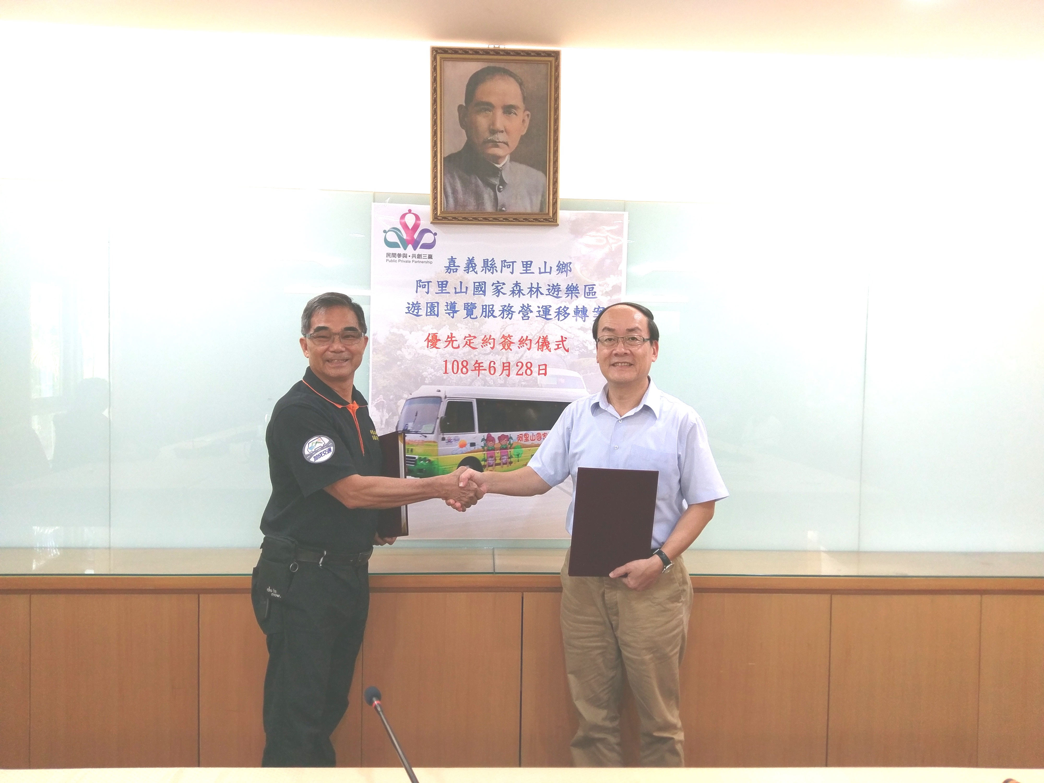 林務局嘉義林區管理處於103年7月依促進民間參與公共建設法,委託加成交通股份有限公司營運阿里山國家森林遊樂區內遊園導覽服務,契約即將屆滿,該公司營運績效良好取得優先定約資格,且經行政院農業委員會同意授權,雙方由林管處張岱處長及加成公司阿里山營業所鄭榮華董事長代表,於今(28)日完成簽約。 阿里山國家森林遊樂區自104年4月成功通過高海拔、高濕度及坡度等考驗,全面採用電動中型巴士作為遊園導覽車種,每年可減少322.75公噸的碳排放量,創造低碳、環保、綠能的阿里山。林管處與加成公司公私協力營運成果顯著,更於105年榮獲財政部第14屆民間參與公共建設金擘獎-政府機關團隊獎、民間經營團隊獎之優等獎的肯定,本次簽約代表政府機構與民間企業持續攜手合作,期許再提升阿里山的旅遊品質,共創公部門、民間企業與遊客三贏的未來。 炎炎夏日,歡迎民眾前往阿里山國家森林遊樂區避暑,除了可造訪全台最高海拔電動車的祝山林道秘境,與迷霧中的王者-帝雉相遇,漫步於高山植物園及具備360度環繞視野的小笠原山觀景台,亦可前往姊妹潭、沼平公園、詩詞步道、櫻之道(天空步道),享受清靜森林浴,或選擇沿著三代木步道往舟之橋方向前行,聆聽阿里山溪支流演奏出的自然樂章,夏季的阿里山提供您不一樣的風貌,園區提供多樣遊程建議,遊客可上山林悠遊網查詢。