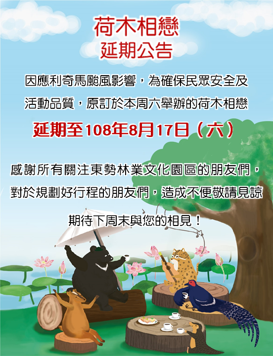 東勢林業文化園區原訂於108年8月10日舉辦「荷木相戀」活動,因應利奇馬颱風影響,為確保民眾安全及活動品質,延期至108年8月17日星期六舉辦,歡迎屆時來園區貯木池畔欣賞浪漫荷景、於樹林下聆聽浪漫音樂,同時享受天然健康的森林芬多精,來一趟荷木相戀的浪漫之旅。 感謝所有關注東勢林業文化園區的朋友們,對於規劃好行程的朋友們,造成不便敬請見諒。詳細活動訊息,歡迎民眾隨時關注園區粉絲專頁https://www.facebook.com/DongshihForestryCulturePark/。