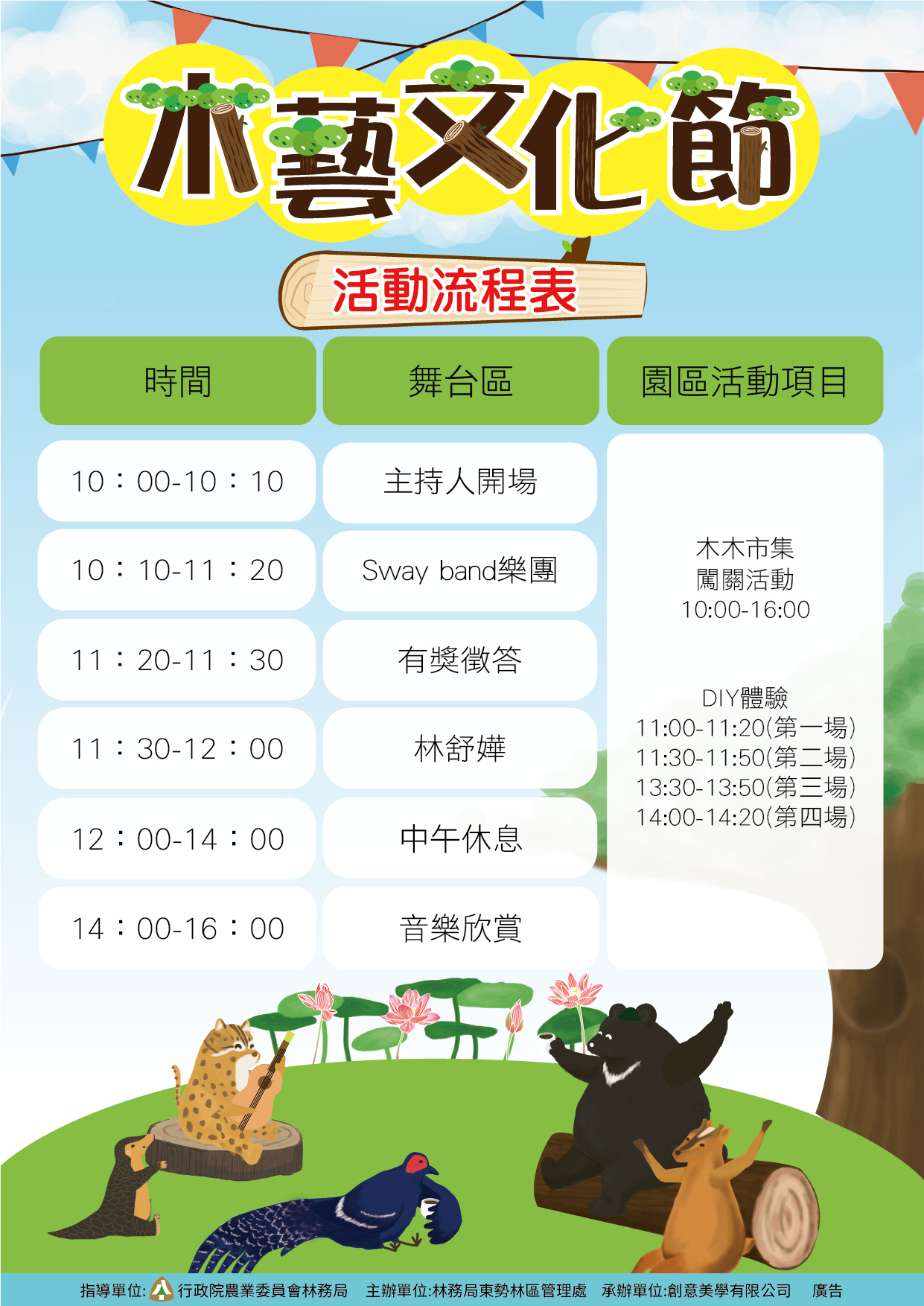 東勢林業文化園區前身為大雪山林業公司,過去曾為臺中山城創造輝煌的林業歷史與文化,林務局東勢林區管理處為傳承再生園區的人文風采與歷史意義,將在10月19日(六)為民眾帶來一場優質的文化饗宴「木藝文化節」,以木藝美學為主題,結合園區內珍貴的林產工業史蹟、國際級大師的木雕作品與現代的木藝創作,帶領大家深入認識東勢林業發展的軌跡,欣賞東勢林業文化園區的秋季風采。 東勢林業文化園區不僅有舒適愜意的森林環境,在步道兩側更有多組深具意義及文化風格的國際級木雕作品,提供民眾在園區裡漫步細賞,而此次在「木藝文化節」中,特別邀請東勢在地知名木藝單位,與多位木工藝師、木藝愛好者齊聚一堂,共同展示山城地區的木工藝文化成果。另有多種免費限量的「木作文創DIY」、園區專屬的「木木市集」與音樂藝術表演,邀請民眾一起享受木藝文化的魅力,為大家帶來多元又具知性深度的休憩體驗。 趁著天高雲淡、秋風漸爽的周末,林務局東勢林區管理處誠摯地邀請大家同來探訪東勢林業文化園區,感受木頭帶來最舒適的溫度,欣賞精湛的木藝美學、享受森林與音樂,過個充實愉快的週末假期吧! ※東勢林業文化園區粉絲專頁 ※東勢林業文化園區108-109年系列活動