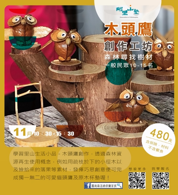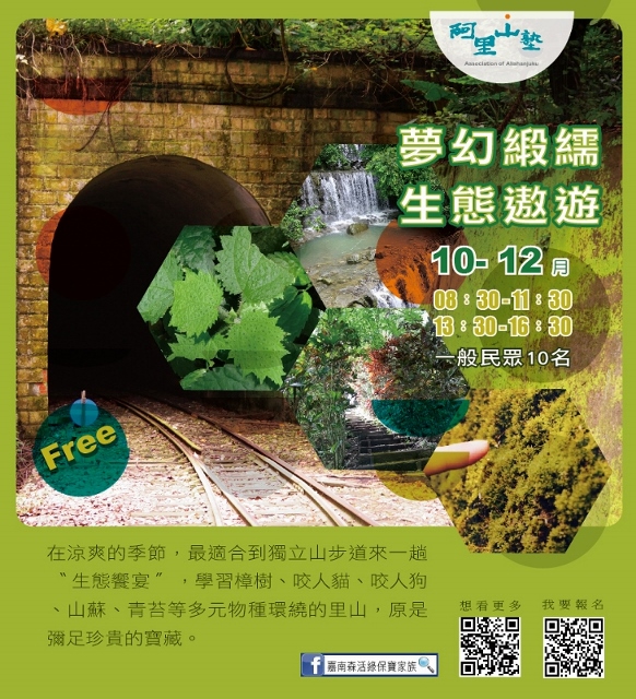 林務局嘉義林管處與阿里山地區的茶山、草山、山美、公興、緞繻及里佳等6個社區合作,自10月底至12月底,推出13種阿里山塾體驗活動,邀請大家來體驗阿里山不同海拔的山村生活與生態。「嘉南森活綠保寶家族」粉絲專頁告訴您更多活動訊息!(https://www.facebook.com/Greenforestry/) 阿里山塾每項體驗活動均由社區最在地的森林達人,帶領大家認識嘉義山區的森林植物特色,運用各種植物特性發展出來的山林生活智慧,透過手與植物的接觸,感受深耕於里山精神的在地知識。 讓您驚奇的里山生活智慧! 此次合作的社區包含阿里山地區3個鄒族部落與3個閩客社區,各自推出2至3個體驗活動,社區夥伴引領大家尋找冰原歷險記中,鼠奎特一直鍥而不捨的石櫟種子,或是徜徉充滿芬多精的杉木林中,感受香氛迷霧,或是跟著農家體驗芋頭、咖啡、山薑的農事管理工作,還可以了解山美達娜伊谷鯝事的起源和飛鼠的家! 嘉義林管處張岱處長表示,林務局近年來推動山村綠色經濟永續發展計畫,以追求社會與自然和諧共處的里山倡議精神,輔導山村發展林下經濟、友善農業、生態旅遊等兼顧生態、生產、生活的永續發展模式。嘉義林管處自去年起,盤點阿里山地區部落與社區的里山生活年曆,配合山村生活的節奏,於今年10月底起,優先推出6個社區13種體驗活動,開辦阿里山塾,建立都市與山村交流的平台,提供一般民眾參與山林生活與工作的機會,歡迎家庭團體,親朋好友一同報名參加,感受隨著四季脈動的生活智慧與步調。更多活動訊息請至「嘉南森活綠保寶家族」粉絲專頁查詢!(https://www.facebook.com/Greenforestry/)