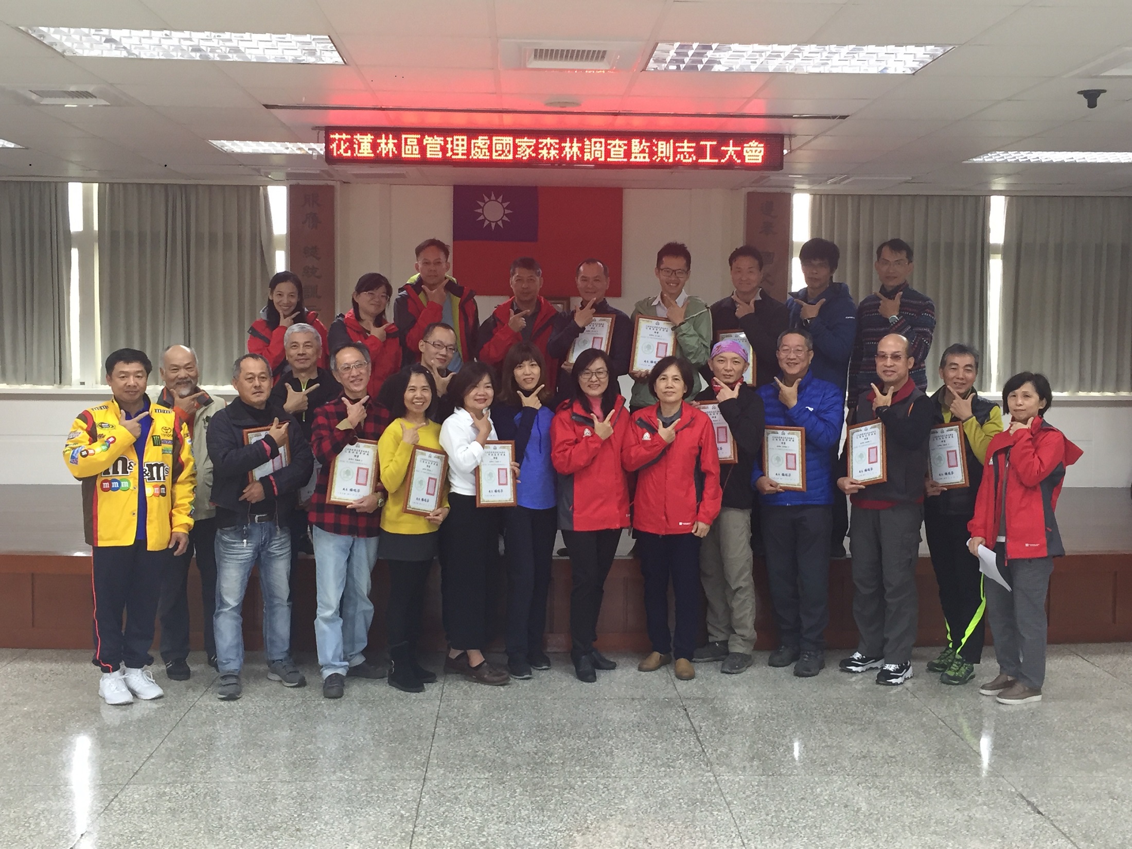 為擴大公民參與森林保護工作,強化林地巡護並遏止盜伐案件發生,花蓮林區管理處12月27日辦理國家森林調查監測志工大會,宣告第二期志工正式成軍,24位志工在領取聘書後,將與第一期的8位志工整合,共同加入公私協力完成森林巡護、濫墾及盜伐等不法林政案件的通報工作行列。 林管處轄下國有林業用地森林面積廣達32萬公頃,行政區域幾乎涵蓋花蓮縣境各地,還有為國土保安、水源涵養及景觀維護所劃設2,049公頃的區外保安林,單倚賴林管處88位森林護管員巡視,實在難以完全遏止所有的不法行為,因此,林管處除了與周邊社區及部落合作巡守之外,也從107年起招募國家森林調查監測志工,共同來保護國家森林,齊心協力打擊不法。 林管處表示,第二期國家森林調查監測志工,共有30多人報名,最後錄取24名並全數完成基礎、專業與實地參與林地巡護及盜伐通報等訓練課程,正式加入森林巡護任務行列。 林管處長楊瑞芬在頒發志工聘書時表示,感謝志工的付出,不論是深山特遣、偏遠巡視志工們都認真積極協助本處執行,這是一份需要體力和耐力的工作,尤其犧牲個人時間完成社會參與更令人佩服。志工,是社會資源共享的具體展現,公私協力攜手維護寶貴的國家森林資源。