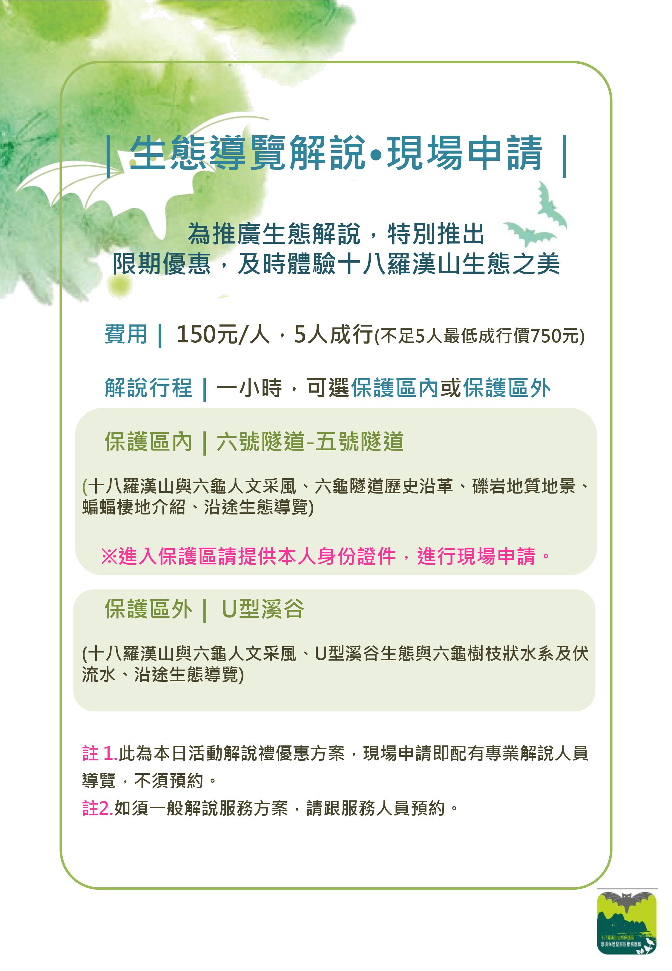 十八羅漢山自然保護區具有礫岩層、動植物、採樟人文歷史特色,如今由在地居民組成協會,成為全台灣第一個可受理預約解說導覽的保護區,為使民眾更容易親近及認識保護區,因應總統大選及春節連假,訂於109年1月4(六)、18(六)、25-29日(初一至初五),每天早上9:00至下午15:00可於解說服務站臨櫃申請解說服務喔!活動當日每人收費150元,5人即可成行,由「十八羅漢山自然人文協會」解說員進行專業解說,帶您體驗十八羅漢山之豐富生態及人文歷史! 過去進入自然保護區需於15日前申請,常造成遊客不清楚事前申請之規定敗興而歸,屏東林區管理處為提供遊客更友善的申請方式,及提供優質的解說服務,近期推出現場臨櫃受理解說服務的機制,遊客需備妥有相片之身分證明文件(7歲以上14歲以下之兒童,得以戶口名簿影本或健保卡替代,外籍人士備護照),至十八羅漢山自然保護區解說服務站向解說員確認當日是否尚有名額,若當日申請人數未達承載量上限,並經服務團隊確認配有解說員後,即可就剩餘人數辦理現場申請,若想知道更詳細的資訊,可至「十八羅漢山生態之旅」FB粉絲團查詢、撥打0905-635-652專線洽詢,或至屏東林區管理處下載「十八羅漢山自然保護區環境教育活動申請要點」。 106年9月十八羅漢山環境保護暨解說服務團隊成立,並於108年12月成立十八羅漢山自然人文協會,由六龜在地解說員帶領大家深入十八羅漢山,體驗天然地理教室、沿途植物解說、蝙蝠棲地等生態之美,傳遞六龜與十八羅漢山隧道開通的採樟林業故事,至今推出的各項服務深受民眾喜愛,遊客穩定成長,並成為進入六龜地區最佳平台。透過團隊的解說、定期環境巡護監測,將居民引入保護區經營管理規劃的一環,也牽起十八羅漢山自然保護區與六龜地區在地連結,解說團隊誠摯邀請您於連假期間探訪十八羅漢山,優質的解說讓您一窺自然保護區之風貌,走過路過都別再錯過了唷! 十八羅漢山生態之旅FB粉絲團https://goo.gl/SgeWjf 六龜嬉遊記https://www.beclass.com/rid=224139b5c32d01766a46?fbclid=IwAR2e-Qy3_SCWKGr9tdInjJS4bec2JIK-n_SxTCC3KqpztAfhY0BJWE3vydQ 十八羅漢山自然保護區環境教育活動申請要點https://pingtung.forest.gov.tw/0000116 活動十五日前申請進入十八羅漢山自然保護區之方式: 自然保護區域進入申請系統申請:https://pa.forest.gov.tw/ 申請解說員(十八羅漢山生態之旅):https://www.beclass.com/rid=213ec8e5a5593a53114f *提醒您,未經申請是不得進入保護區的,否則會被罰款唷*