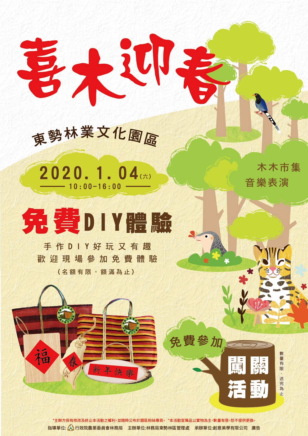 為了迎接2020年,林務局東勢林區管理處將於109年元月4日(星期六)舉辦「喜木迎春」活動!位於台中東勢區的東勢林業文化園區是一座擁有珍貴林產工業史蹟與豐富生態環境的森林秘境,在108年經過東勢林管處的精心規劃,已完善了園區環湖步道等設施,此次元月的主題活動,以好玩的木作文創DIY結合農曆新年作為主軸,歡迎民眾一同提前來歡樂迎春,同時漫遊環湖步道欣賞湖光山色、享受森林芬多精。 在元月4日活動中,特別邀請了東勢在地知名藝術家-徐菊英老師現場指導民眾書寫喜慶小春聯,並搭配木製吊飾或明信片,製作專屬喜木迎春紀念品,不僅如此,當天徐老師團隊將現場免費贈送新年春聯(數量有限,送完為止),希望提前與遊園民眾分享新年喜慶。除此之外,活動中還有專屬園區的「木木市集」以及免費闖關活動,舞台區更是邀請到東新國小-扯鈴隊及藍圖音樂表演團隊為大家帶來精彩的音樂藝術表演,希望帶給大家歡喜迎新春的美好週末假期。 東勢林業文化園區從今(109)年元月開始,每月都將推出不同的主題活動,結合園區四季美景、森林多元服務價值、綠保永續理念等,規劃適合不同年齡層的活動內容,歡迎各地民眾一同來體驗。林務局東勢林區管理處誠摯邀請您元月4日一起來喜木迎新春! 詳情參閱東勢林業文化園區粉絲專頁或東勢林業文化園區108-109年系列活動網頁。