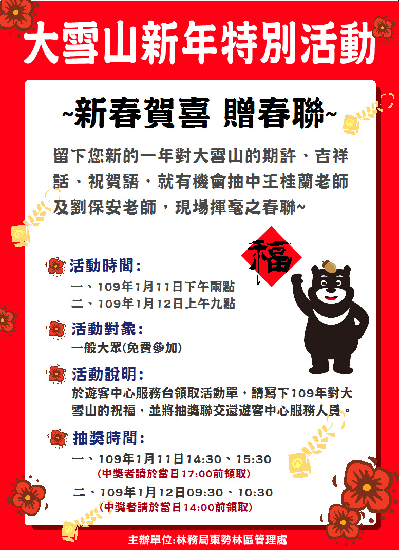 喜迎農曆金鼠年,東勢林區管理處於大雪山國家森林遊樂區辦理書法家揮毫贈春聯活動!於1月11日下午14點、12日上午10點起大雪山遊客服務中心現場揮毫,於大雪山臉書粉絲專頁按讚即可免費抽春聯,歡迎踴躍參加! 春季的大雪山是國際知名的賞鳥據點,不僅鳥類資源豐富,部分種類更是彌足珍貴而罕見!大雪山擁有千變萬化的雲海景觀、絢麗多彩的美麗晚霞以及原始的森林景緻,新春期間閤家前往大雪山走走,相信您會有場美麗的邂逅。 林務局東勢林區管理處邀請您悠遊大雪山體驗大自然之美,也呼籲您為維護空氣品質及保障他人拒吸二手煙的權利,大雪山國家森林遊樂區內全面禁菸,敬請配合。 欲了解大雪國家山森林遊樂區相關資訊,請上林務局台灣山林悠遊網、大雪山臉書粉絲專頁查詢,或洽大雪山遊客服務中心(04)25877901。