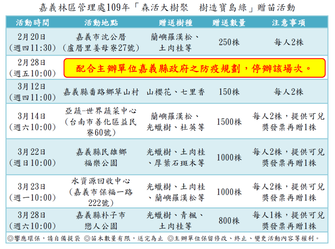 林務局嘉義林區管理處為響應今(109)年植樹月「森活大樹聚」主題,與嘉義縣市及台南市政府合作,於2-3月舉辦7場贈苗活動。其中2月28日(星期五)於嘉義縣朴子市戀人公園(嘉有好市集)之贈苗場次,主辦單位嘉義縣政府為因應嚴重特殊傳染性疾病新冠肺炎「COVID-19」疫情防堵,宣佈2月份嘉有好市集停辦1次,嘉義林管處該場次贈苗活動亦配合主辦單位防疫規劃停辦1場,不便之處敬請見諒。 嘉義林管處植樹月贈苗活動場次尚有3月12日(星期四)於嘉義縣番路鄉原草山分校附近;3月14日於台南市善化區亞蔬-世界蔬菜中心;3月22日於嘉義縣民雄鄉福樂公園;3月23日於嘉義市水資源回收中心;3月28日於嘉義縣朴子市戀人公園(嘉有好市集)等5場次。貼心提醒,各場次活動細節及贈苗樹種略有差異,另主辦單位為因應相關疾病之防疫需求可能調整活動內容,請民眾隨時注意嘉義林管處官網或阿里山國家森林遊樂區FB 所發佈之最新消息,亦可洽嘉義林管處(電話05-2787006#374 黃小姐)詢問。