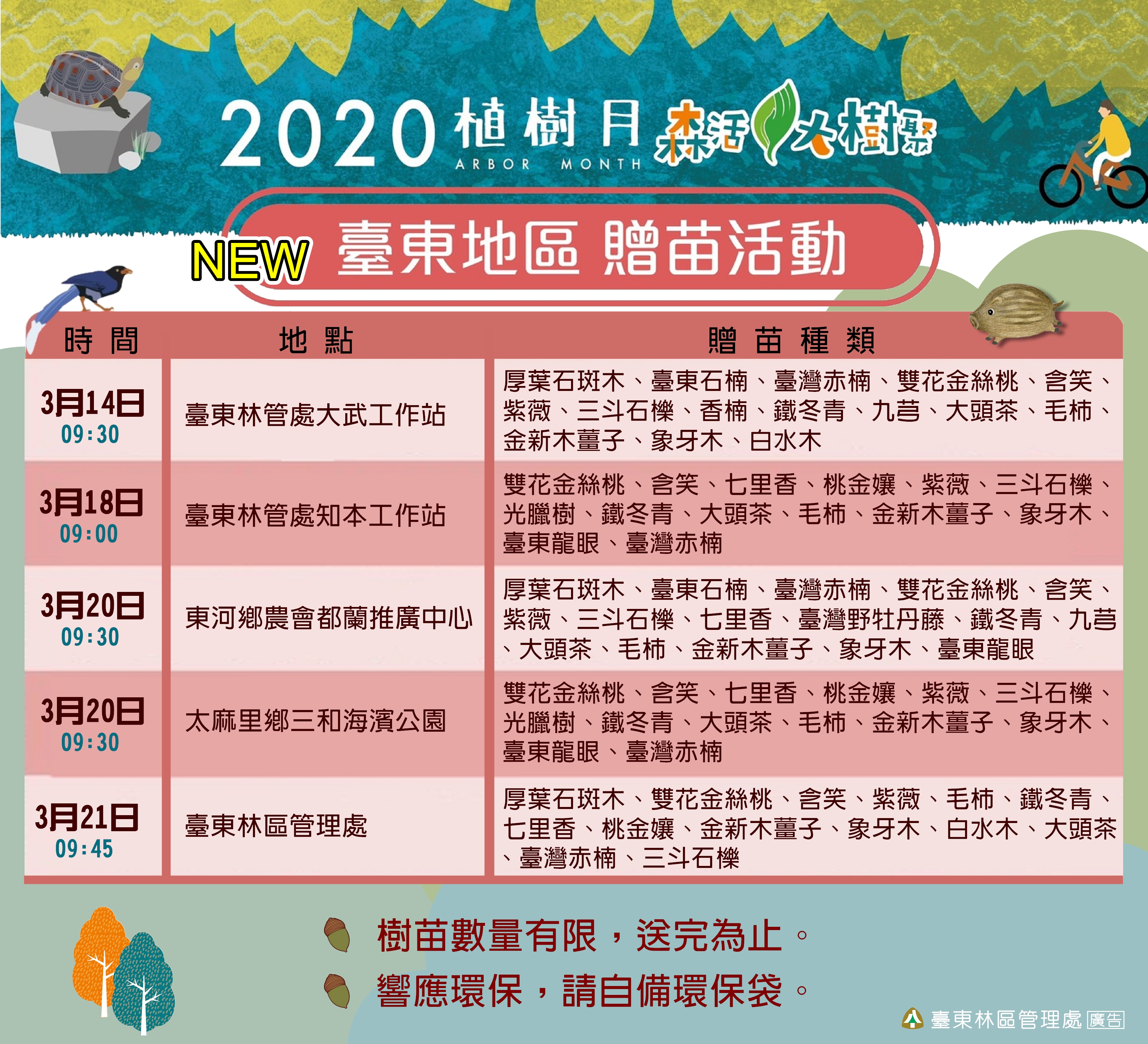 今天是植樹節,您種樹了嗎?如果還沒有,沒關係,臺東地區內還有5場次的贈苗活動,要讓民眾領樹苗綠化家園。其中3月14日及3月21日在大武工作站的市集及台東市區太平溪口的淨灘活動,因應新冠肺炎(COVID-19)的防疫需要取消,但當天仍有大武工作站及臺東林管處處本部廣場進行贈苗,贈苗的樹種全數為台灣原生種,微調為雙花金絲桃、含笑、紫薇、厚葉石斑木、七里香、臺灣赤楠、光臘樹、大頭茶、鐵冬青、毛柿、三斗石櫟、香楠、白水木、臺東石楠、臺東龍眼等原生種植物給民眾兌換。歡迎想要植樹綠化的民眾們,前往各贈苗場次兌換苗木,各場次兌換方式略有差異,詳情可參閱活動海報或電話洽詢。為響應環保,請自行攜帶環保提袋或容器領苗。 【活動洽詢電話】 臺東林區管理處089-324121(3月21日臺東市區贈苗場次) 知本工作站089-512214(3月18日知本及3月20太麻里贈苗場次) 成功工作站089-851027(3月20日都蘭贈苗場次) 大武工作站089-791016(3月14日大武贈苗場次)