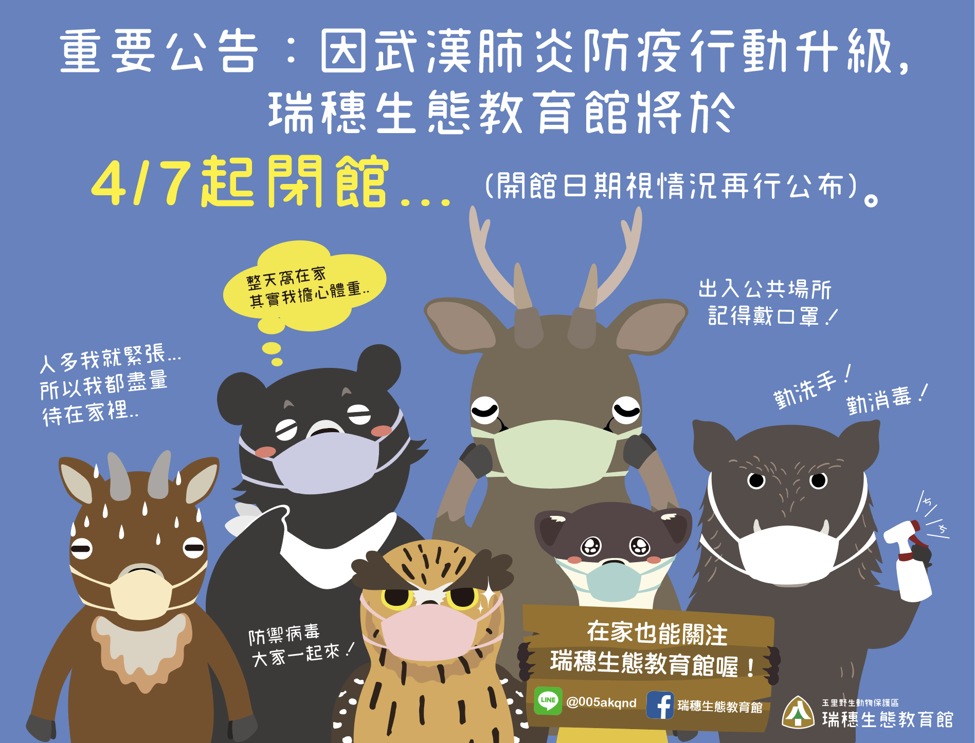 因應新冠肺炎(COVID-19)疫情日益嚴峻,花蓮林區管理處為強化各項防疫措施,6日宣布轄內瑞穗生態教育館、佐倉步道館自4月7日起至5月3日止休館,此外,民眾進入池南國家森林遊樂區、大農大富平地森林園區及林田山林業文化園區則必須配合量測體溫、消毒及配戴口罩,並保持室內1.5公尺、室外1公尺的社交距離,防疫安全,你我共同來守護。 林管處長楊瑞芬表示,花蓮森林育樂場域分布於北、中、南區,主要提供親子互動及旅遊踏青。因應疫情,從3月起進入場域前,均設有量測額溫、消毒及室內配戴口罩相關措施,並要求遊客填寫資料以利追蹤。伴隨疫情變化,避免群聚感染,自4月起暫停辦理大型活動,原規劃的環境教育課程及親子活動等將加強動線管制、總量管制及保持安全社交距離等因應機制,以分流人潮做到滴水不漏,提供安全健康的遊憩場域。疫情期間瑞穗館也將提供線上互動服務,讓民眾在家也可以體驗活動及享受解說服務。 林管處防疫不鬆懈,也請民眾為防疫共體時艱、遵守防疫相關措施,才能有安心的遊程。林管處隨時更新最新消息,民眾可上「大農大富平地森林園區」、「林田山林業文化園區」、「瑞穗生態教育館」、「花蓮林區管理處」臉書粉絲專頁查詢。 花蓮林區管理處FB粉絲專頁查詢:https://www.facebook.com/hualien.forest.gov.tw/ 大農大富平地森林園區臉書粉絲專:https://www.facebook.com/MASADIFOREST/ 林田山林業文化園區臉書:https://www.facebook.com/ilovemorisaka/ 瑞穗生態教育館臉書粉絲專頁:https://www.facebook.com/rsecology