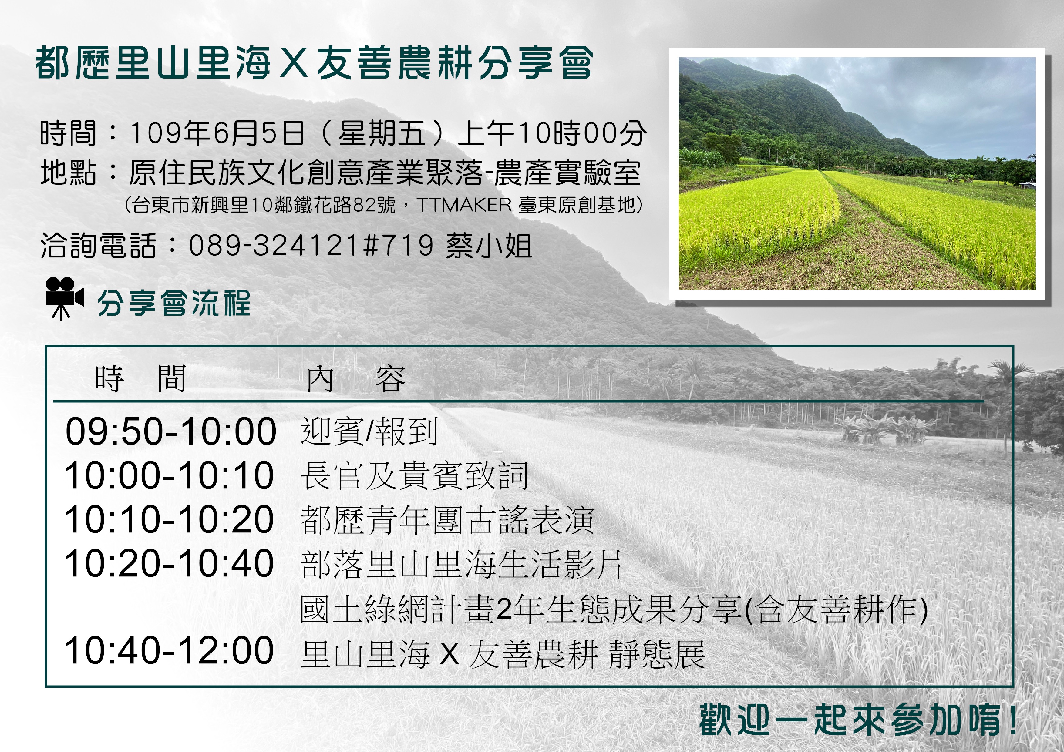 臺東林管處6月5日在原住民族文化創意產業聚落-農產實驗室與都歷部落上午10時共同辦理「都歷里山里海友善農耕分享會」,分享會將呈現雙方合作推動里山倡議之成果,包含在地生物多樣性、多元生活工藝、產業及文化特色。透過特展傳遞人與自然和諧共生之理念,包含認識里山動植物、生活、瞭解水梯田復育及文化地景維護之重要性。
