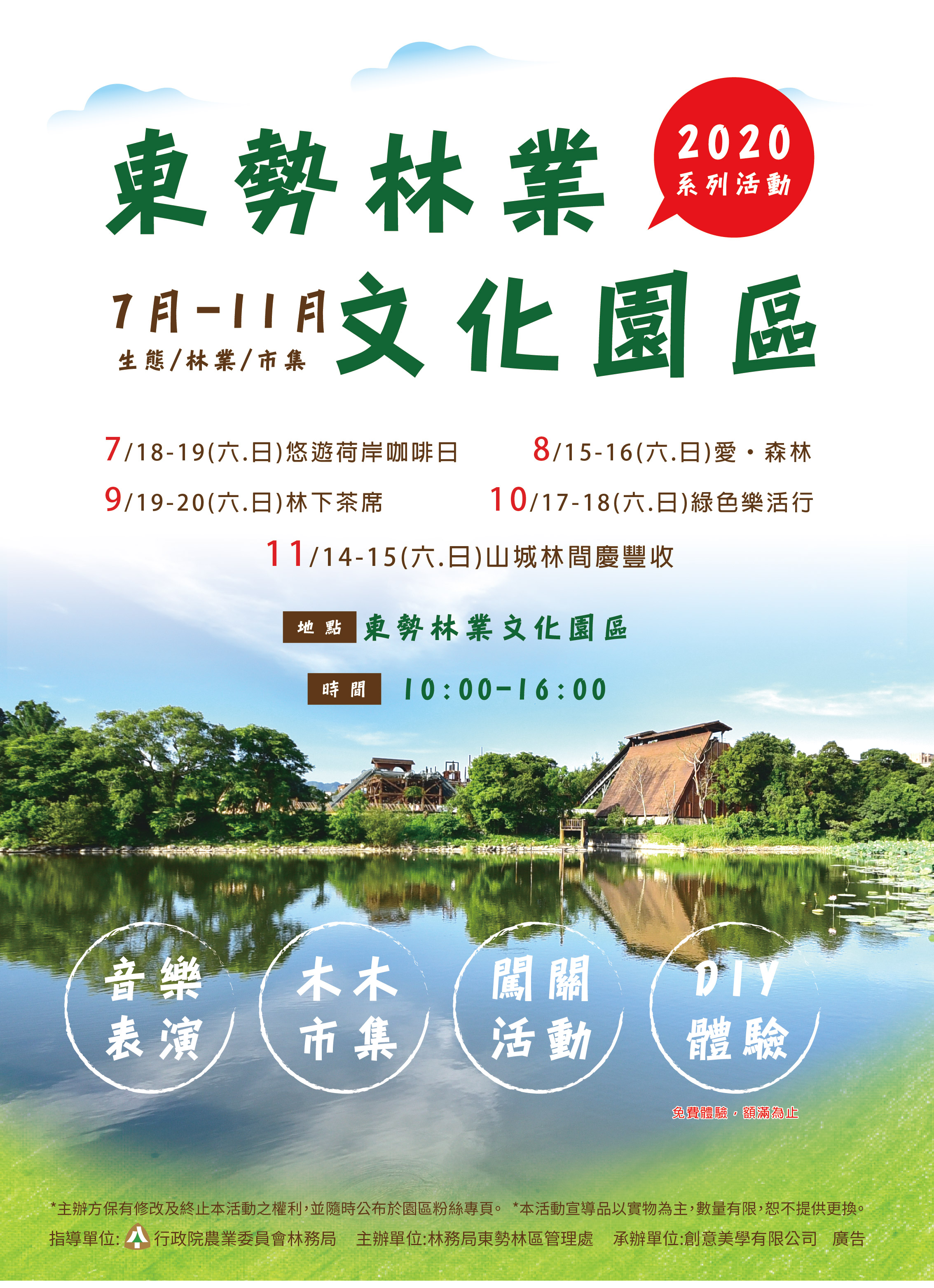 炎炎夏日何處去呢?現正值東勢林業文化園區貯木池最佳賞荷時刻,為了給疫情悶壞的國人更多的旅遊體驗,林務局東勢林管處將於7月18、19日(星期六、日)於園區舉辦「悠遊荷岸咖啡日」活動!邀請大家走入園區賞荷、品咖啡、聽音樂、逛市集,一同享受清涼荷風。 「悠遊荷岸咖啡日」活動當天,舞臺區將安排多組精采表演,並以荷花及森林生態為主軸,提供多款限量免費的森林DIY體驗與闖關活動,還有園區專屬的「木木市集」,由來自台灣各地的森林文創及友善耕作業者展售多樣特色產品,更有消費滿額送禮活動,買到賺到! 另外,林務局東勢林管處為呼應731世界巡護員日(World Ranger Day)向堅守第一線保護山林、艱辛工作的森林護管員們致敬,也讓民眾體驗護管員日常工作的甘苦,特別安排在7月18日(星期六)加碼辦理「我們與森林的距離~森林巡護體驗活動」,除邀請2位經驗豐富的森林護管員現身說法,分享工作的酸甜苦辣,並有精心安排闖關活動(包括木材檢尺、救火模擬、負重、樹種辨識等),讓大家以有趣的方式來認識護管員守護山林的工作。上、下午更安排束口棉布收納袋彩繪各1場(限量共60份),採現場報名,數量有限。邀請大家加快腳步,來當「一日森林護管員」! 東勢林業文化園區今年7-11月將融合音樂、藝術、知識、比賽等元素,每月推出不同主題的活動,歡迎您的參加!相關訊息請持續關注園區臉書及活動官網。 ※東勢林業文化園區粉絲專頁 ※東勢林業文化園區108-109年系列活動網頁