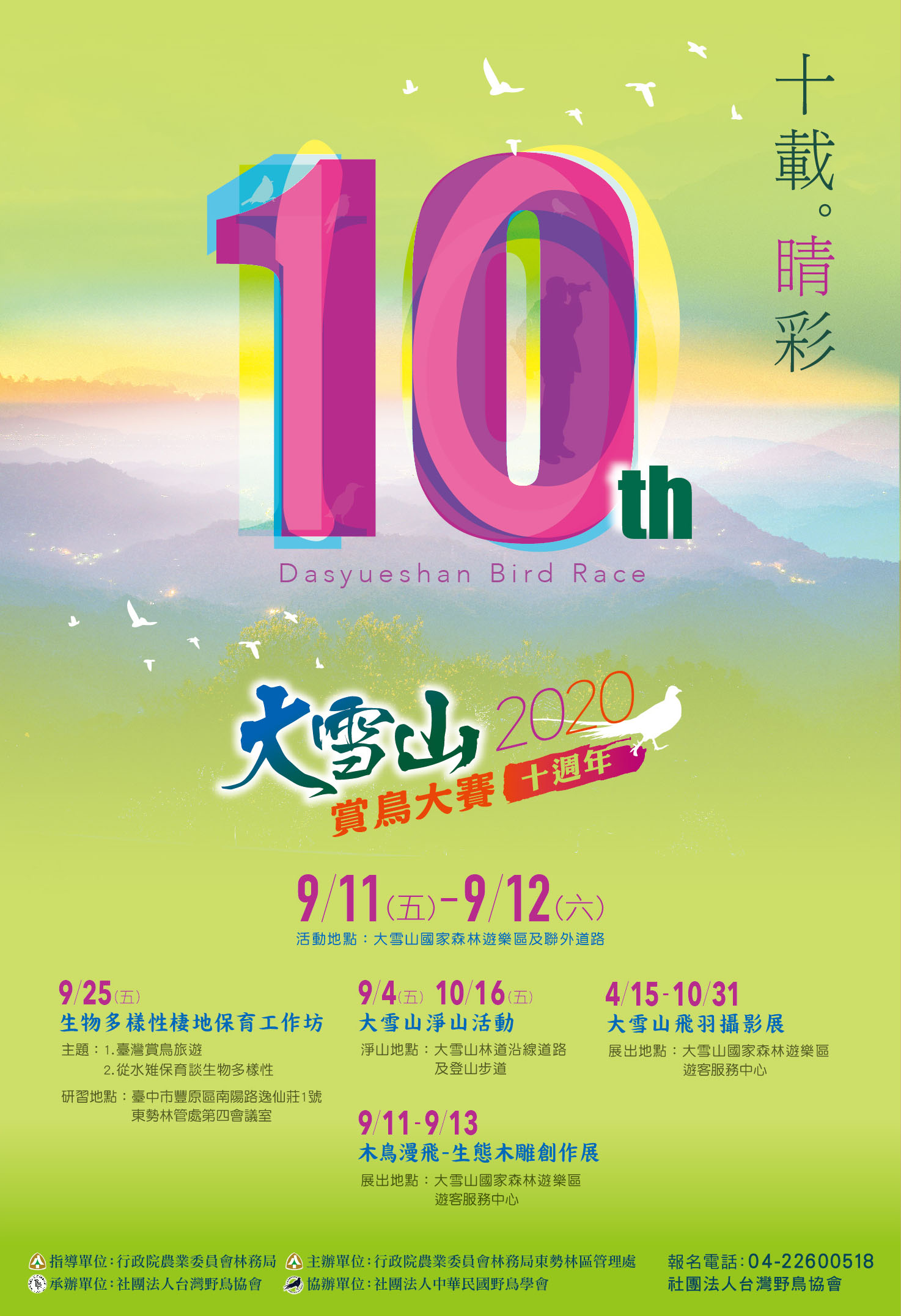 林務局東勢林區管理處為號召民眾以行動愛護環境,宣導垃圾不落地與無痕山林理念,今(109)年9月4日(五)、10月16日(五)辦理「大雪山林道淨山活動」,淨山活動即日起至8月25日止受理電話報名(上班日),額滿為止,活動當日另開放現場報名,歡迎有興趣的民眾把握機會踴躍報名! 東勢林區管理處今年(2020)舉辦第10屆「2020大雪山飛羽‧風情萬種〜賞鳥大賽」系列活動,活動內容包括: 9月4日、10月16日「大雪山林道淨山活動」,9月11日至12日「大雪山賞鳥大賽」,9月11日至13日「木鳥漫飛-木雕生態創作展」,9月25日「生物多樣性棲地保育工作坊」,4月至10月「大雪山飛羽鳥類攝影展」,以推廣大雪山鳥類生態之美及棲地保育理念,而9月4日的「大雪山林道淨山活動」揭開系列活動序幕,希望集結眾人力量一同為保護自然生態環境盡一份心力,也還給美麗山林清淨面貌! 「大雪山飛羽‧風情萬種〜賞鳥大賽」過去9年已吸引超過1,300位以上國內、外賞鳥愛好人士參加,歷經9年的賞鳥大賽已記錄了200種鳥類,而大雪山國家森林遊樂區及大雪山林道沿線累積紀錄達60科225種鳥類,其中包含了黑長尾雉、藍腹鷴、白耳畫眉、黃山雀等28種臺灣特有種(僅烏頭翁沒紀錄),以及48種臺灣特有亞種鳥類,本區域幾乎涵括台灣大部分的留鳥種類,鳥類豐富度高且穩定,因此東勢林區管理處希望邀請民眾一同參與淨山,共同維護這些鳥類等野生動物的生長棲地,也推廣正確的賞鳥倫理、無痕山林、棲地保育等理念,並呼籲遊客在親近美麗山林、療癒身心靈的同時,除了不隨意丟棄果皮、垃圾外,別忘了將自己的垃圾帶下山,減少旅遊對山林的衝擊! 東勢林區管理處誠摯邀請您參與系列活動,報名請洽社團法人台灣野鳥協會(電話:04-22600518),相關活動訊息請上「大雪山賞鳥大賽」官網。