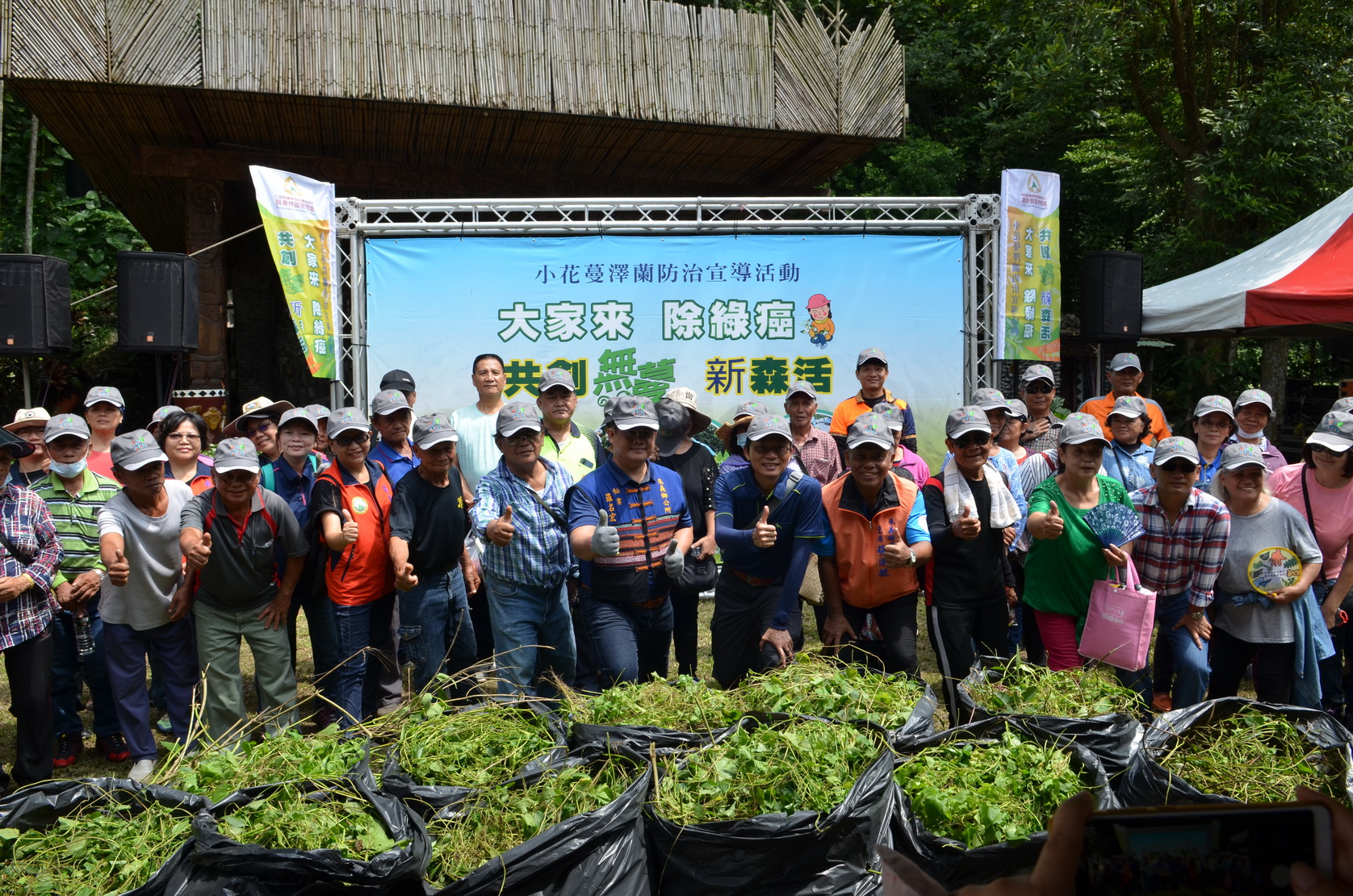 有「綠癌」之稱的小花蔓澤蘭,其快速生長擴散的特性,嚴重危害本島生態多樣性,109年9月5日屏東林管處分別於轄內各工作站辦理4場防治宣導活動,主場在來義鄉喜樂發發森林公園,另於旗山區的中寮山瞭望台廣場、六龜區藤枝林道4K -5K 及牡丹鄉大梅溪生態示範區亦同步舉辦。總計近 400位民眾熱情支持參與,當日共移除了501公斤的小花蔓澤蘭植體。 來義鄉喜樂發發森林公園、大梅溪生態示範區分別位處二峰圳上游及大梅溪流域;中寮山與藤枝林道則位處中低海拔山區,林相生態豐富完整,防治外來入侵種應涵蓋上至下游整體環境,以避免外來種逐漸擴張,改變原有生態環境,此次活動更結合屏東縣來義鄉公所、屏東縣政府消防局第二大隊來義分隊、喜樂發發吾社區、丹林社區、旗山中寮社區、桃源寶山社區、牡丹大梅社區等,齊心合作努力,共同維護當地自然資源。 活動現場外除了有入侵物種習性及防治方法的介紹之外,也讓民眾一同動手除蔓,雖然得汗流夾背使盡全身力氣才能拔除小花蔓澤蘭,卻也樂在其中,同時更感受到外來入侵種防治工作的不易。現場也有DIY等體驗活動,透過有趣的互動遊戲加深民眾生態保育觀念,也進一步的瞭解林務工作及防治入侵外來種的重要性。 活動最後屏東林管處贈送台灣原生苗木蘭嶼羅漢松、野牡丹、月橘、厚葉石斑木等樹苗,很快就兌領完畢,希望民眾能帶回栽植在居家周圍,一同建構自然美麗的綠色家園環境。 屏東林區管理處家,持續共同防除外來入侵植物,打造無蔓森活淨土。