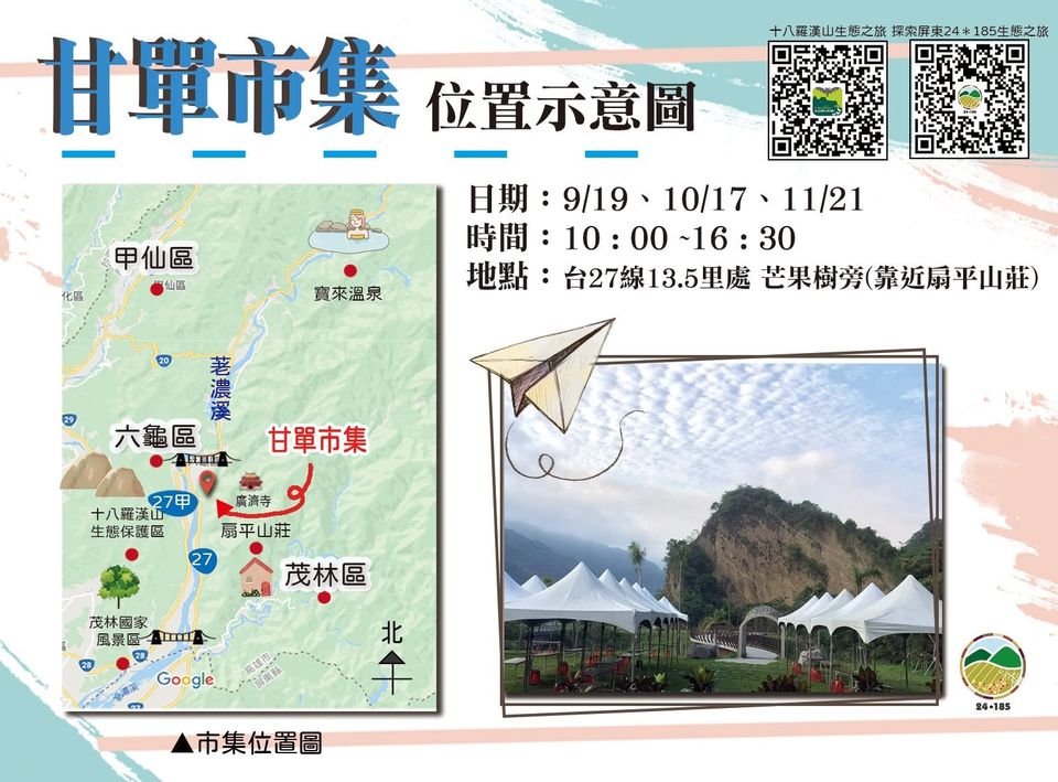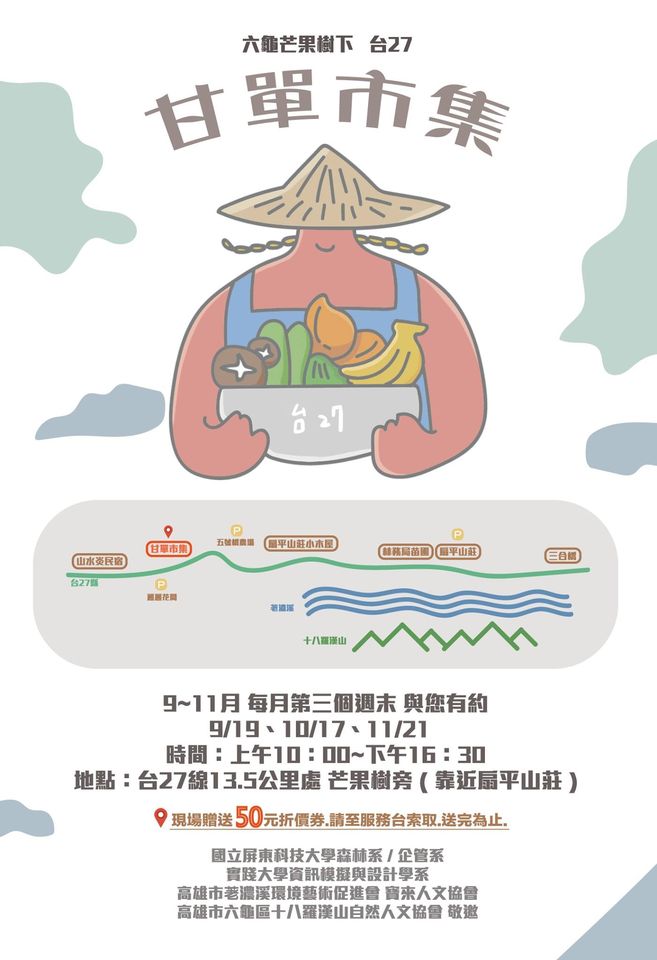 秋高氣爽,在這徐徐微風下伴著草地、音樂和在地農特產度過輕鬆悠閒的周末實在非常舒服!今年9月19、10月17日、11月21日在高雄市六龜區多多鳥濕地教室(靠近扇平山莊的台27線13.5公里處),以藝術與在地為主題的甘單市集正式開始了!市集結合手作、烘焙、料理、鮮果、飲品和公益六大類型的在地25個攤位,另邀請在地手炒茶老師傅現場示範”鐵砂掌”般的手炒茶技藝,邀您現場體驗炒茶與品茶,一邊逛市集,還可欣賞秋季的荖濃溪河畔,遠眺十八羅漢山自然保護區,更增添秋季的恬靜氛圍。 甘單市集的概念如同它的名稱一樣很”簡單”,台灣到處有各式各樣的市集活動舉行,有別於制式的擺攤硬體設備,甘單市集利用攤商本身的創意布置攤位,挑選六龜在地富含美學的場域「多多鳥濕地教室」舉辦,結合藝術、文創與在地小農的甘單市集油然而生。市集活動豐富,除擺攤外另有音樂演出如提琴表演、詩歌合唱、十指連彈和音樂教室,DIY與體驗活動有手炒茶、蜂蠟護唇膏DIY、涼拌木瓜絲和手做點心,現場提供濕地生態教育解說,體驗內容以在地產物和生態互相扣合。為了更符合文創的主題,各攤位更在事前參加擺攤美學課程,發想更多擺攤創意,現場也舉行攤位票選活動,誰是你心中最美的攤位?誰又會贏得比賽獲得最美攤位的殊榮與獎狀?一切都等你來投票決定!此外還有集點換贈品、森林魔法師大地遊戲和浪浪結紮義賣等活動,精彩可期。 甘單市集在今年度總共舉辦三場,分別於9、10和11月的第三個禮拜六舉行,展現最在地的小農產品、豐富的音樂演出與DIY活動、友善環境的店家與老師傅炒茶文化傳承,不論你是文藝青年、攜家帶眷或是樂齡都歡迎入席,希望大家一起來感受台27線的人文與慢活。 日期:9/19、10/17、11/21(每個月的第三個周末) 時間:10:00~17:00 地點:台27線13.5公里處,搜尋扇平山莊以北200公尺 【參考資料】 甘單市集參考影片https://reurl.cc/6lLL2V 二、 十八羅漢山生態之旅FB粉絲團https://reurl.cc/KjXXje
