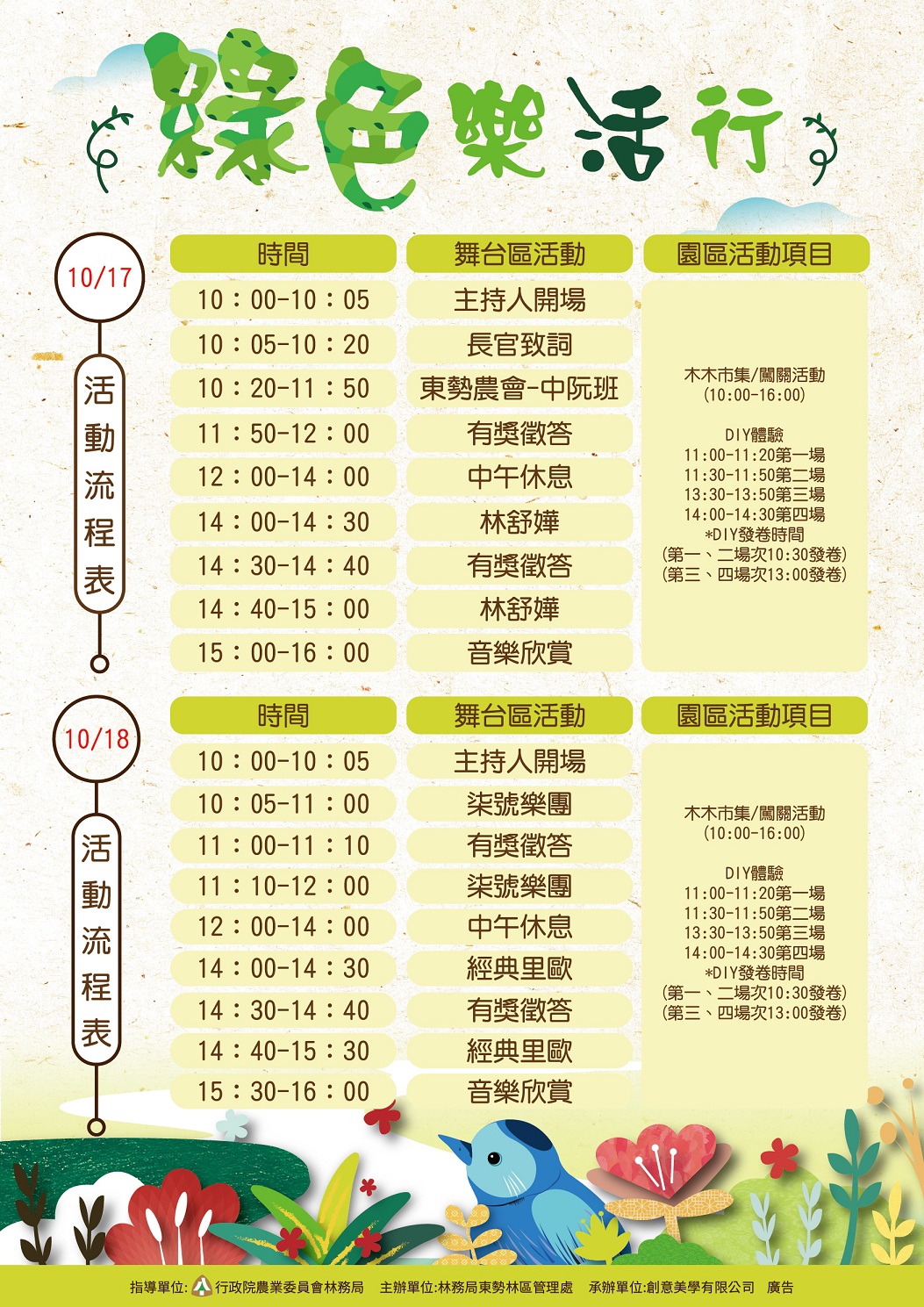 連假期間享受太多精緻美食了嗎?快把握這個周末來東勢踏青、健走、森呼吸吧!林務局東勢林管處將在10月17、18日(星期六、日)於東勢林業文化園區舉辦「綠色樂活行」主題活動,邀請大家來到園區中,一起漫步森林、認識林業文化,不僅如此當天更有豐富的活動體驗等著你喔! 本月的「綠色樂活行」主題活動,將在第一天(10/17)提供2梯次的園區導覽健走活動,結合園區生態環境及林業文化歷史介紹,由志工老師帶領遊客健康漫步享受自然、探尋園區林業史跡、感受昔日風華;兩天活動中還有友善環境的「木木市集」、免費限量的森林DIY體驗、集章闖關活動,以及精彩的音樂藝術表演,希望讓遊客能透過輕鬆有趣的方式來認識森林多元的服務價值。 東勢林業文化園區是兼具自然生態、林產工業史蹟保存、木雕藝術展示的多元化休憩及環境教育場域,非常適合全家大小放鬆玩樂、解放生活壓力,這個假日林務局東勢林區管理處為您打造富含知識與樂趣的主題活動,歡迎大家揪團來趟綠色樂活行吧! ※東勢林業文化園區108-109年系列活動網址 http://forestinmylife.mystrikingly.com ※東勢林業文化園區粉絲專頁網址 https://www.facebook.com/DongshihForestryCulturePark/