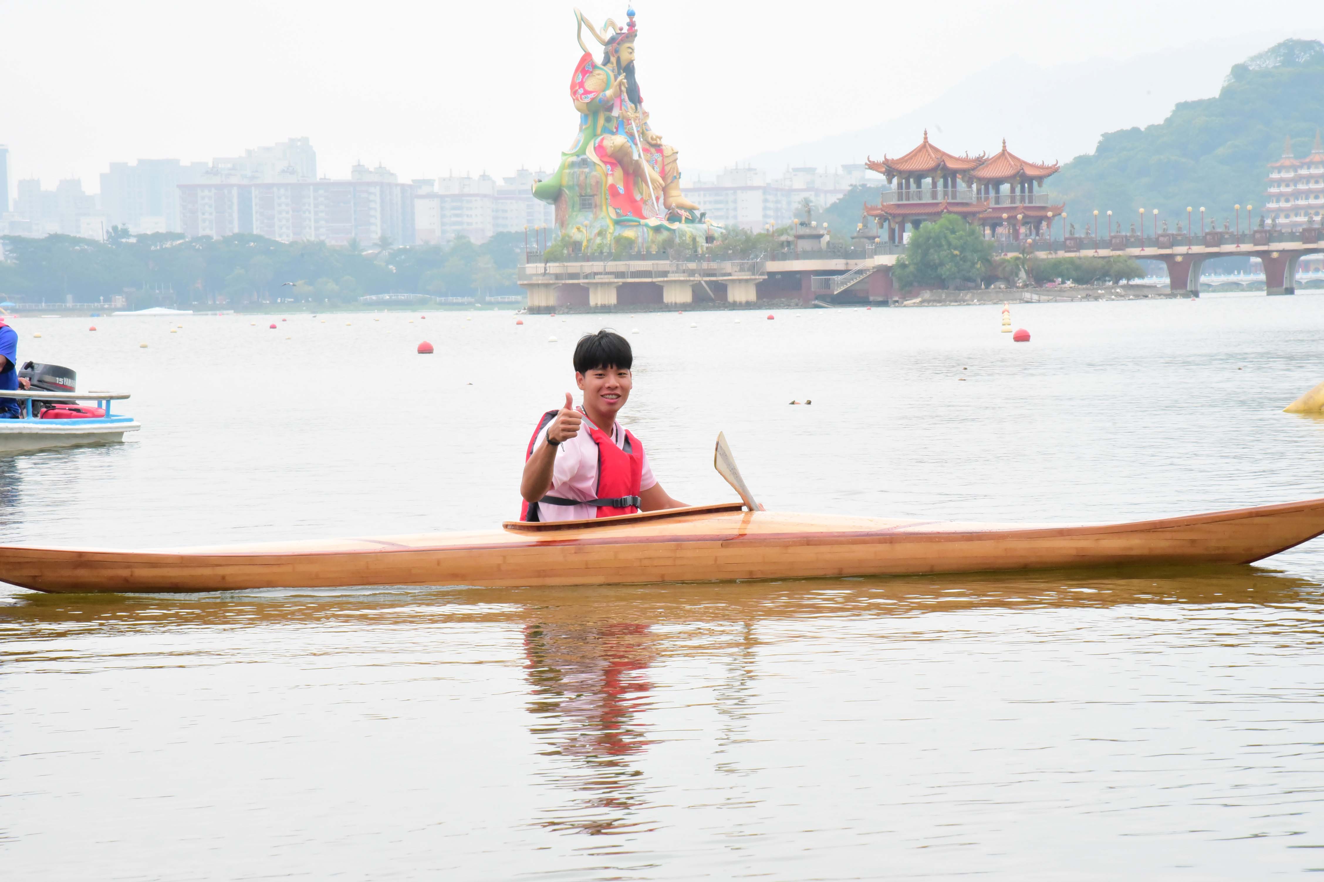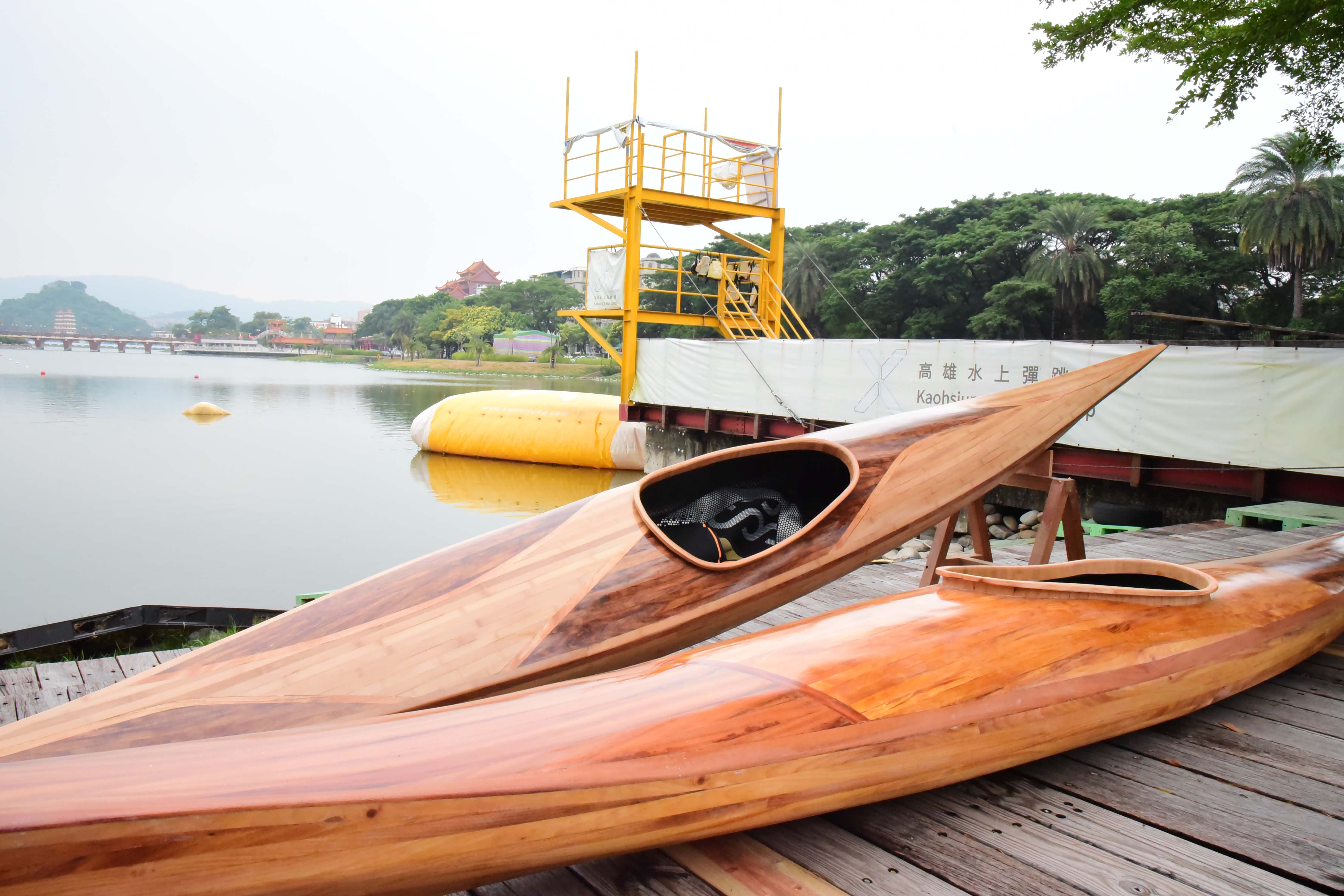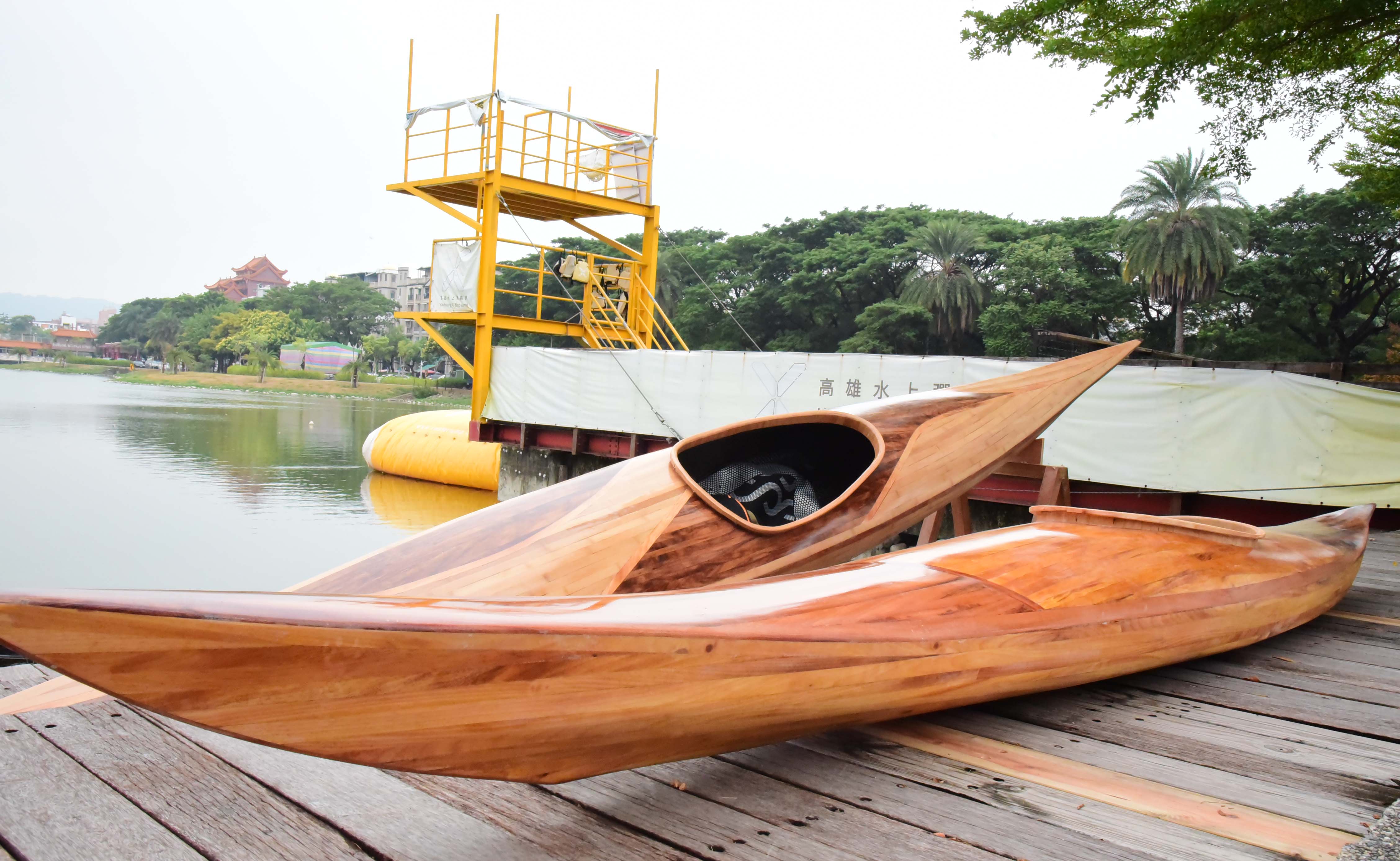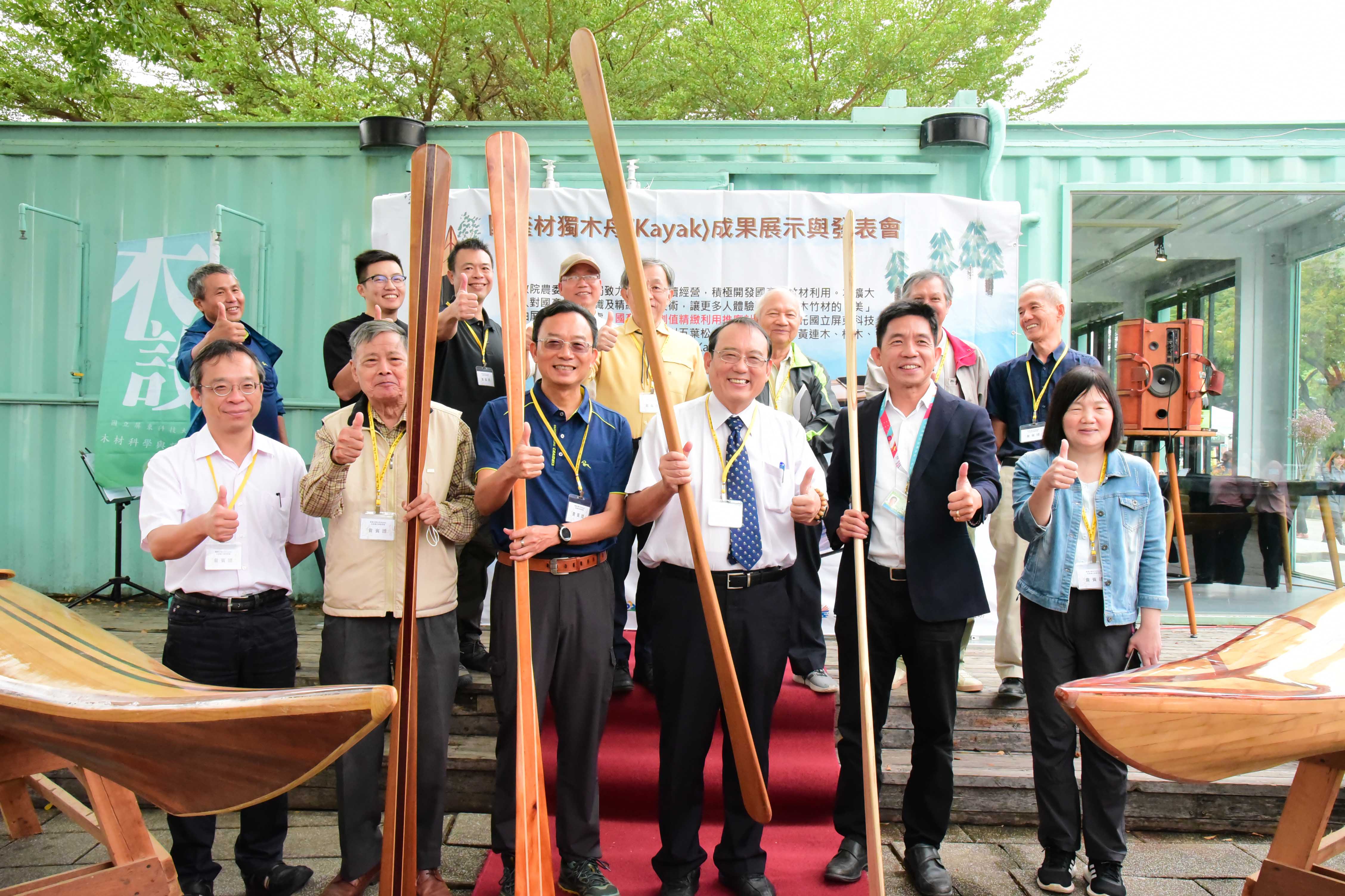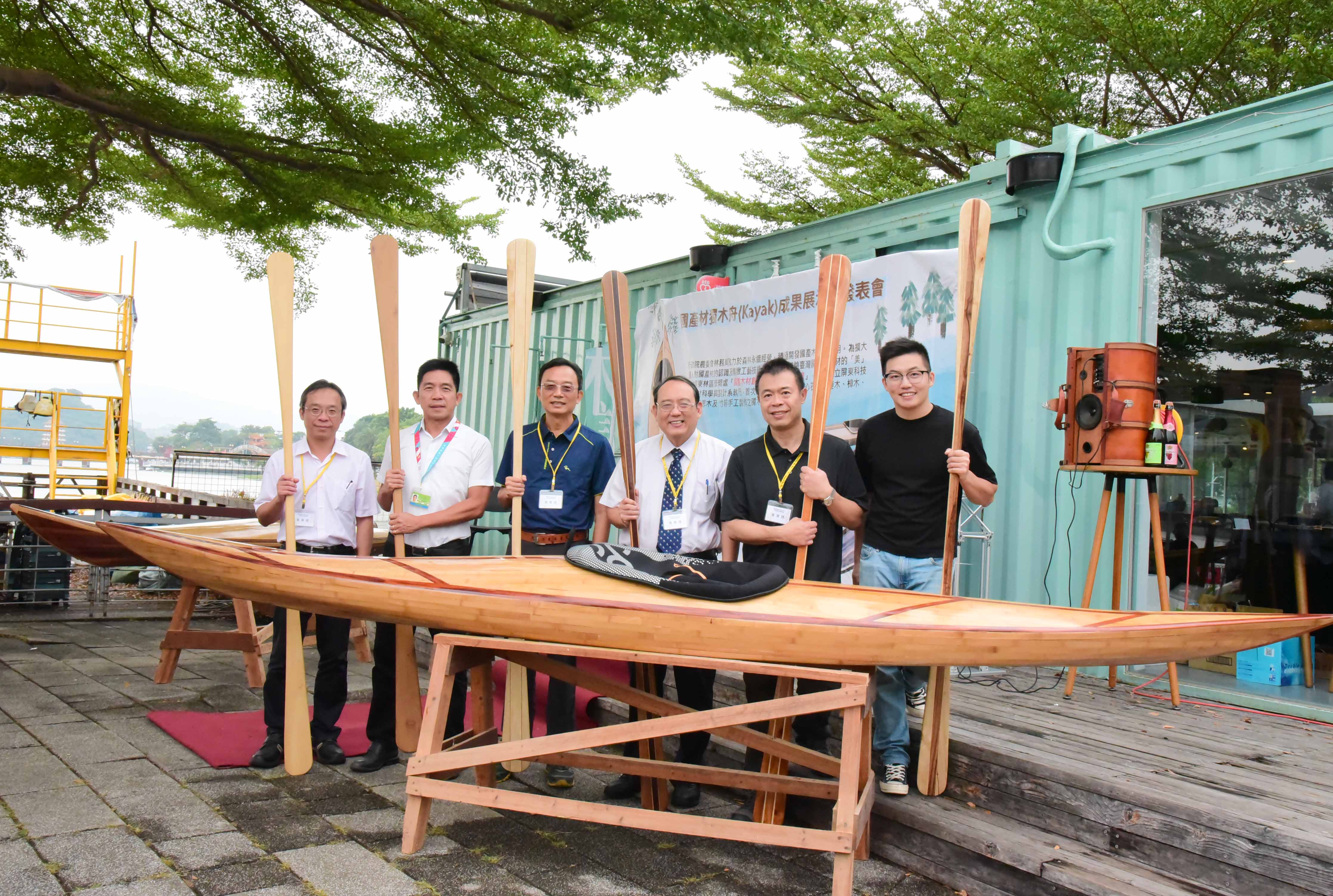 林務局屏東林區管理處與屏科大木設系合作「國產木材創值精緻利用推廣計畫」,致力於森林永續經營與木竹產業發展,積極推廣國產優質木材的多元利用,以及擴大國人對國產木竹材自然美之體驗與認識。首次以五葉松、櫸木、烏心石、黃連木、樟木、牛樟、相思木及竹等手工製作之獨木舟(Kayak),研發出在地化、精緻、高質之國產木材作品。屏科大木設系龍暐助理教授帶領系上碩士班研究生余浤銓經歷一年半的研究發展,利用木材特性,透過精緻、細緻、機制具備的特色下設計出國產木竹材質獨木舟,今日(10/23)在高雄蓮池潭舉行國產材獨木舟成果展示與發表會,讓民眾能更深入了解國產材如何以最精緻的手法創作出高品質的產品,同時也能更加熟悉台灣自產的木材特色。 屏東林區管理處張偉顗處長表示:「林務局推廣國產材應用,提供國內木材市場需求同時加強木材生產自給率,獨木舟製作不僅為南台灣活力象徵,永續性經營生產的國產材料更是具環境面、經濟面與社會面等意義,藉由國產材的紋理、色調選材設計出獨一無二、輕量強化之複合產品,完美融合美學與科學的水上工藝品。期望未來能持續結合產官學各界一同推廣國產材的精緻工藝技術與發展。」屏科大戴昌賢校長說:「屏科大致力推動跨領域特色課程,在獨木舟的設計製造上,不只有木設系、同時還需要加入森林系、休運系,同時也需要導入工程方面的專業人才,以流體力學概念,設計出最適合在海上破浪的舟體,未來更希望能透過校內跨系合作,不斷實驗、精進,朝向客製化休閒運動的器材開發,打量國人精準健康的優質生活。」 本次設計製作的獨木舟從國產材收集、製材乾燥、備製、設計配置、工法選擇與測試完工等繁複工序,皆由木設系余浤銓同學獨立製作三艘舟體,依木材樹種特質、木紋理、色調表現、不同拼板工序對次組合,設計出具美學品質、獨一無二的個性化圖案。加上曲面幾何加工、輕量強化複合技術,設計出流線型的船身達到最佳巡航控制性。完美融合美學以及科學的水上工藝品。期望能推廣國產材的精緻工藝技術與發展,有助於幫助台灣林業和森林保育邁向永續發展。 而隨著社會與經濟的成長,國人的生活品質從理性的滿足,提升至追求精神與心靈的層面。因此,人們為陶冶性情與抒發情感,而往往選擇利用戶外休閒體驗來增添生活中的樂趣。這次的展示活動邀水上活動專家進行划船示範,藉此結合台灣目前推廣國人的水上戶外活動。也期盼能讓人有獨處在台灣宏偉森林之中,優游於台灣寧靜水域的感覺,可謂山、水、人的結合體驗。