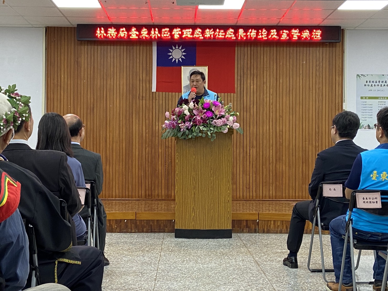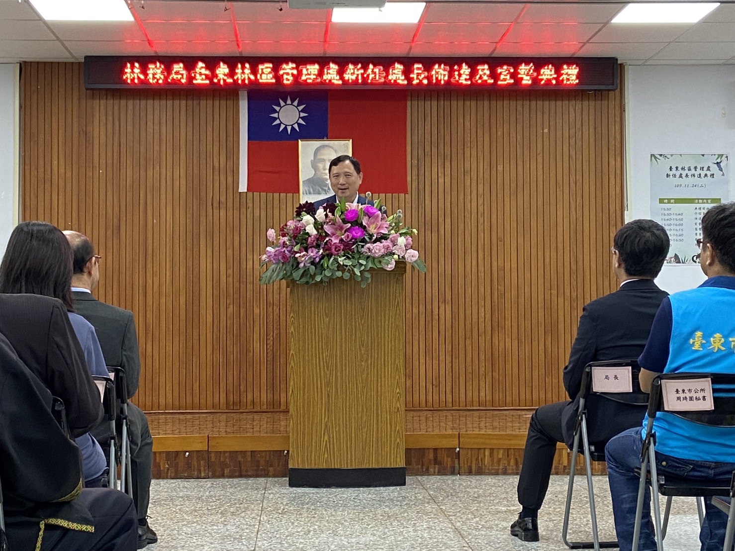 林務局臺東林管處新任處長佈達典禮於今(24)日下午3時30分在林管處3樓大禮堂舉行,由農業委員會林務局林華慶局長親臨佈達。臺東處原任處長劉瓊蓮於109年9月3日退休後,新任處長由該處副處長吳昌祐調陞。 新任處長佈達典禮於24日下午3時30分準時於該處3樓大禮堂舉行,現場出席貴賓雲集,包括行政院東部辦公室洪宗楷執行長、劉櫂豪立法委員辦公室張其旭執行長、王志輝副縣長及縣府團隊、林琮翰副議長及多位縣議員、農委會派駐臺東地區各機關首長代表及在地鄉鎮市長、部落社區夥伴、NGO、學界、農漁會總幹事等計有近80餘位貴賓出席共襄盛舉,祝賀吳昌祐處長上任。 新任處長吳昌祐,國立中興大學農藝學系博士畢業,歷任臺東處技士、技正、課長、林務局簡任技正及臺東處副處長等職,學經歷完整豐富。吳處長除了具備林業及農業推廣相關專長外,並於臺東林管處及林務局服務期間,在各級長官指導下推動及辦理各項林業重點工作如:森林保護、生態保育、人工林經營及國產材產業輔導及國土生態綠網等計畫。吳處長領導、溝通及協調能力極佳,除帶動同仁們在工作上發揮團隊合作外,也積極與中央派駐臺東地區各單位及地方行政機關建立良好跨域合作關係,在社區及部落輔導工作上也著力甚深。相信在吳處長豐富學養及務實作風的領導下,定能在推動臺東地區森林資源經營管理及維護友善森林環境的理念下順利執行各項業務,為實現兼顧生產、生活及生態的「永續林業」目標上,帶領團隊為這片家鄉的森林、土地及共同努力的夥伴們貢獻心力。