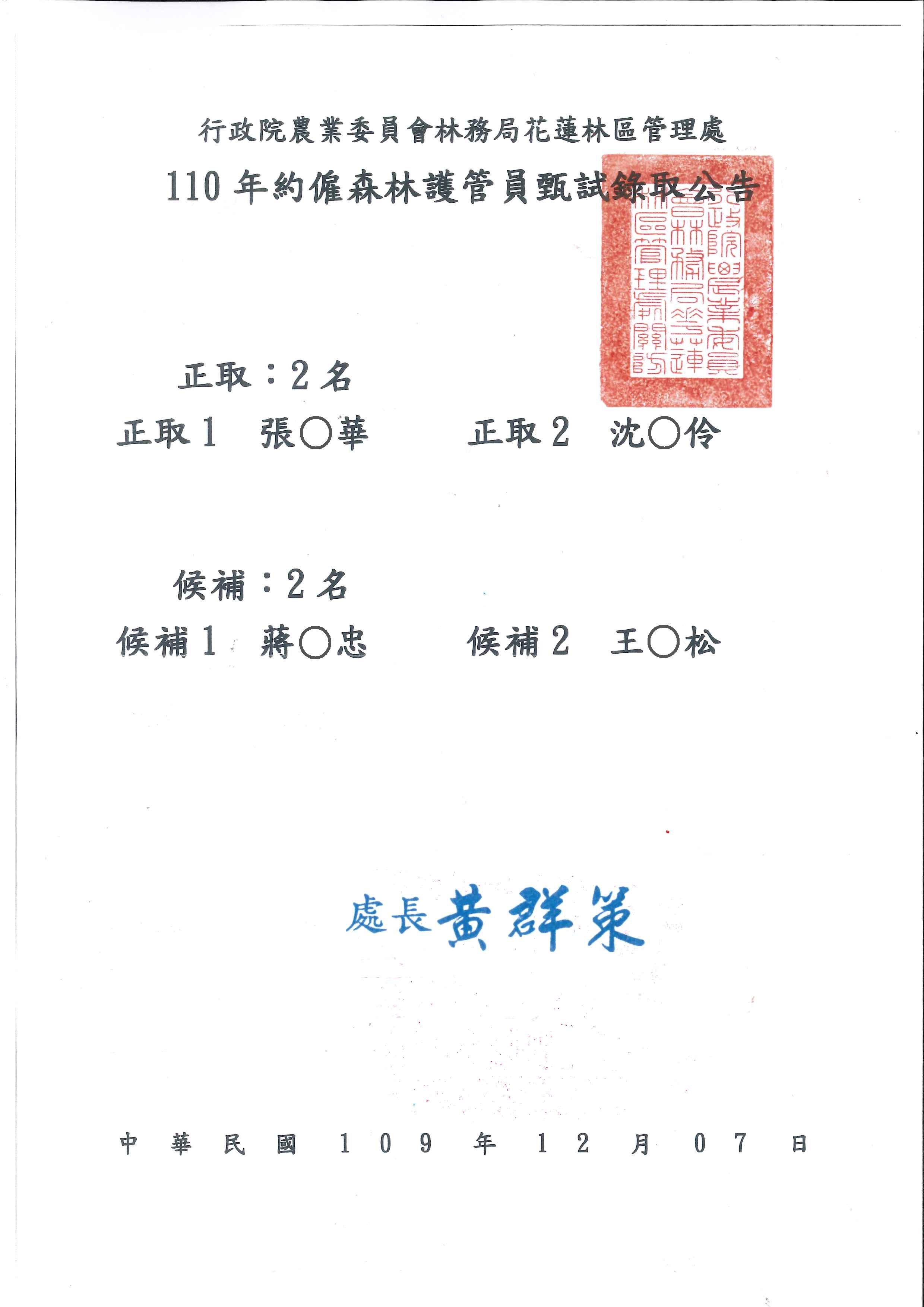 花蓮林區管理處110年約僱森林護管員甄試考試,12月5、6日登場,經過激烈的術、學科競爭後,正取2人、備取2人,錄取率為7.4%,為守護森林注入新血,榜單今(7)日公告於林管處大門口公布欄、臉書專頁及官網,歡迎查詢。 林管處指出,本次甄試共33人報考、符合資格29人,實際到考27人,其中原住民考生22人,一般考生7人。正取森林護管員中,1位具原住民身分,顯示花蓮地區原住民考生應考實力堅強;另一位錄取者為女性,負重、檔車考試都難不倒,表現優異。錄取第一名的張世華(44歲,阿美族),在台東林管處擔任職務代理已逾三年,熟悉林業業務,對即將投入森林護管工作,信心滿滿。 林管處長黃群策表示,竭誠歡迎2位生力軍加入守護山林的行列,接下來將有一系列完整的受訓,期待生力軍們承擔起守護國土的重責與榮耀,並加強與原住民族人的溝通,促進共同合作,齊心向森林資源共管的目標邁進。