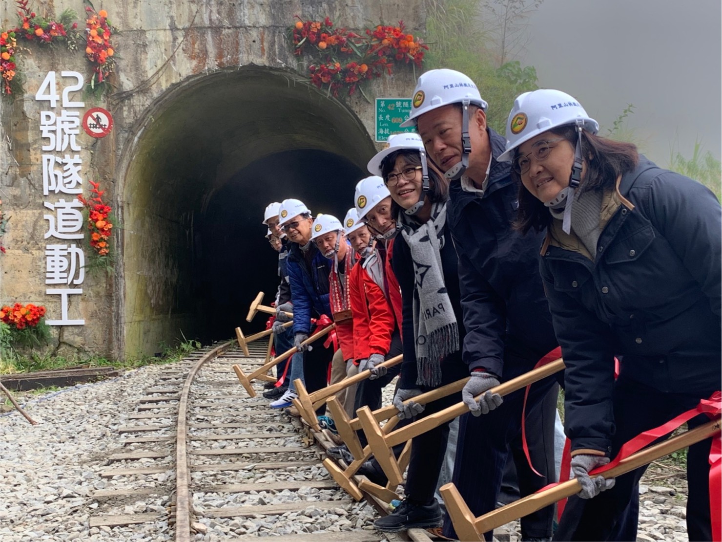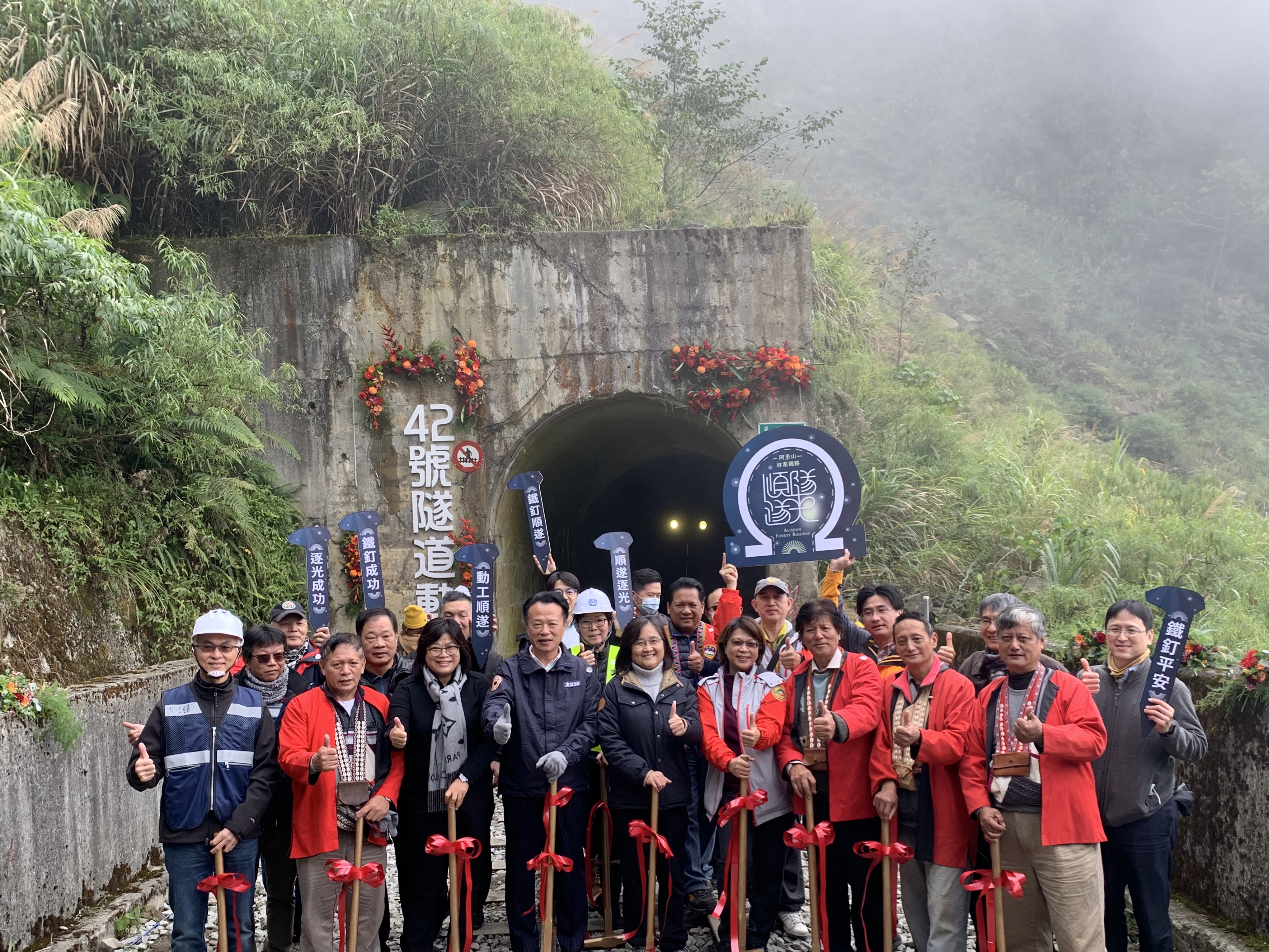 林務局阿里山林業鐵路及文化資產管理處(林鐵及文資處)於今(8)日辦理42號隧道動工典禮,由林務局林澔貞副局長、王美惠立委、嘉義縣政府翁章梁縣長、林鐵及文資處黃妙修處長、嘉義縣阿里山鄉鄉長杜力泉、嘉義林區管理處鄭鈞謄秘書、鄒族特富野社汪義福頭目、鄒族特富野社長老阿里山鄉獵人協會高德生理事長、來吉部落梁崇效主席、十字村許瑞文村長及各界代表共同見證歷史時刻。 兼顧環境保護與文化保存 阿里山鐵路 42 號隧道復建工程採尊重自然生態與環境永續之減法工程為規劃原則,經地質鑽探成果工址為高強度岩類,因此以迴隧隧道方式經過取代明隧道與橋梁劃過崩塌地,銜接既有43號隧道,減少洞口開挖,並利用既有道路出入,不新闢施工便道,達到最小地貌與地景擾動、兼顧安全及自然景觀還原等多重目標。 隧道開挖所產生土石方量利用毗鄰既有土石堆置場,以分階方式進行回填及噴植原生草種進行復育,避免土石外運造成空氣、噪音及交通影響。 保存既有42號隧道原貌,工程竣工後,以不定期舉辦主題列車方式進行文資景點導覽與解說,並規劃設置景觀解說平台,做為歷史文化教育場所。 鄒族傳統祈福 順遂逐光 動工典禮場地以既有42號隧道東洞口作為背景,隧道內點亮如機關車頭燈的溫暖黃光,象徵隧道復建後火車即將駛出,並利用阿里山鐵路路線的枕木舖設作為活動舞台,周邊也展示維護路線安全所使用砸道機、起道機、軌距尺、十字鎬…等難得一見的器具。 祈福儀式由鄒族特富野社汪義福頭目、鄒族特富野社陳明川長老、石明華長老、安金立巫師及來吉部落梁崇效主席面對東邊以豬肉、自釀酒、糯米年糕等祭祀用品,誠心用鄒族母語向山神說明工程即將進行,過程中並邀請林務局林澔貞副局長、翁章梁縣長、王美惠委員,以及林鐵處黃妙修處長向山神敬酒,祈求山神保佑施工人員出入安全,工程順利完工。 隧道全長1,104公尺 預計112年全線通車 林務局林澔貞副局長表示,98年8月8日的莫拉克風災,重創阿里山林業鐵路,全線出現421處毀損,陸續修復後,42號隧道修復是當時最後一件復建工程,104年9月全線試運轉成功,沒想到同年9月28日又因杜鵑颱風造成42號隧道崩塌。今天工程可以順利動工,要感謝黎明工程顧問股份有限公司協助進行復建規劃與工程設計,景丰科技股份有限公司協助進行環境影響評估,而利德工程股份有限公司是完成屏遮那隧道復建工程的營造廠商,當時榮獲中華民國隧道協會評定為優良隧道工程,這次勇於承擔林業鐵路全線通車的最後一哩路。 嘉義縣政府翁章梁縣長表示,期待以久的42號隧道動工日子終於來臨,阿里山鐵路是嘉義縣國際級觀光景點,沿線擁有豐富的文化底蘊,也促進了山村經濟發展,更創造出國人的共同記憶,等待了這麼多年,終於盼到林鐵全線通車的具體時程,期待112阿里山鐵路全線通車,展現林鐵永續發展的新價值。 立法委員王美惠表示阿里山小火車是台灣驕傲的標誌,並分享出國旅遊只要說阿里山小火車,必能獲得讚賞,非常期待阿里山林鐵的全線通車,更高興能跟所有嘉賓一起見證這歷史性的一刻。 林鐵及文資處黃妙修處長表示,42隧道復建工程,雖然經過ㄧ波(杜鵑災害)三折(部落會議、環境影響評估、文化景觀審議),但卻也處處有溫暖,感謝來自部落、中央與地方、立委、專家學者和民間團體的一路支持。非常感謝汪頭目帶領族人向山神祈福,工程必定順利。今天特別以順遂逐光為主軸,邀請58位對阿里山鐵路有重要貢獻的貴賓,共同見證這歷史性的一刻。也請繼續給我們協助與督促,期待111年底可以如期如質完工,並在112年全線通車。 鐵釘成功 活動當天,林鐵及文資處邀請出席的貴賓表代手拿金鐵鎚釘上保護林業鐵路軌道安全的「道釘」,象徵工程鐵釘成功,也代表著工程團隊將顧好每個小細節,讓工程如期如質完工。