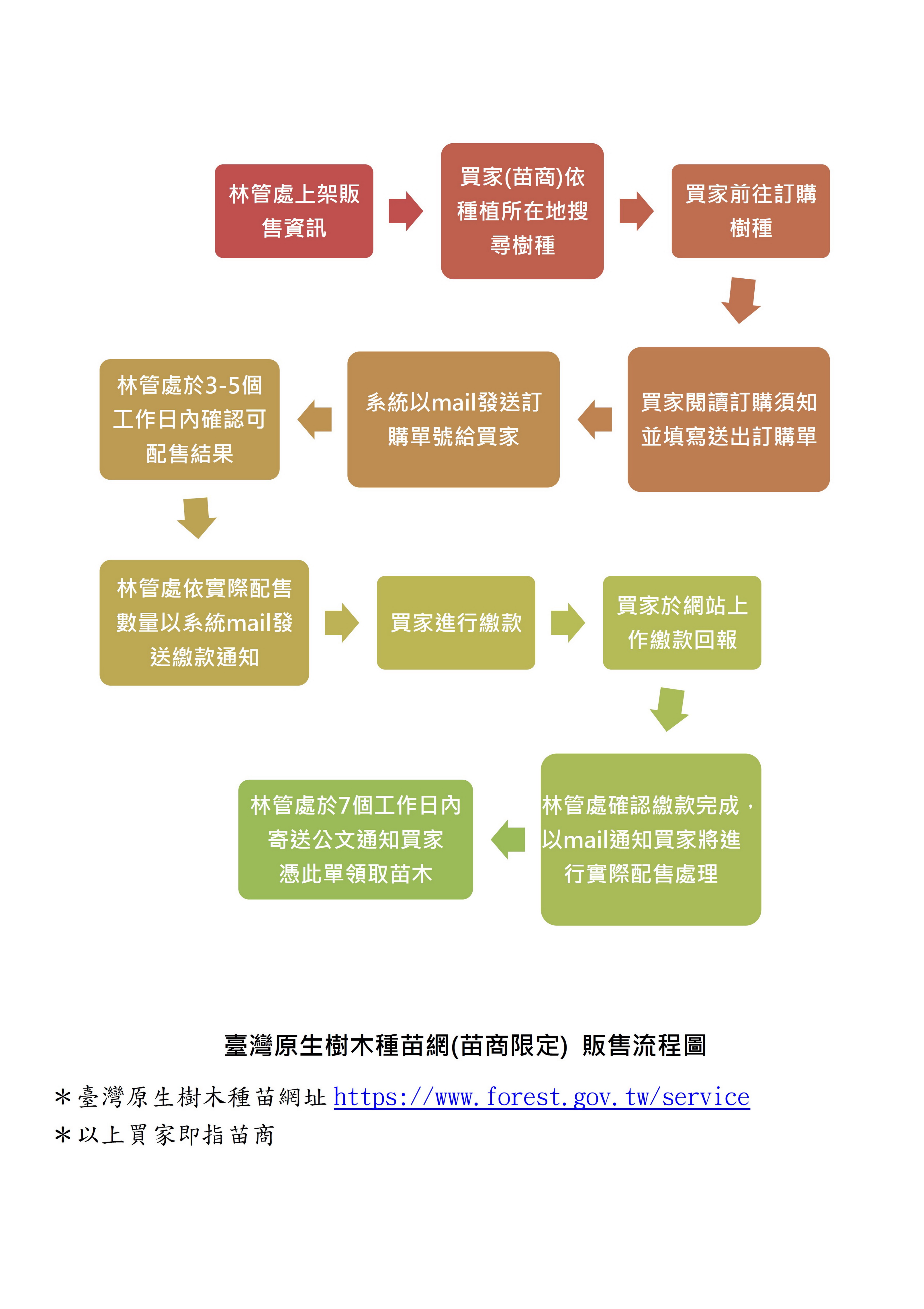 恆春半島有許多具市場潛力的原生樹種,為推動原生樹苗產業化,屏東林區管理處於「臺灣原生樹木種苗網」開放育苗業者採購,販售樹種包括恆春山枇杷、鐵色、蓮葉桐、繖楊及黃心柿等5種樹種,販售期間至110年2月24日止,數量有限,歡迎景觀、園藝業者購買,齊心推動原生樹苗產業化。 育苗業商們如有意願加入原生樹木育苗推廣行列,可由林務局全球資訊網頁,向下捲動至為您服務區塊,尋找「臺灣原生樹木種苗網」圖示,或直接輸入網址(https://theme.forest.gov.tw/forestplant)進入。為符合適地適木,請依據栽植地點選取販售林管處,例如栽植地點在屏東縣或高雄市,電腦系統會引導進入屏東林管處販售區。該頁面操作設計與一般購物系統相似,簡單操作;林務局屏東林管處接獲訂單後,依序以3-5個工作天,透過電子郵件通知買方確認數量、金額及繳款等細節(詳如販售流程圖),買方依指示繳款及接獲公文通知後,即可至墾丁苗圃取得恆春半島特色原生植物種苗。 屏東林管處所培育之種苗,均是採種後育成之實生苗,並以成本價販售,希望透過業商的專業育苗能力,進行扦插、嫁接、高壓等育苗技術,將這些極具特色的臺灣原生植物普遍繁衍,並配合政府推廣原生植物政策,逐步媒合各需求端,以建構原生植物產業鏈。