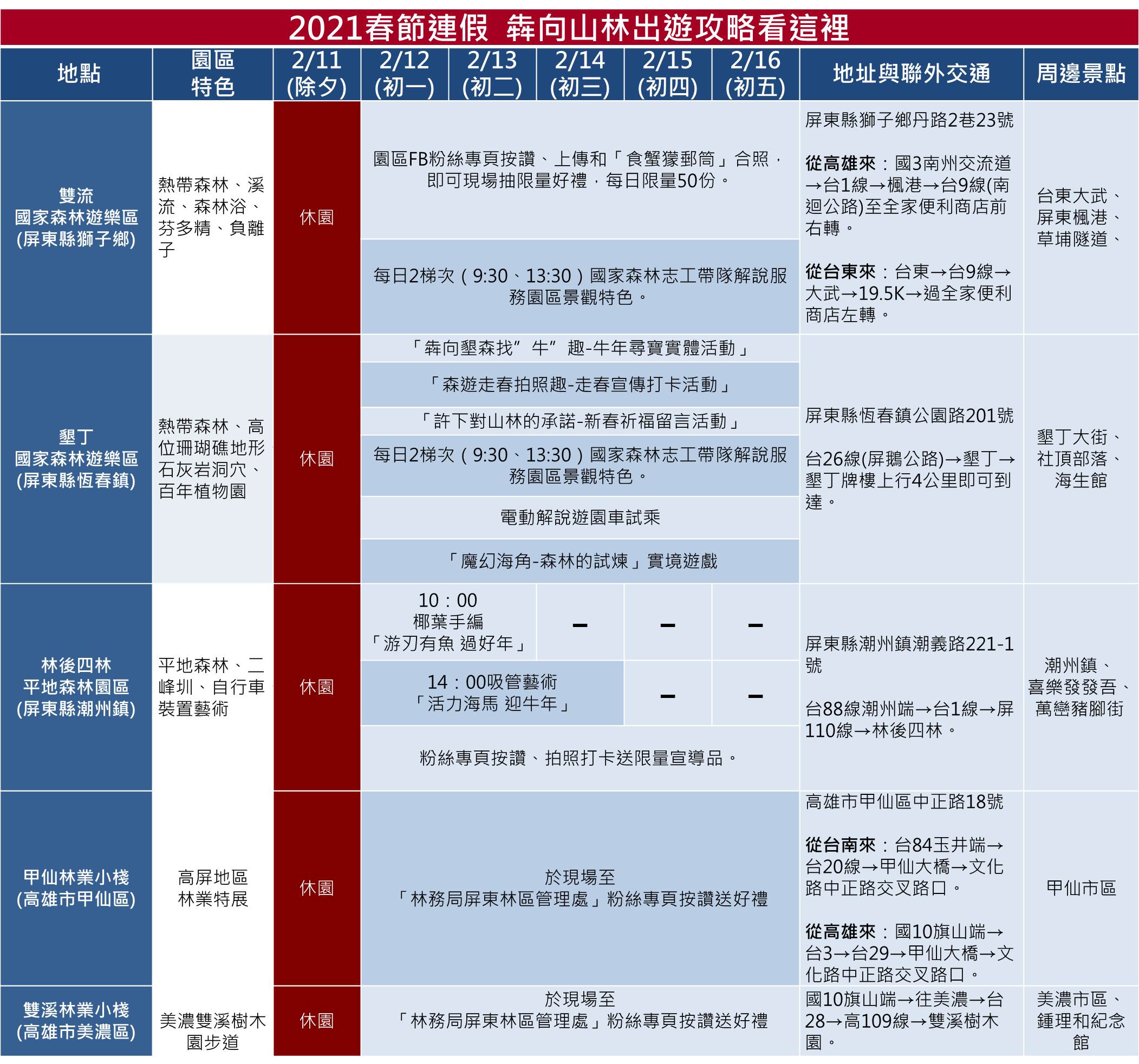 春節假期即將到來,不想去熱門景點人擠人嗎?屏東林管處所轄的墾丁、雙流國家森林遊樂區、林後四林平地森林園區、甲仙小棧與美濃雙溪小棧都準備了一系列親近大自然的春節活動,讓您越玩越健康! 屏東林管處今年春節除了推出打卡換獎品活動及免費導覽解說外,各遊樂區都有不同的春節限定活動。墾丁國家森林遊樂區火力全開,推出全新的「魔幻海角—森林的試煉」實境遊戲,讓您體驗不一樣的魔幻森林,並在2月12日~2月20日試辦「電動解說遊園車」,提供遊客免費試搭乘,更推出「犇向墾森找『牛』趣」、「森遊走春拍照趣」及「許下對山林的承諾」等活動;此外,雙流將在春節期間首次公開超可愛的「食蟹獴造型郵筒」以及特色明信片,不僅可現場投遞、合照,還可再抽好禮!林後四林平地森林園區在春節期間也結合在地社區推出椰葉手編「游刃有魚 過好年」、吸管藝術「活力海馬 迎牛年」等手編DIY活動,還不知道春節去哪裡出遊嗎?犇向山林就對了! 為了防範新冠肺炎疫情,屏東林管處各森林育樂場域已啟動人潮分流措施,並定時進行清潔消毒,請各位遊客保持社交距離,室內空間以及搭乘電動遊園車時請配戴口罩,希望大家共同努力!防堵疫情! 相關資訊請追蹤: 墾丁國家森林遊樂區FB粉絲專頁(https://www.facebook.com/ktforestarea) 雙流國家森林遊樂區FB粉絲專頁(https://www.facebook.com/shuangliou.forest) 林後四林平地森林園區FB粉絲專頁(https://www.facebook.com/linhousihlin)