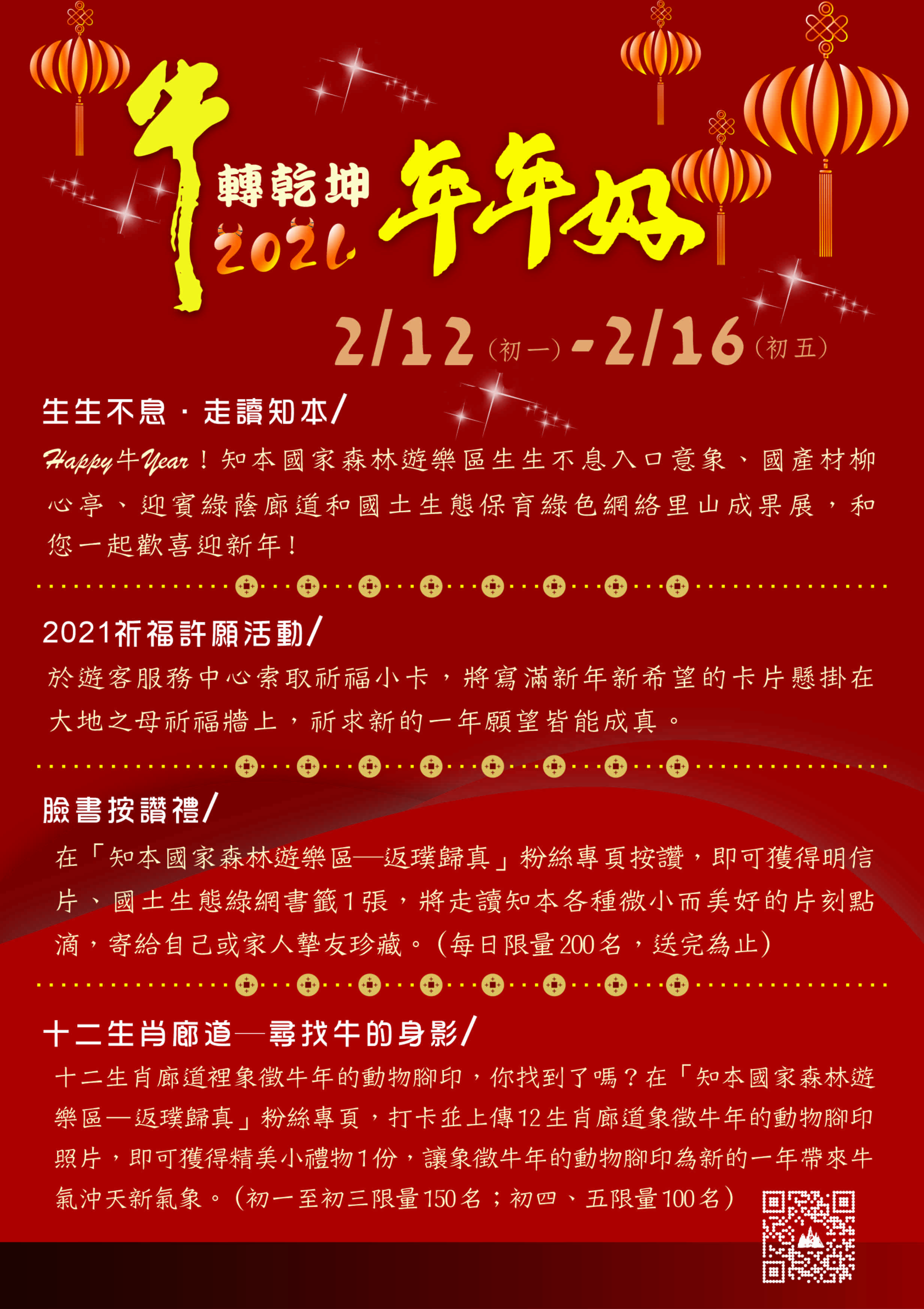 春節期間將舉辦「2021祈福許願活動」,遊客可於遊客服務中心索取祈福小卡,懸掛在大地之母祈福區,祈願新的一年願望皆能成真。此外,還有「國土生態保育綠色網絡建置」展覽、在「返璞歸真」臉書粉絲專頁按讚,即可獲得明信片、書籤1張。在十二生肖廊道尋找象徵牛年的動物腳印,拍照上傳「返璞歸真」粉絲專頁打卡,即可獲得精美小禮物1份,讓您在新的一年好運犇來。(初一至初三限量150名;初四、五限量100名) 。
