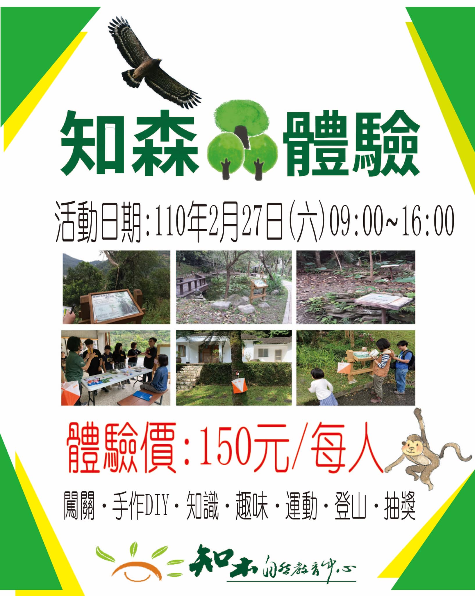 「知森體驗」提供一般民眾、親子團體及入園遊客接觸森林環境教育的機會,透過自導式的活動安排,能更深入探索、瞭解、接觸森林資源及山林智慧;活動還有原木彩繪DIY及抽獎活動。本次自導式活動手冊每份150元,邀請大家一同在森林中學習,並且在與自然互動的過程中,認識知本森林的生態環境,進而建立關切環境的行動力。