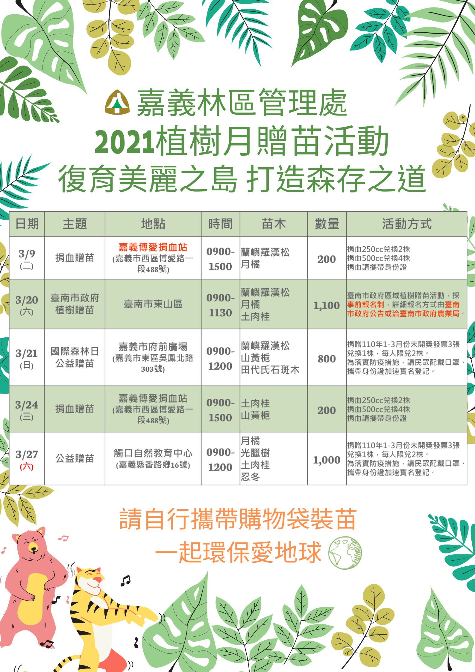 台灣擁有極高的生物多樣性,光是原生植物就達4,500種以上,其中不乏野生生物的重要棲息樹種,林務局嘉義林區管理處響應今(110)年植樹月「森存之道」主題,於3月舉辦5場贈苗活動,預計送出近3,500株苗木。首場贈苗時間訂於3月9日(星期二)上午9時00分起在嘉義市博愛捐血站,現場贈送蘭嶼羅漢松及月橘等計200株苗木,活動當日每人捐血250cc可兌換2株苗木,捐血500cc可兌換4株苗木,數量有限,送完為止。 嘉義林管處處長張岱表示,相較於外來種,原生植物更能適應本地氣候及環境,因此病蟲害發生率較低,也較容易維護管理。本次贈苗活動還有一大亮點,為響應減塑政策,贈送苗木不再使用塑膠容器,而改以竹粉及植物纖維製成之環保可分解容器,讓植樹綠美化落實環保永續。透過贈送台灣原生樹苗搭配環保容器,並請民眾自備提袋領苗,鼓勵更多民眾共同植樹、減塑護地球,進而營造野生動、植物得以生存之生態廊道,有助於人與自然的和諧共生。 嘉義林管處植樹月贈苗活動地點有3月20日(星期六)與台南市政府合作舉辦於台南市東山區台糖鐵道;3月21日(星期日)於嘉義市政府前廣場;3月24日(星期三)於嘉義博愛捐血站(捐血換樹苗);3月27日(星期六)於觸口自然教育中心等4場次,各場次活動細節及贈苗樹種詳場次表或洽嘉義林管處(電話05-2787006#374 黃小姐)詢問,苗木數量有限,送完為止。其中台南場次採事前報名制,詳細報名方式由臺南市政府公告或洽臺南市政府農業局。貼心提醒,為落實防疫措施,請民眾配戴口罩,攜帶身份證以加速實名登記。