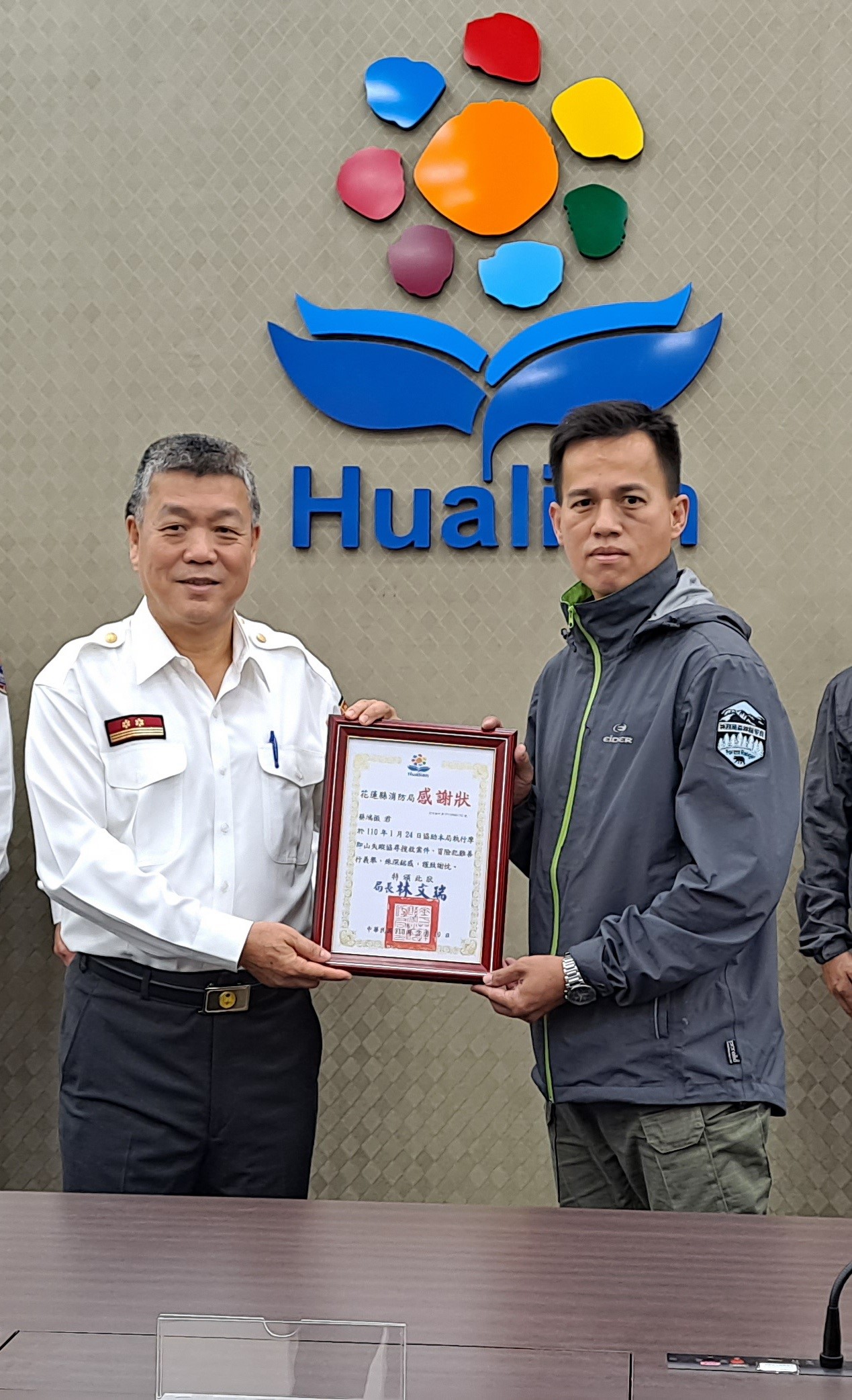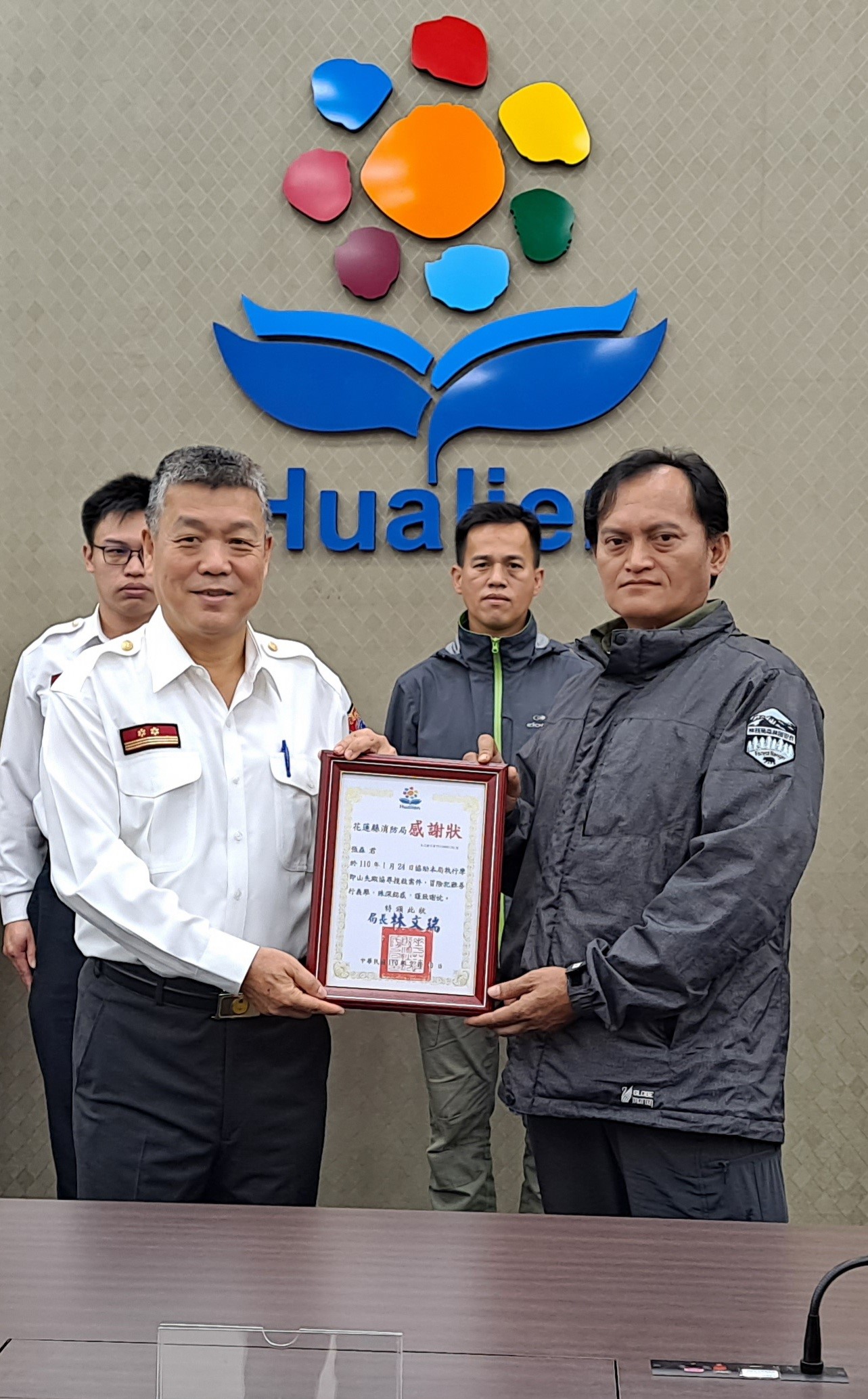 花蓮林區管理處今年1月23日支援花蓮縣消防局摩即山山難搜救任務,順利將山難者平安送下山,為表感謝,消防局於3月9日公開表揚支援搜救的二位森林護管員-張森及蔡鴻振,也為機關間橫向合作強化救難效率,再添一筆佳話。 受獎的二位護管員隸屬林管處萬榮工作站,是當地太魯閣族原住民,平時熱心公益、樂於助人,且熟悉在地環境,二人23日一接獲指示立即銷假加入救援行動,全無怨言。由於摩即山區地勢相當險峻,向來被視為魔王等級登山路線,讓搜救人員繃緊神經、不敢掉以輕心,嚴陣以待,因張、蔡二員的加入,憑藉林務工作的專業技能及原住民對傳統生態知識的了解,很順利地在1月26日下午3時14分尋獲山友,避免憾事發生,二人也因此獲消防局表揚,實至名歸。 林管處再次呼籲民眾,開放山林政策上路後,山域活動逐漸興盛,山難事件也倍增,為保自身安全,登山前務必檢視裝備是否齊全,特別是求生配備如GPS及電話等,多學習增加遭遇緊急危難時的基礎應變常識,才能輕鬆暢遊山林,享受山林之美。