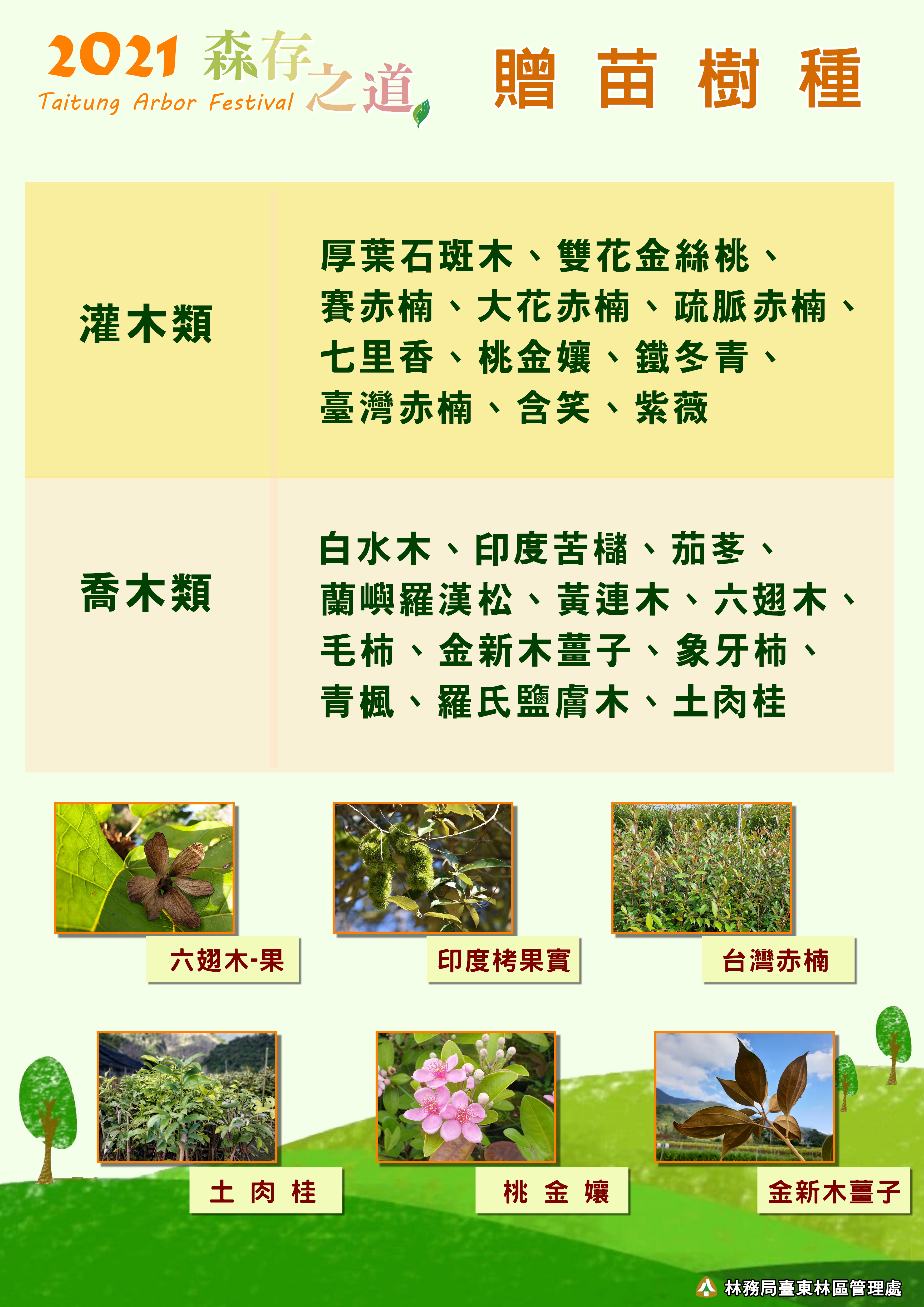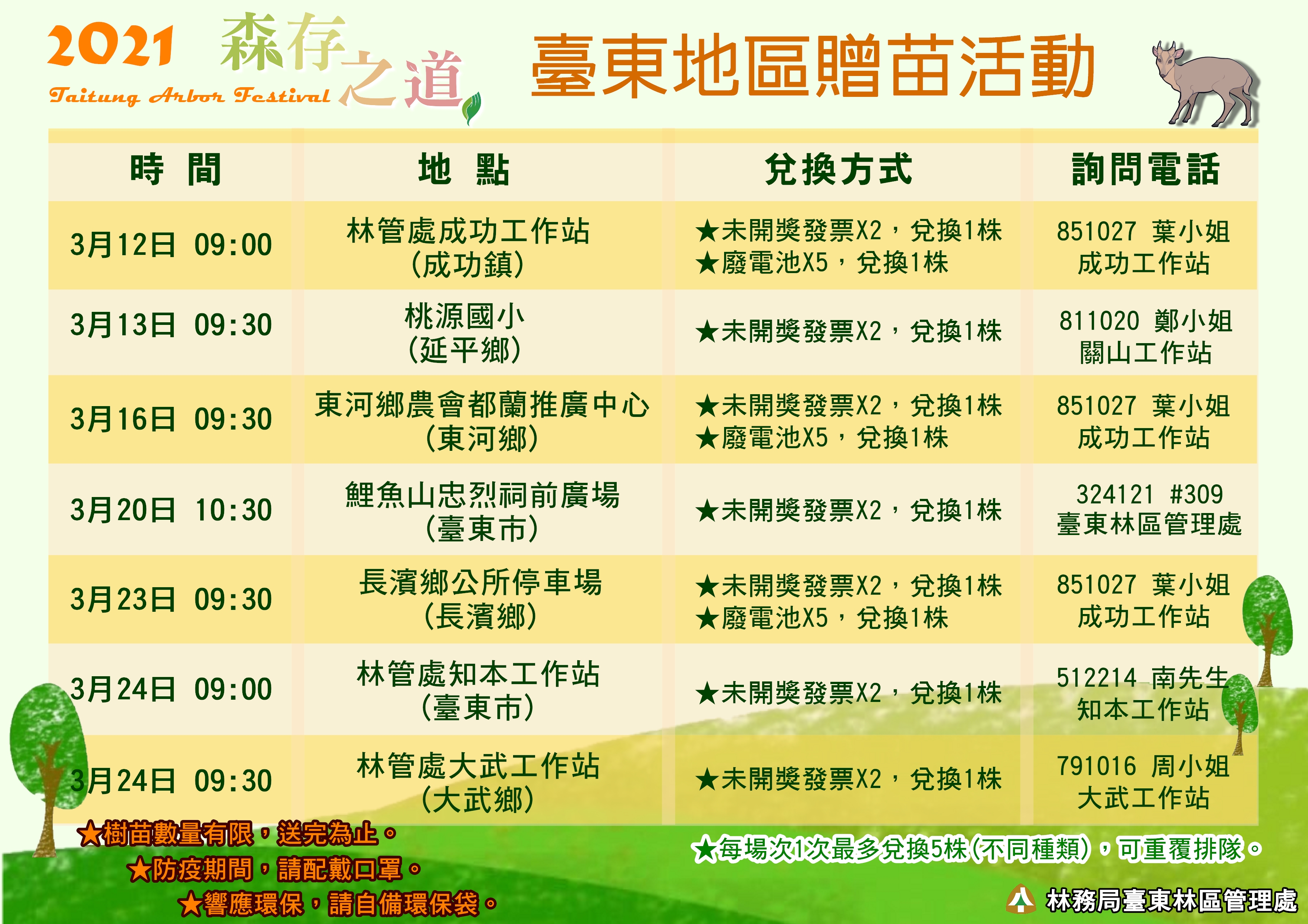 贈苗活動將於當日早上10時30分接續開始,地點在鯉魚山忠烈祠前牌坊廣場。憑110年1-3月未開獎紙本統一發票2張,可兌換1株苗木;每人每次排隊限兌換不同種類苗木合計5株(數量有限、換完為止)。為推廣臺灣原生樹種,本次贈送的皆為臺灣原生種,灌木類的有:厚葉石斑木、都蘭山金石榴、凹葉柃木、雙花金絲桃、賽赤楠、疏脈赤楠、七里香、桃金孃、鐵冬青、臺灣赤楠、含笑、紫薇;喬木類則有:白水木、印度苦櫧、茄苳、蘭嶼羅漢松、黃連木、六翅木、毛柿、金新木薑子、象牙柿、青楓、羅氏鹽膚木及土肉桂,總計約2,500株苗木,響應環保苗木容器也更改為環保紙漿盆。民眾領苗時請自備環保提袋或容器,另響應防疫新生活運動,領苗時請載口罩。活動洽詢電話:089-324121轉309、323(請於上班時間來電)。