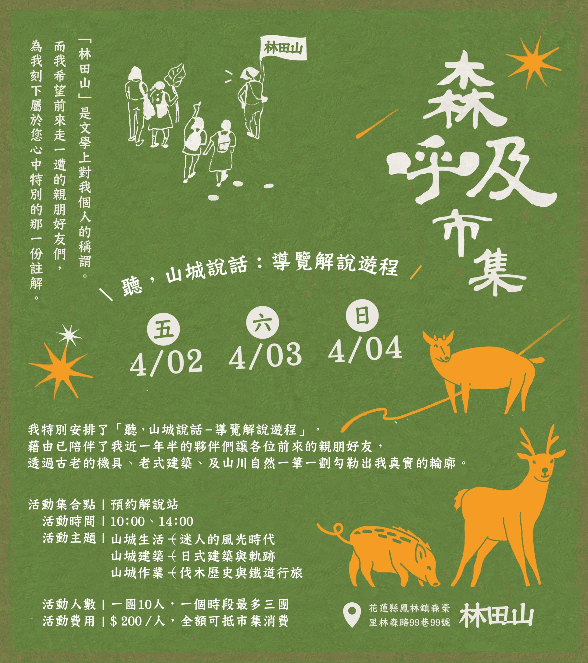 花蓮林區管理處將於4月2至4日(星期五至日)上午10時至下午4時,在林田山林業文化園區舉辦「林田山森呼吸連假市集」,結合在地特色攤商、山城導覽、手作體驗和舞團表演,邀請大家清明連假來感受林田山豐富的人文風情。 本次山城導覽特別規劃3種主題介紹:山城生活-迷人的風光時代、山城建築-日式建築與軌跡和山城作業-伐木歷史與鐵道行旅,3天共開放15場次,導覽費用200元皆可抵市集消費,名額有限,歡迎大家報名參加。 除了精彩的山城導覽和好吃好買的市集活動外,林管處還邀請在地舞團帶來精彩的表演,讓大家在連假期間,可以徜徉在林田山林業文化園區中好好森呼吸! 為鼓勵民眾從事戶外活動並響應防疫新生活運動,林管處歡迎遊客來到全國唯一登記在文資法裡,以「林業聚落」為特色的文化園區,感受百年林業生活,釋放防疫期間緊繃的身心靈,重拾健康新生活。詳細資訊請上林田山林業文化園區臉書專頁查詢,或電張小姐(0937-796149)、楊先生(0905-732708)。