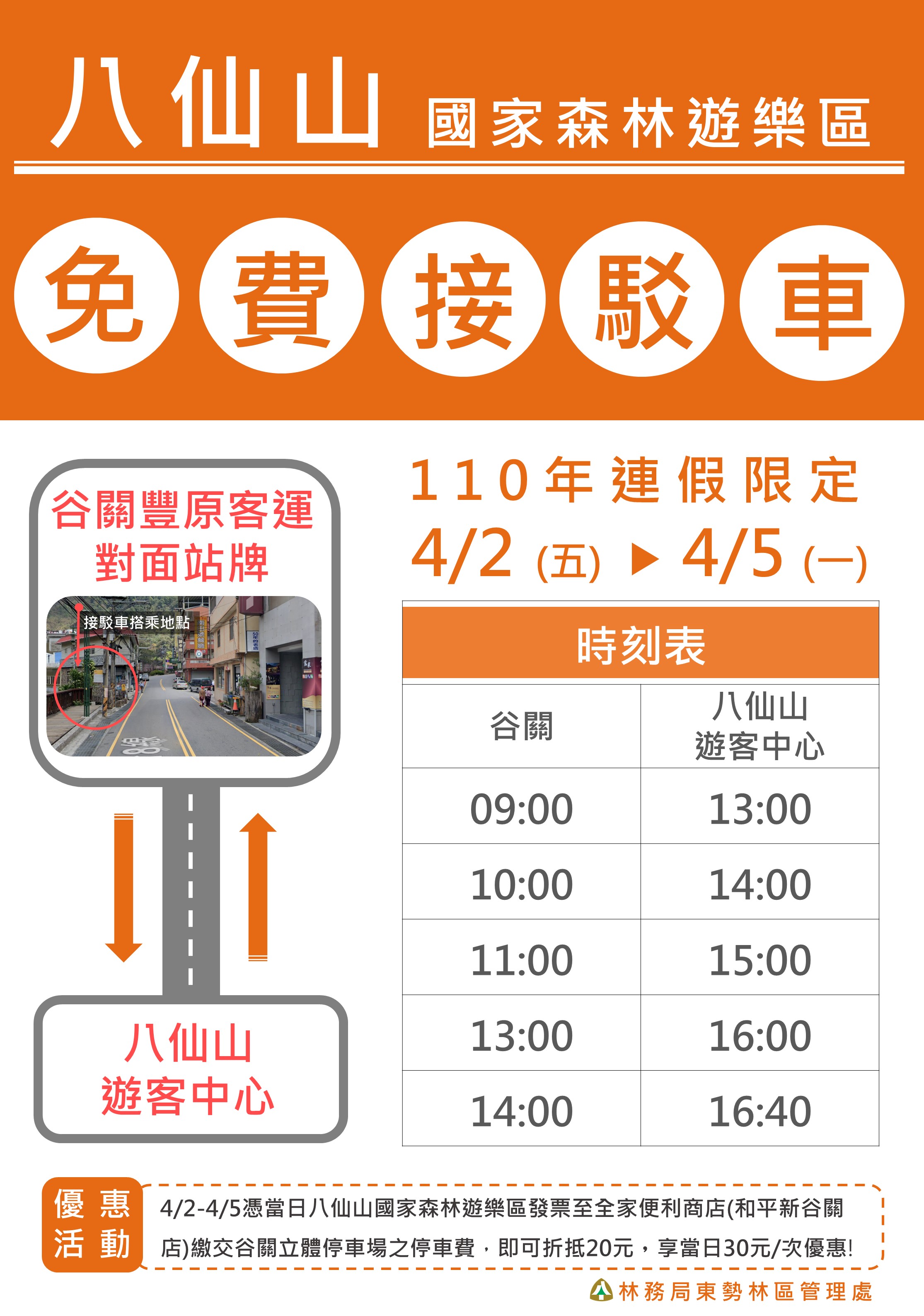 大、小朋友們還沉浸在動物森友會嗎?防疫期間除了在家玩動物森友會以外,更適合在開放空間享受森林浴及芬多精喔!八仙山帶你進入真正的動物森林享受滿滿芬多精與負離子。八仙山國家森林遊樂區是您中部最佳踏青景點,為因應遊客的需求,今年清明節連假提供免費接駁車。 八仙山國家森林遊樂區4月2日至4月5日提供12歲以下兒童免費入園,並且早上九點至下午四點四十分提供免費接駁巴士,從豐原客運谷關站(明高溫泉養生會館對面)至八仙山收費站,遊客下車購票後即可搭乘園區內接駁車至八仙山遊客中心,凡持有八仙山國家森林遊樂區入園發票,可於谷關立體停車場旁全家便利商店繳費折抵20元停車費優惠,請遊客多多利用! 八仙山國家森林遊樂區正值春意盎然,歡迎闔家蒞臨八仙山國家森林遊樂區一起森林浴,區內設有小木屋住宿及餐飲服務,訂房、餐請洽台中商旅八仙山莊:04-25950266。園區旅遊資訊請洽八仙山國家森林遊樂區遊客中心:04-25951214。