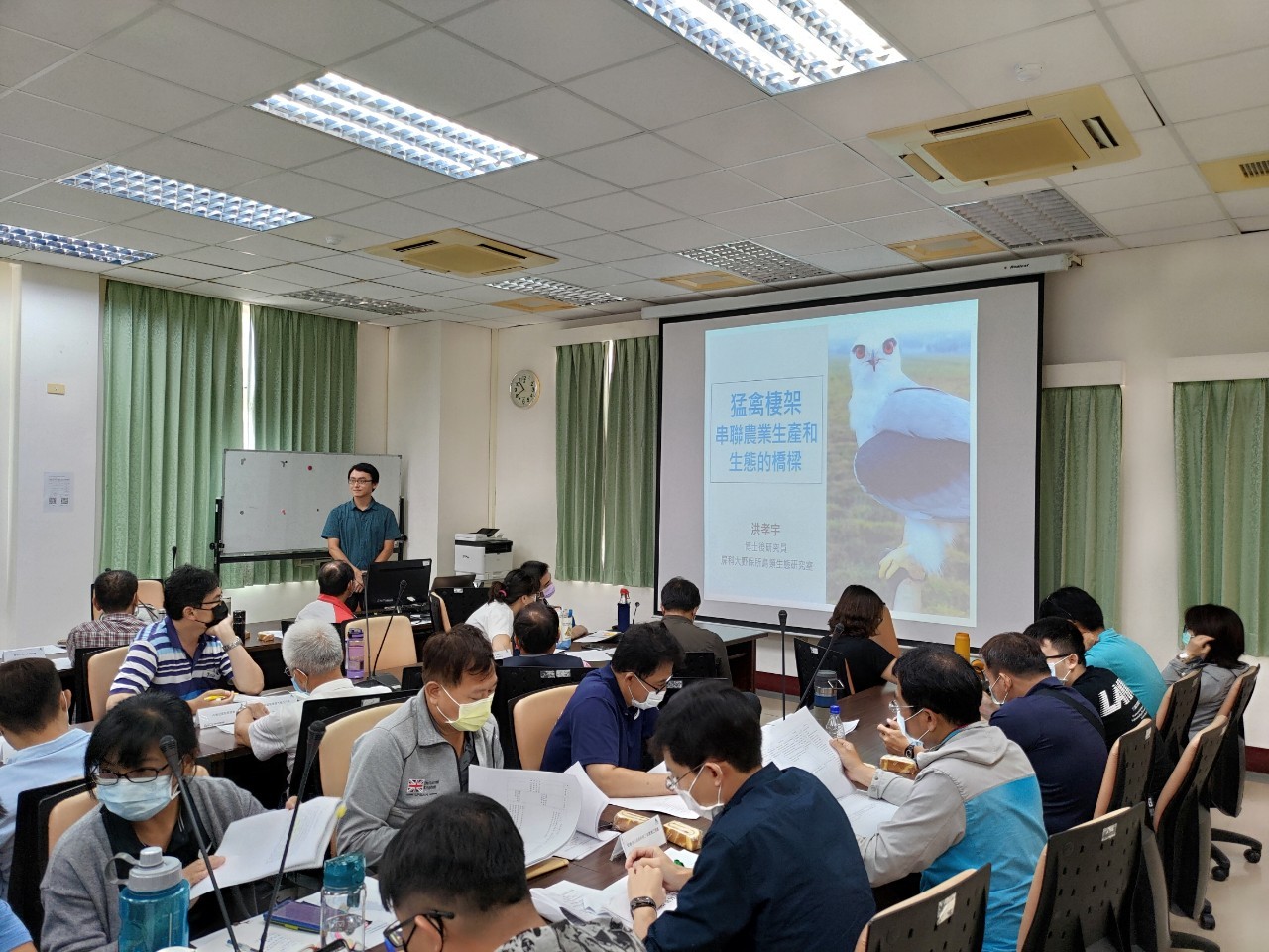 其次,是國立屏東科技大學野保所鳥類生態研究室洪孝宇博士分享「猛禽棲架-串聯農業生產和生態的橋樑」,在試驗田區架設棲架成功拍攝到黑翅鳶與草鴞等9種猛禽及其他鳥類使用棲架及捕食老鼠、昆蟲的大量影像資料,讓農民和與會的夥伴非常有感,證明田區真的有猛禽,可以協助農民抓蟲捕鼠,兼及對生態農業有正向影響。