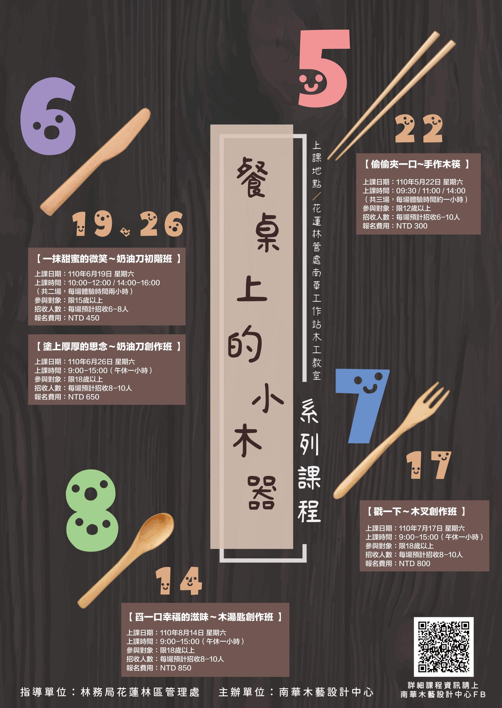 環保意識抬頭,隨身攜帶環保餐具,才是真時尚表現!花蓮林區管理處為提倡環保、推廣國產材,5至8月將開辦「餐桌上的小木器」木工班系列課程,讓民眾親手製作木筷、奶油刀、木叉、木湯匙等常用食器,小班制教學,適合未曾接觸過木工的民眾學習,名額有限,歡迎十二歲以上對木工有興趣者踴躍報名,為自己「訂作一個它」! 林管處表示,初階班為木筷及奶油刀的基礎班,教導學員認識木材及熟悉木工基本工具操作;進階班則為奶油刀、木叉及木湯匙創作班,可自己設計餐具造型,再運用課程學習的木工技法創作,慢慢刻畫、細細磨出滑順的線條,製作獨一無二的木作餐具。 課程自即日起受理報名,上課地點為林管處南華林業園區木藝設計中心,相關課程訊息及報名方式,請至南華木藝設計中心臉書粉絲專頁查看,或電洽0963-330-062李小姐。