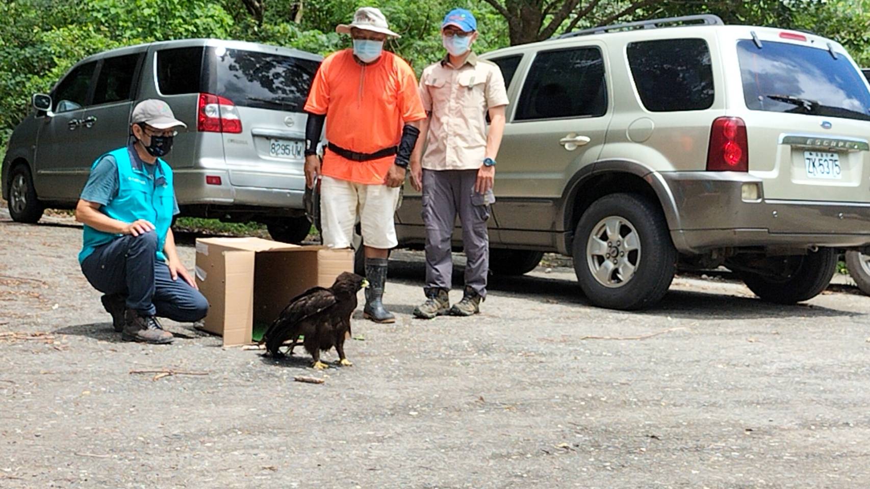 今年7月6日屏東林區管理處王姓森林護管員在恆春半島的國有林班地,發現一隻無法飛行僅能在地面跳躍的林鵰,立即出手救援並通報屏東縣政府,隨後縣政府聯繫屏東科技大學鳥類生態研究室協助將林鵰後送,由屏科大保育類野生動物收容中心救護照養。在將近一個半月的細心照料下,林鵰已調養好身體,經評估符合野放標準,8月26日在屏東林區管處、社區理事長陳志憲與屏科大保育類野生動物收容中心人員的共同見證下,順利重返野外。 當初林鵰後送野生動物收容中心時,獸醫師診斷林鵰沒有外傷,可能因林鵰獵捕技能不良導致營養不足,因此失去飛行能力,且身形相當消瘦又有貧血症狀,經DNA鑑定是一隻母鳥。在將近一個半月的細心照料下,林鵰已恢復活力,原本消瘦的體態也豐腴起來,在飛行訓練籠內的飛行表現極佳,也可自行獵食鵪鶉,獸醫師評估已符合野放標準,考量原地保育原則,而選定將這隻林鵰於原來發現牠的恆春半島山區野放。 野放當天,相關人員將林鵰帶回當初發現牠的地點附近,打開箱子後,林鵰一時之間好像有點不太習慣,左顧右盼了好一會都沒有動作,直到旁邊的人輕輕幫牠鼓鼓掌,牠才開始振翅高飛,一下子就消失在恆春半島的森林中。林管處人員心中雖然不捨,但也為林鵰能重返山林感到開心,希望將來日常巡護的過程中,能在山林中再度與健康的牠巧遇。 獸醫師表示,野放評估的5大準則包含運動能力、躲藏能力、覓食能力、天敵辨識能力及對人有無親近反應,通過評估的林鵰就可以踏上返家之路,使牠在最佳的狀態下被野放,提高牠們在野外的生存能力。而屏科大收容中心已將林鵰裝設發報器,後續透過發報器訊號,將可瞭解林鵰野放後的存活狀況及活動範圍等資訊。 屏東林區管理處恆春工作站洪寶林主任與屏科大收容中心人員呼籲,救援動物時,要以減少動物不必要的痛苦為最大準則,並小心自身安全。拾獲野生動物時,因多數民眾對於野生動物的生態習性不太了解,加上受傷野生動物多帶有疾病或情緒不穩定現象,為避免危險,請民眾拾獲或發現後,可以撥打1999通報各縣市政府協助處理;倘發現非法買賣、宰殺及獵捕野生動物時,可撥打110通知當地警察機關,撥打0800-000-930通報林務局,或向保七總隊各分隊檢舉,由執法人員進行拍照或錄影存證,如違反法令將依法處理,也提醒民眾勿擅自私下處理,避免危險。 林鵰小常識: 林鵰(Ictinaetus malayensis),為台灣島內最晚被發現的留鳥猛禽,全身呈現一致的深褐色,最大翼展達180公分,堪稱島內最大的猛禽。主要分布於全島中、低海拔森林中,為珍貴稀有保育類(II級)。由於寬大的翼展優勢,林鵰擁有極佳的滯空能力,擅長於山脊稜線以及森林邊緣飄飛巡弋。以小型哺乳類、嚙齒目以及中小型鳥類幼雛和鳥蛋為食。近年來透過台灣猛禽研究會的林鵰觀察社團內鳥友的回報與交流,發現許多淺山地區開始有林鵰穩定出沒的記錄,甚至在郊區檳榔園或果園中就能見其盤旋巡弋的身影。