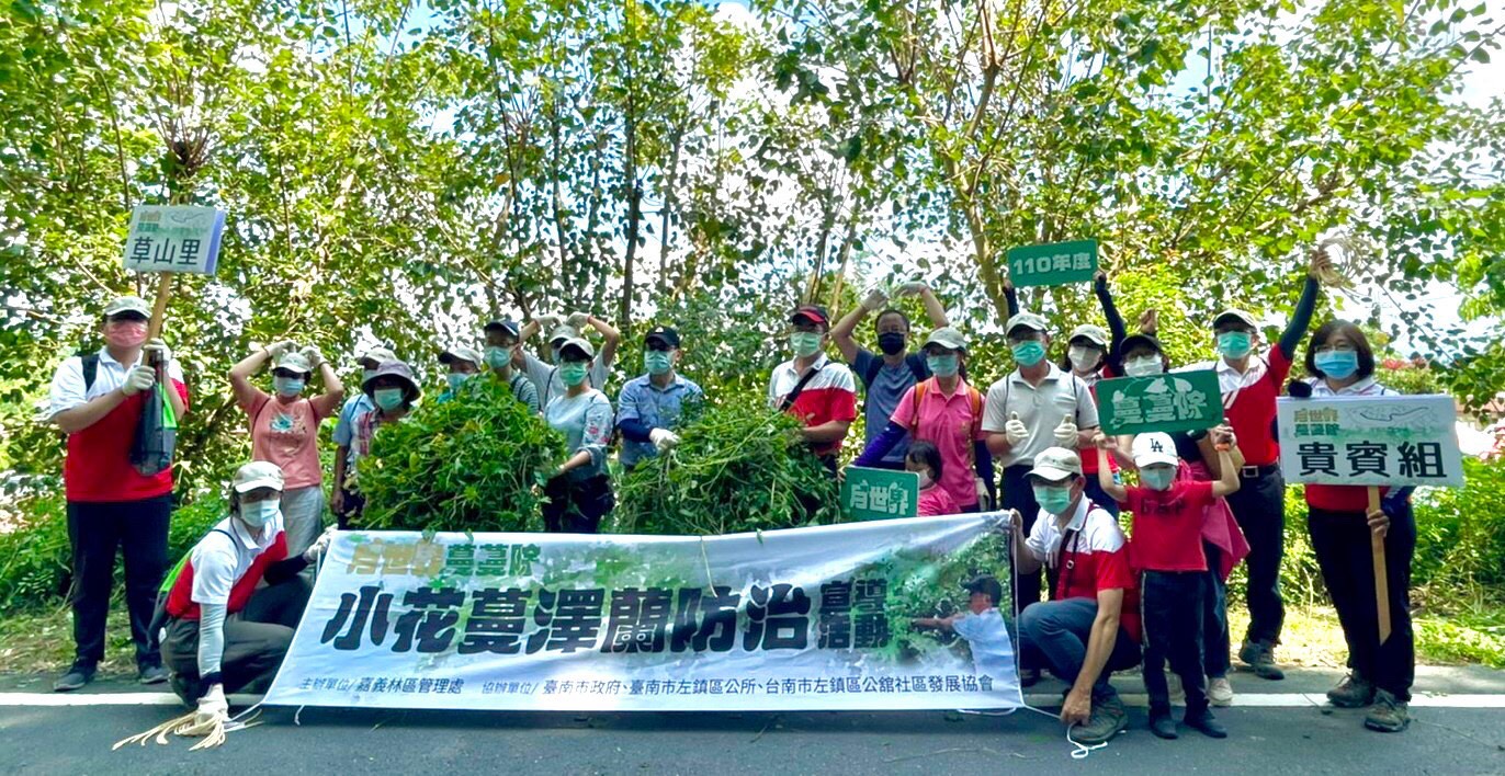 外來植物入侵種-小花蔓澤蘭嚴重影響林木生長,是林務局長期持續移除及監測的重點工作,林務局嘉義林區管理處今(4)日上午9點30分在台南市左鎮區公舘社區發展協會現址(原岡林國小)舉辦「月世界蔓蔓除」活動,由嘉義林管處處長張岱、臺南市政府農業局主任秘書吳威達、臺南市左鎮區公所區長謝松益、嘉南地區樹木保護平台機關夥伴及當地左鎮區居民共105人共同除蔓保護原生樹木,在後疫情下關心環境的社區鄉親們揮舞著汗水,移除惱人的「綠癌」,努力剷除數量高達212公斤。 嘉義林管處指出,每年8月15日至9月15日為小花蔓澤蘭防治月,9月第1個星期六是全國防治日。今(110)年選在台南市左鎮區公舘社區發展協會現址辦理小花蔓澤蘭移除活動,宣示小花蔓澤蘭防治月活動開跑。該區每年5到7月是紫斑蝶、青斑蝶、虎斑蝶及鳳蝶的重要棲息地,用除蔓實際行動可擺脫小花蔓澤蘭糾纏林木,增加蝶類生存空間。 自106年起連續4年嘉義林管處與財團法人工業技術研究院及社團法人臺灣生態材料產業發展協會,共同研究將炭化後的小花蔓澤蘭產製成香皂、防蚊液、薰香、複方栽培土等多元再利用產品,今年推出「小花蔓澤蘭炭磚」,利用小花蔓澤蘭取代稻草製成生物炭,經過選土、攪泥、日曬、脫模等製成,展現臺灣傳統土角厝的土磚工藝,並與參與捐款認養造林的企業-百冠生化科技股份有限公司所生產具臺灣味的檜木精油結合,當炭磚遇上精油是相當具實用性的擴香石。 處長張岱表示,小花蔓澤蘭種子傳播速度極快,林木經藤蔓纏繞後更是了無生機,對付綠癌要釜底抽薪連根拔除才有效,即日起至12月20日前,林務局以每公斤5元收購小花蔓澤蘭及香澤蘭,請大家一起加入除蔓賺綠金的行列,最終達到小花蔓澤蘭”清零”的目標。詳細收購地點及時間如下: 收購地點 電話 地址 備註 玉井工作站 06-5742031 臺南市玉井區玉田村中正路6號 收購時間為每週一、三、五, 上午9點至12點及下午1點至4點 觸口工作站 05-2593035 嘉義縣番路鄉新福村1鄰五虎寮16號 收購時間為每週一、三、五, 上午9點至12點及下午1點至4點