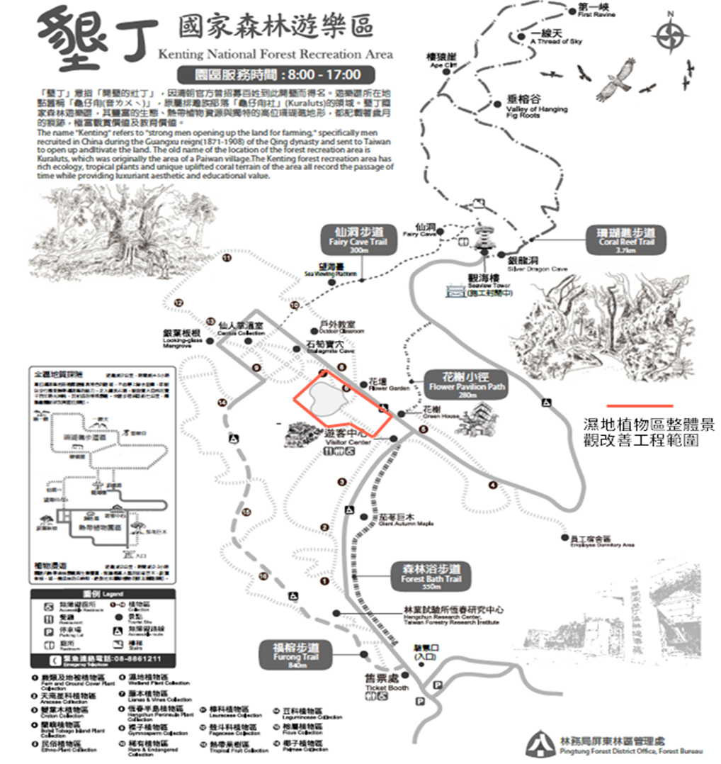 墾丁國家森林遊樂區具有獨特的高位珊瑚礁森林生態系。其擁有三面環海的半島絕景,是國人健行享受「森林浴」的好地方。 屏東林區管理處為提供遊客更好的遊憩體驗與品質,即日起至111年1月31日止進行「遊客中心周遭與濕地植物區整體景觀改善工程」,考量遊客安全,將封閉遊客中心後方連接濕地植物區部份區域,施工範圍禁止遊客進入,但不影響前往各景點步道行走。 雖然暫時無法親近濕地植物區,墾森仍擁有南台灣特有的熱帶季風林生態景觀可供遊憩,例如高位珊瑚礁林、石灰岩地形、緊嵌礁岩上的大茄苳、板根發達的銀葉樹與氣根無數的白榕等,更有秋冬來訪的候鳥,如10月的灰面鵟鷹,為遊客提供了不一樣的遊憩選擇。園區內遍佈玲瓏怪異的珊瑚礁岩,奇異天成,林相及風景均極優美,如石筍寶穴、仙洞、一線天、棲猿崖、第一峽、垂榕谷、銀龍洞等景點,非常值得遊客造訪及體驗。 更多詳細資訊可前往「台灣山林悠遊網 https://recreation.forest.gov.tw/」、墾丁國家森林遊樂區臉書粉絲專頁(https://www.facebook.com/ktforestarea/)。